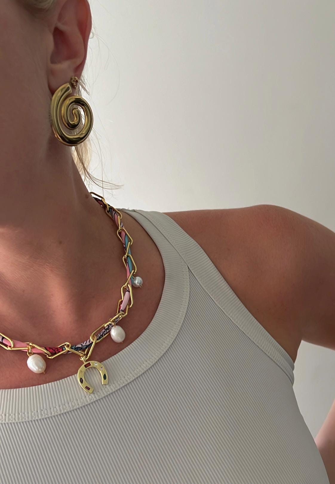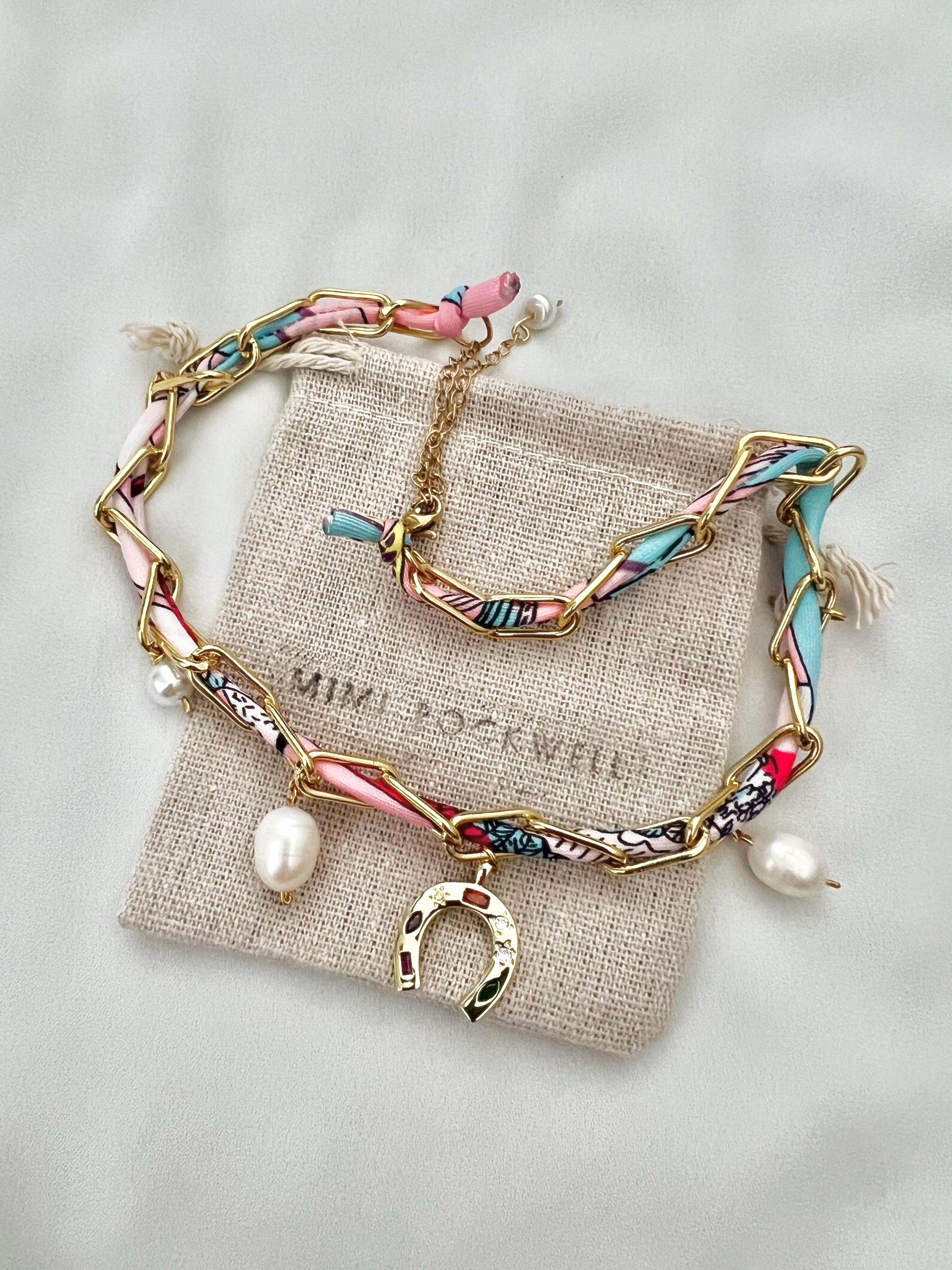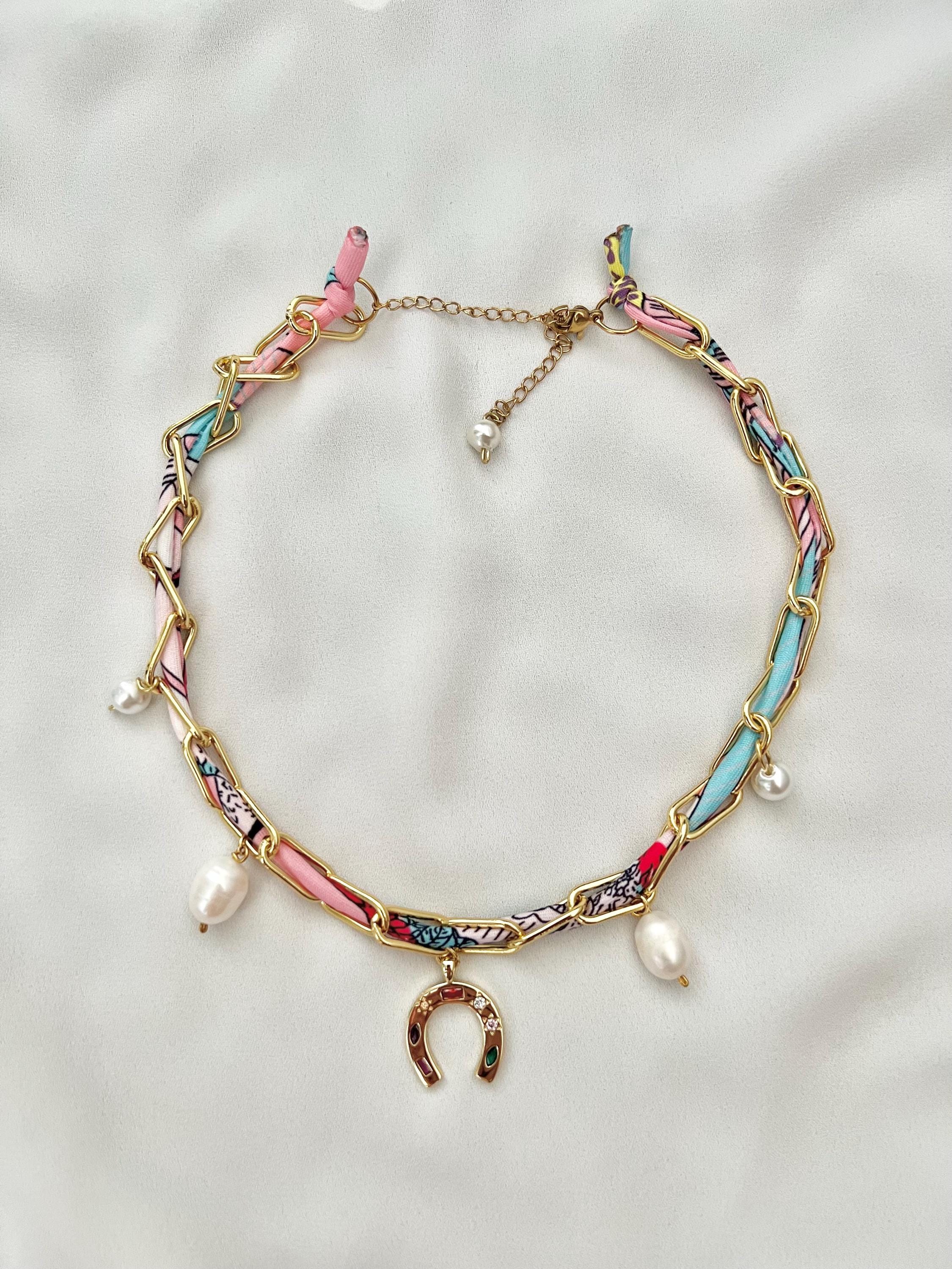 Horse shoe pendant pearl pink scarf gold chain necklace