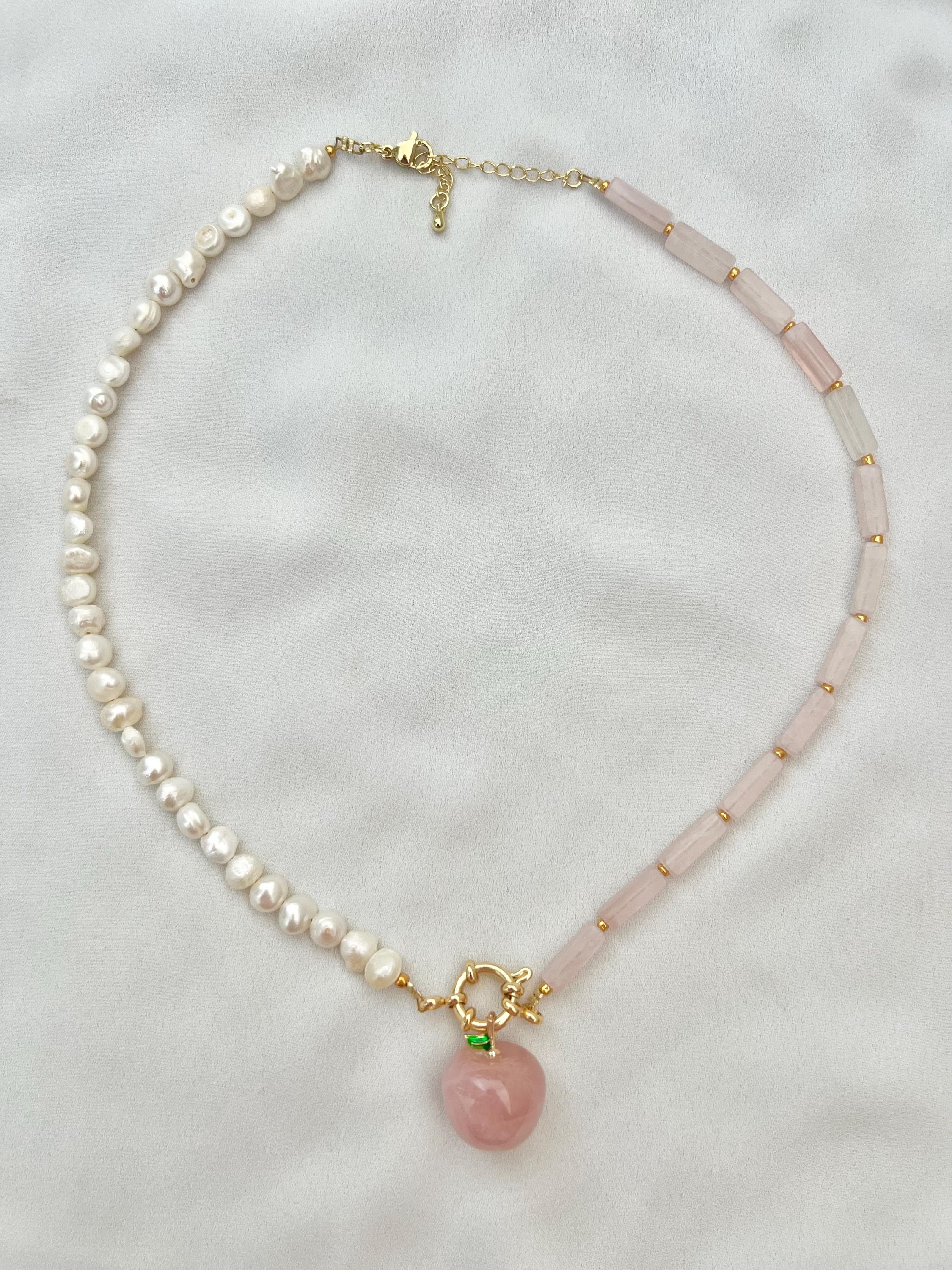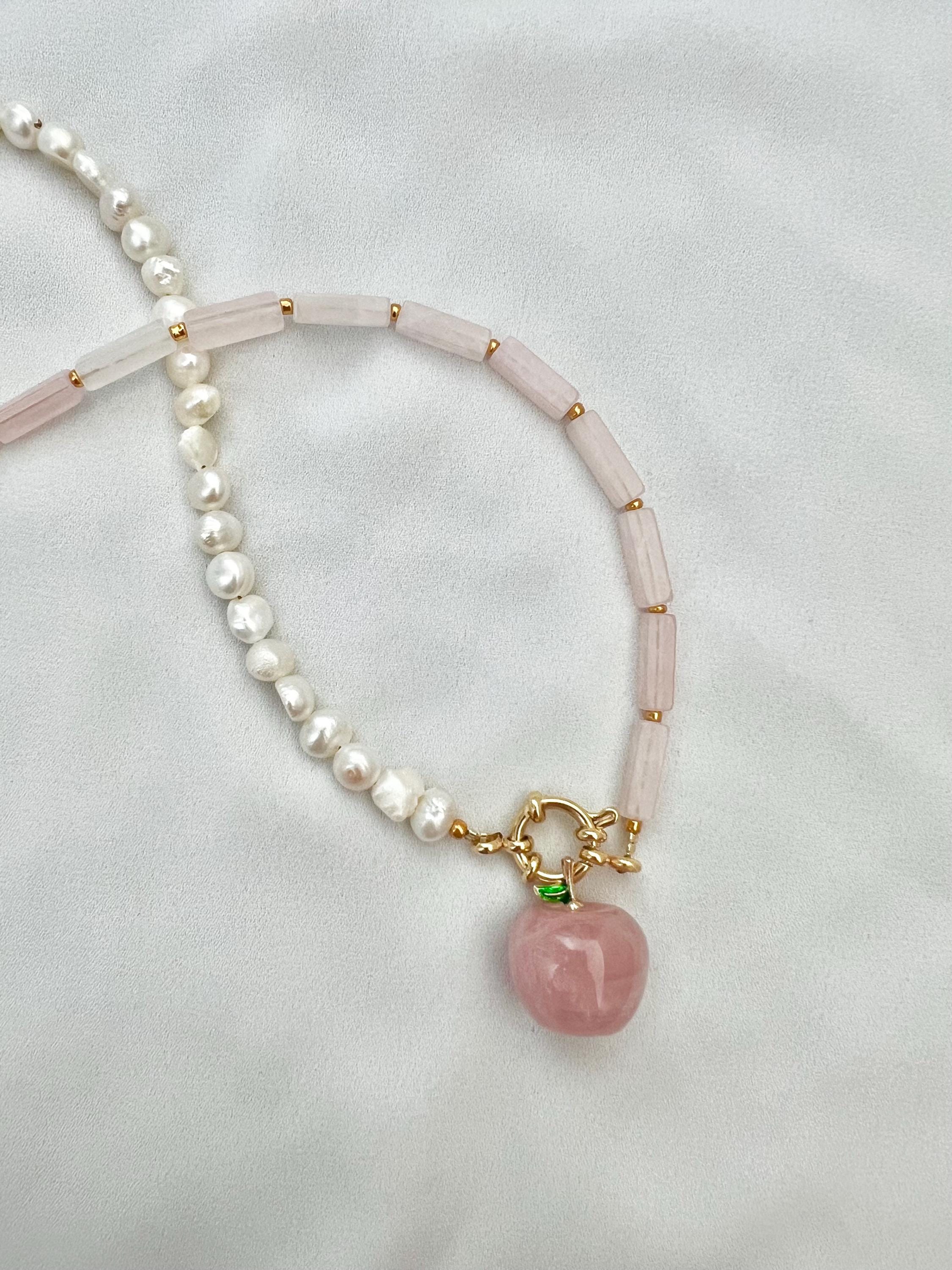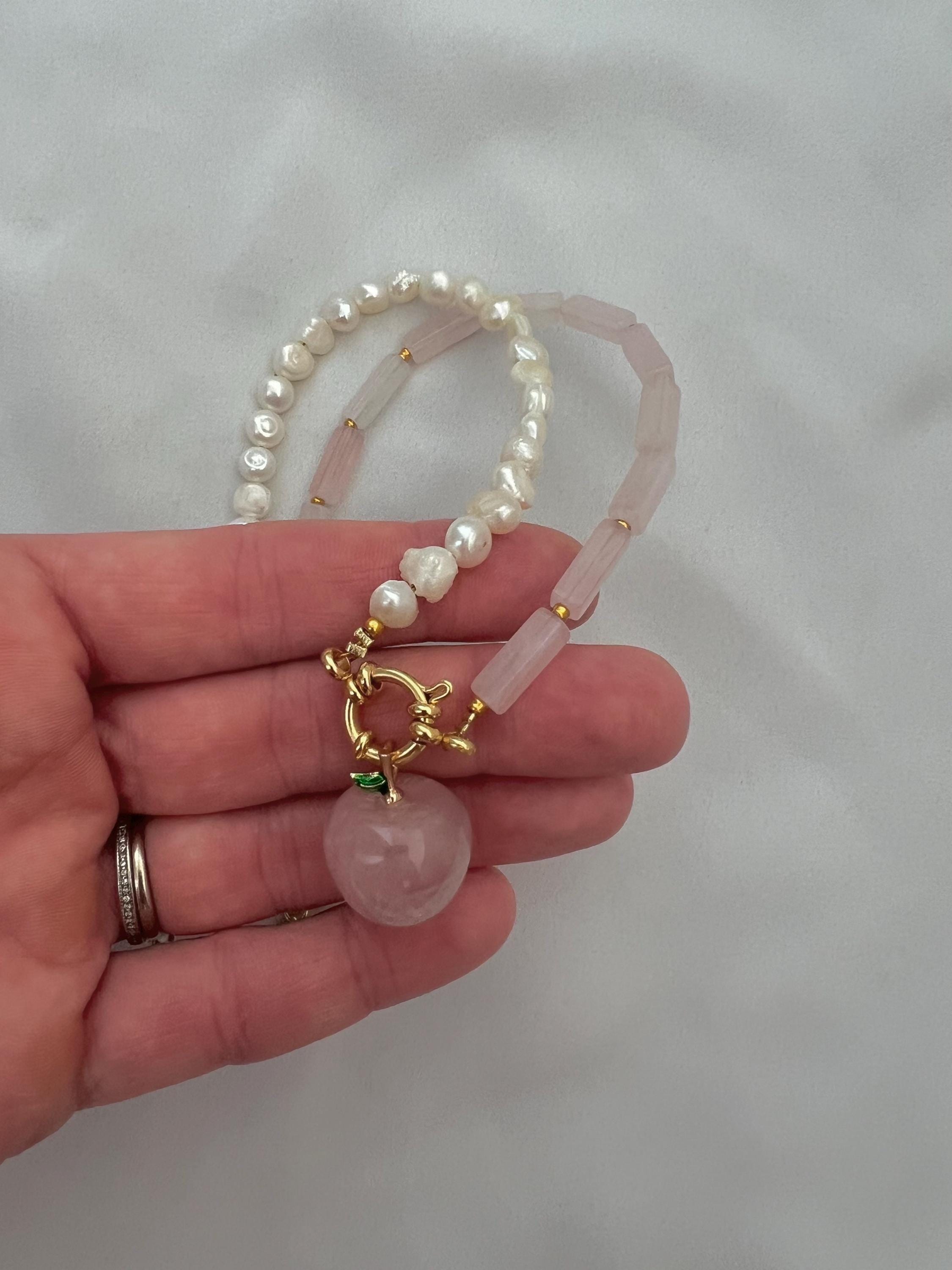 Pearl and Rose Quartz apple pendant and bead gold necklace