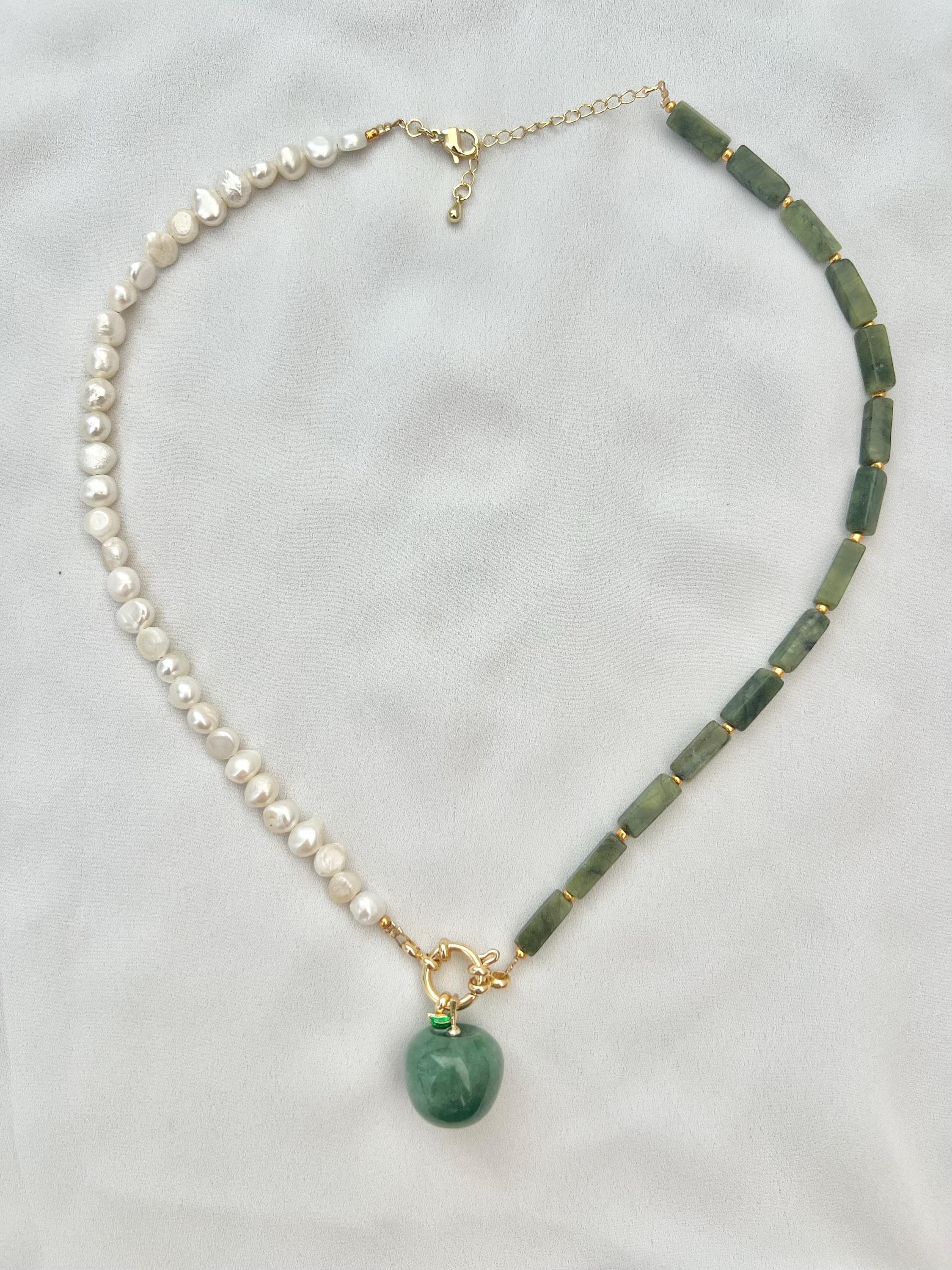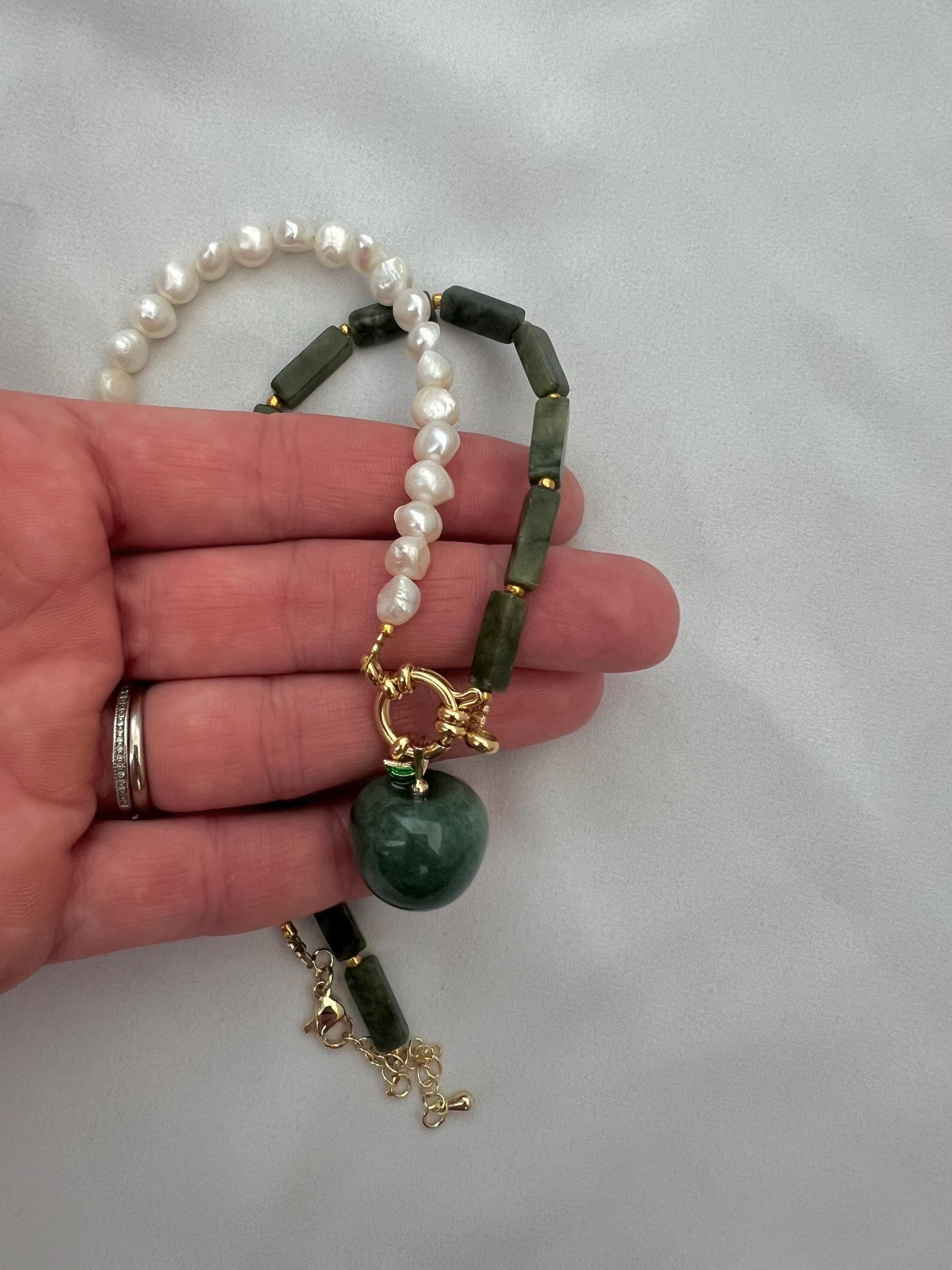 Pearl and green Canadian Jade apple pendant and bead gold necklace