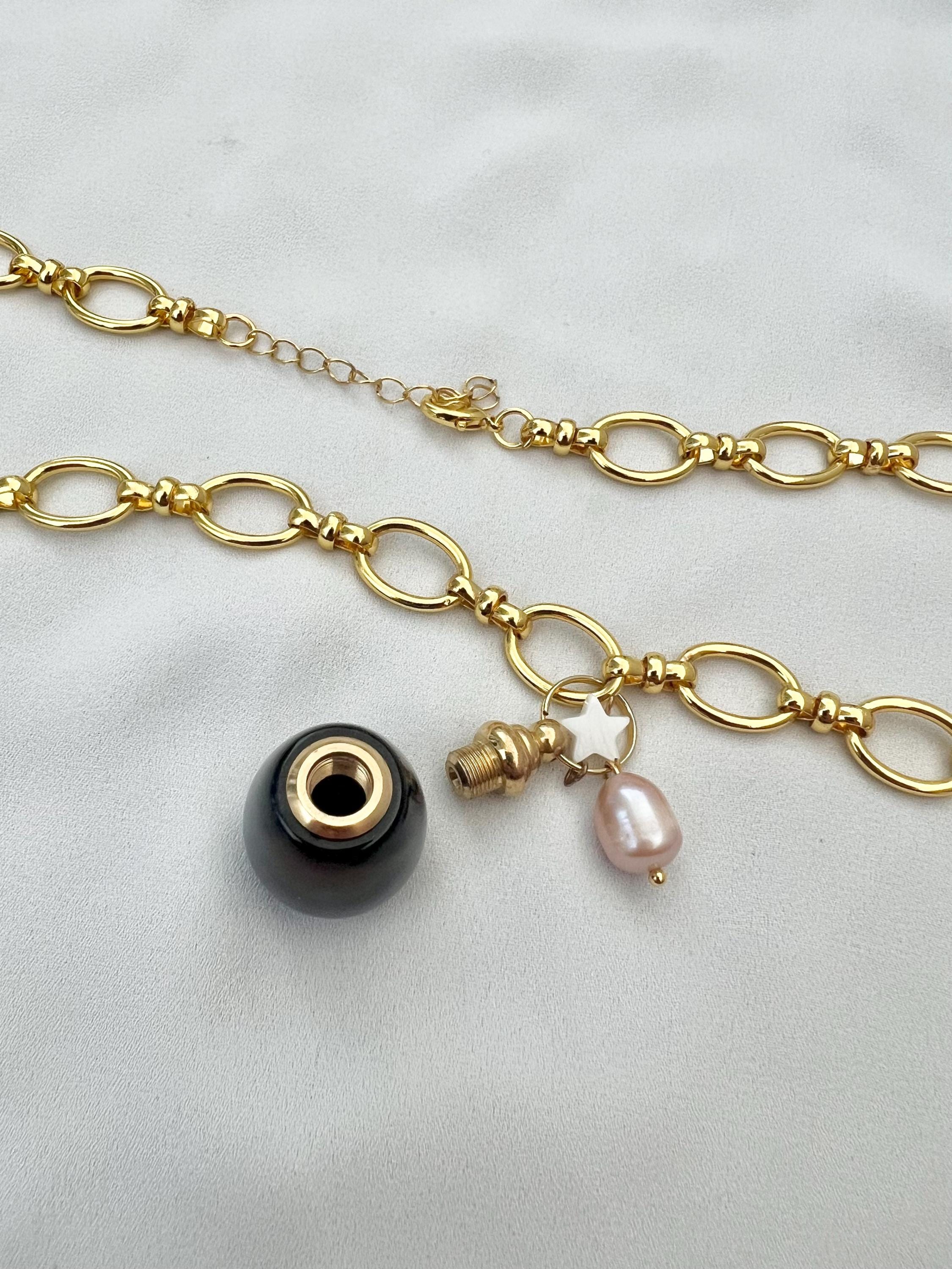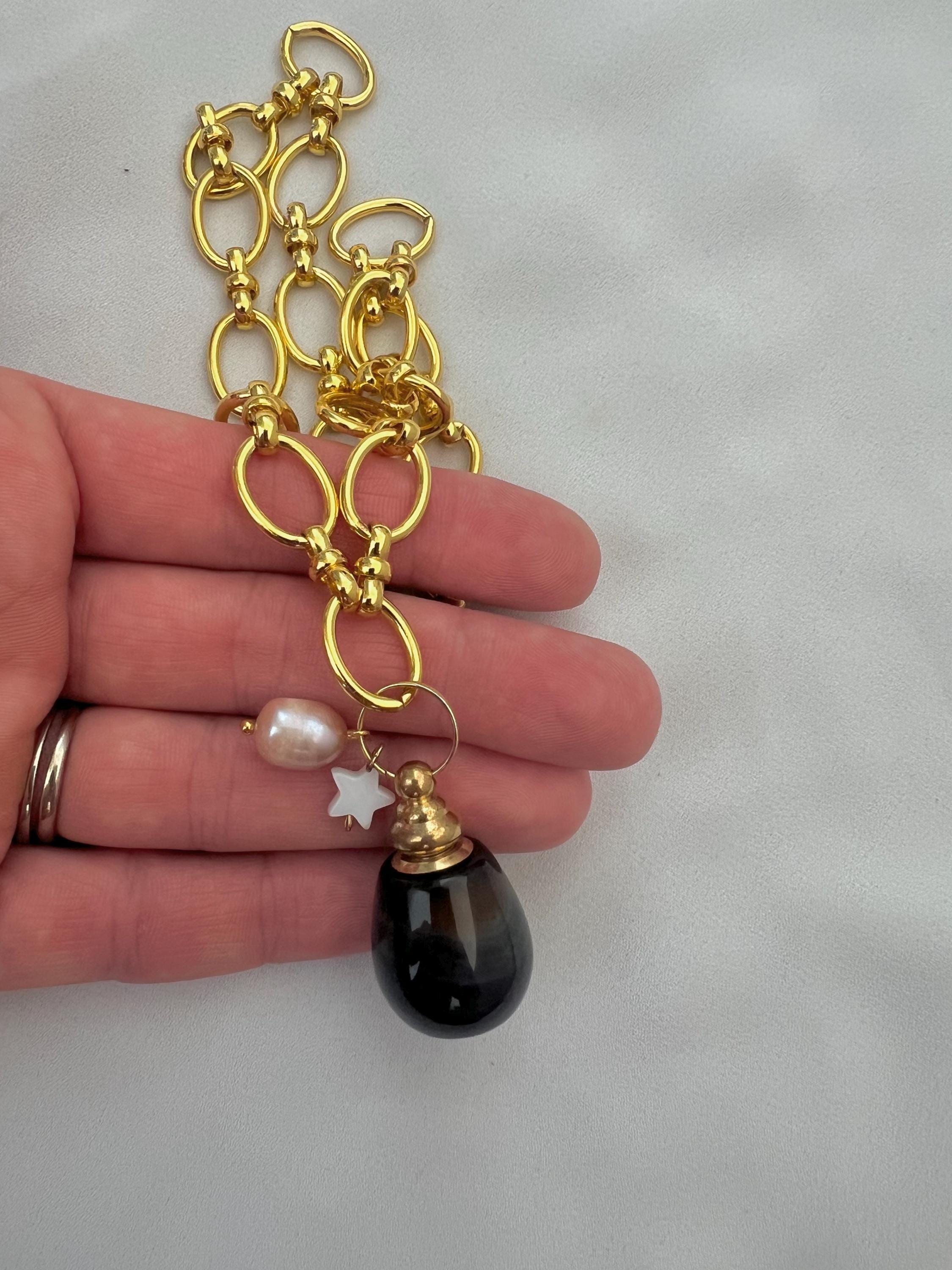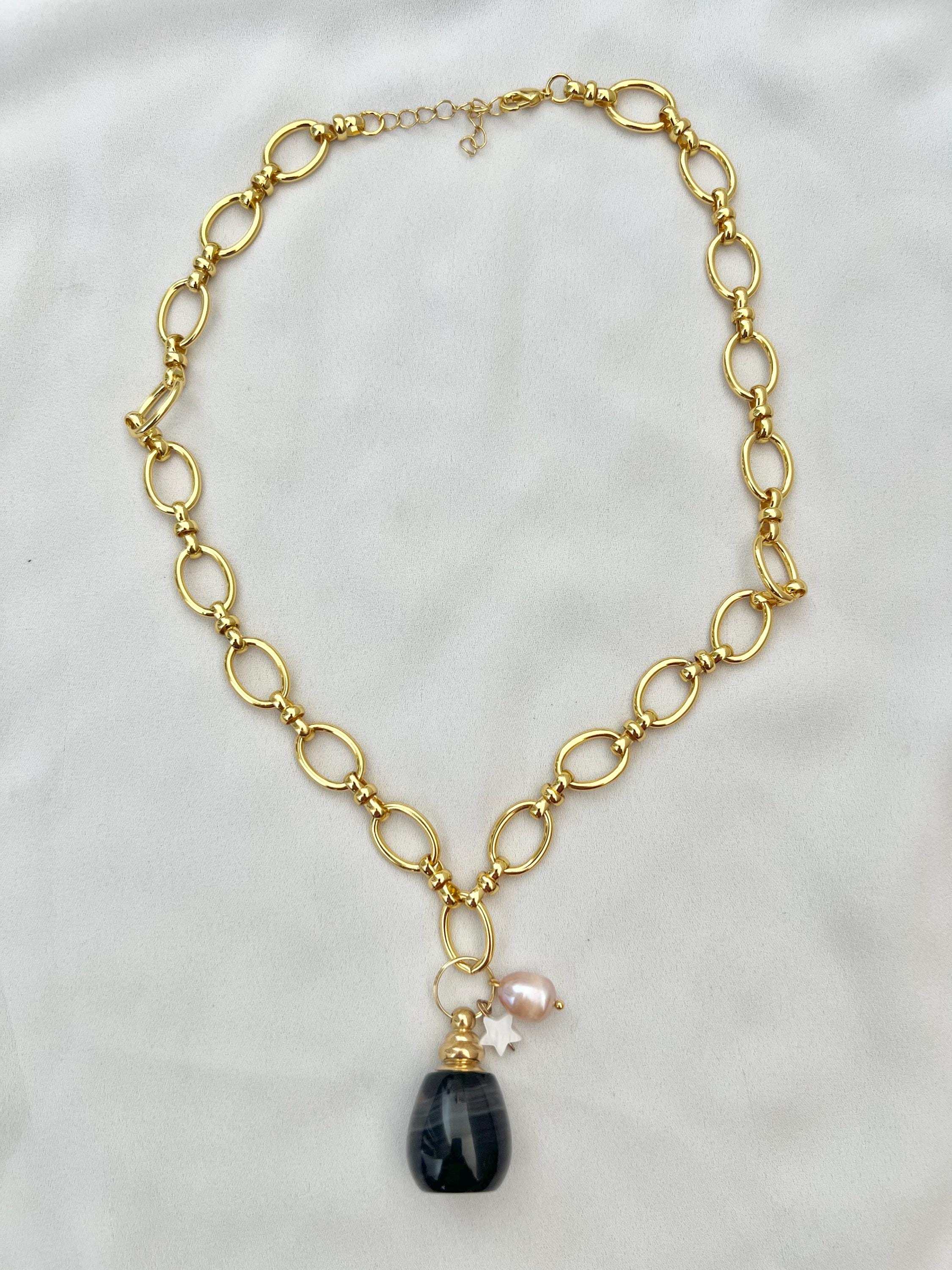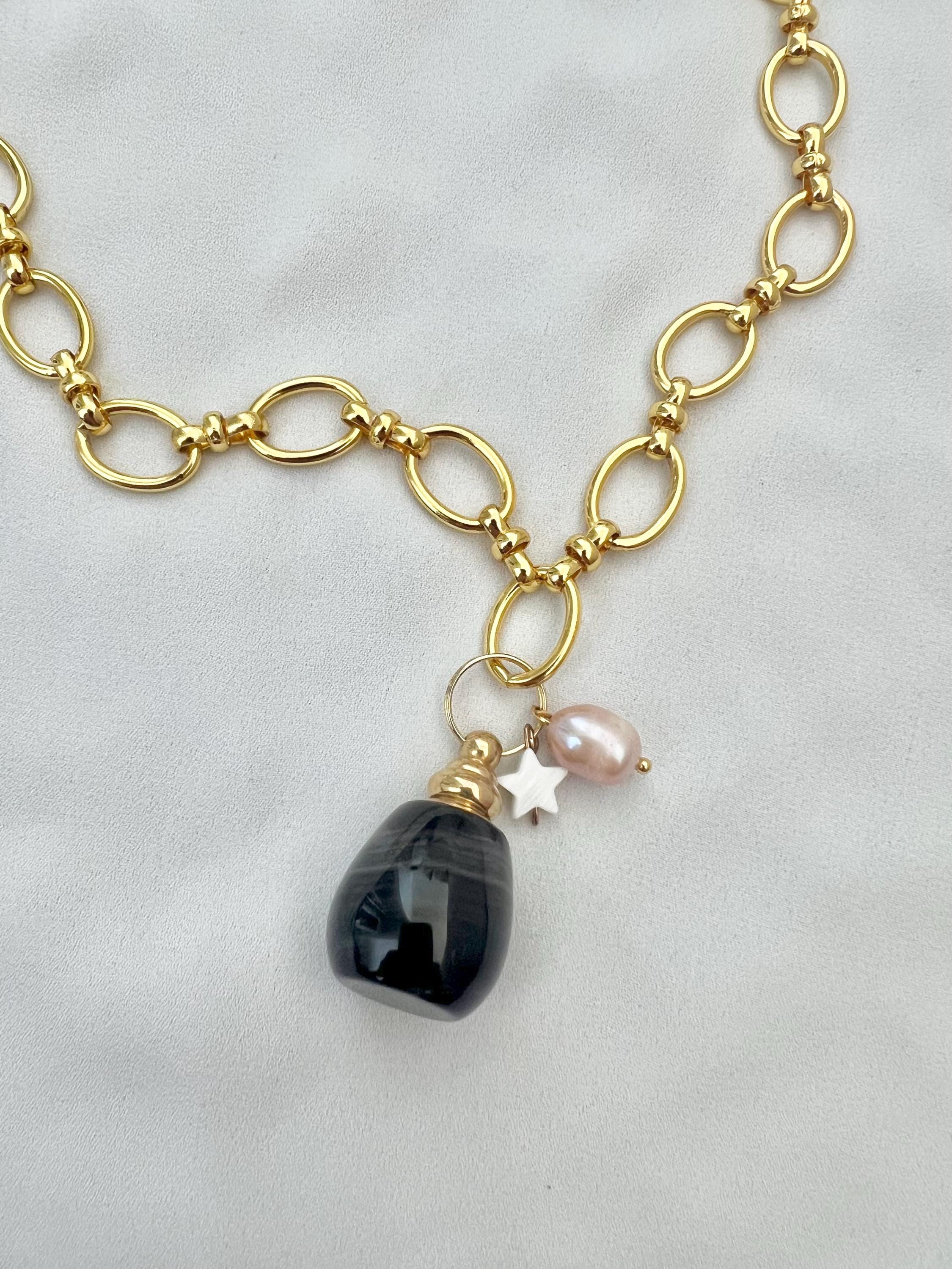 Smoky black Agate crystal stone bottle pearl large gold chain necklace