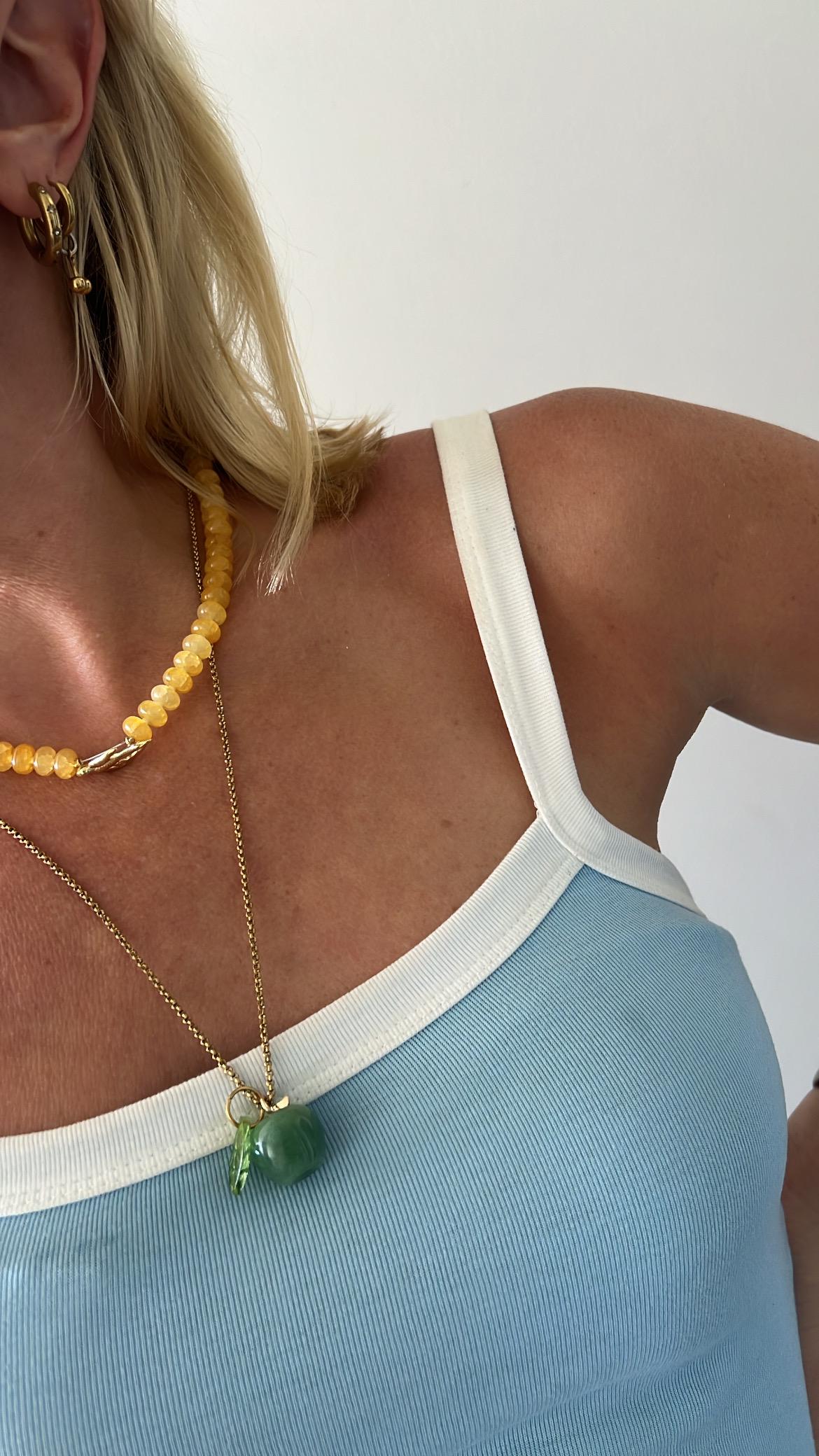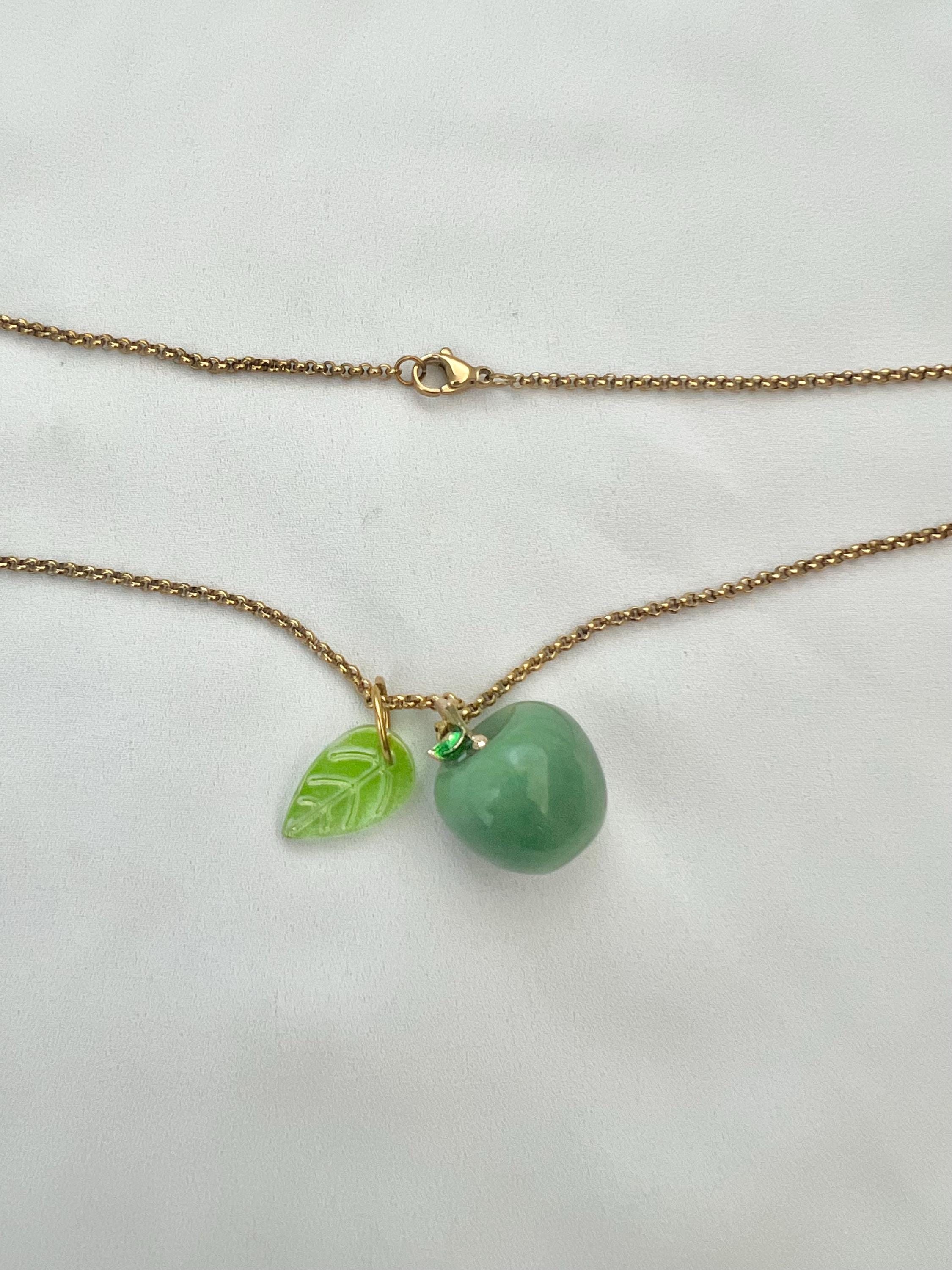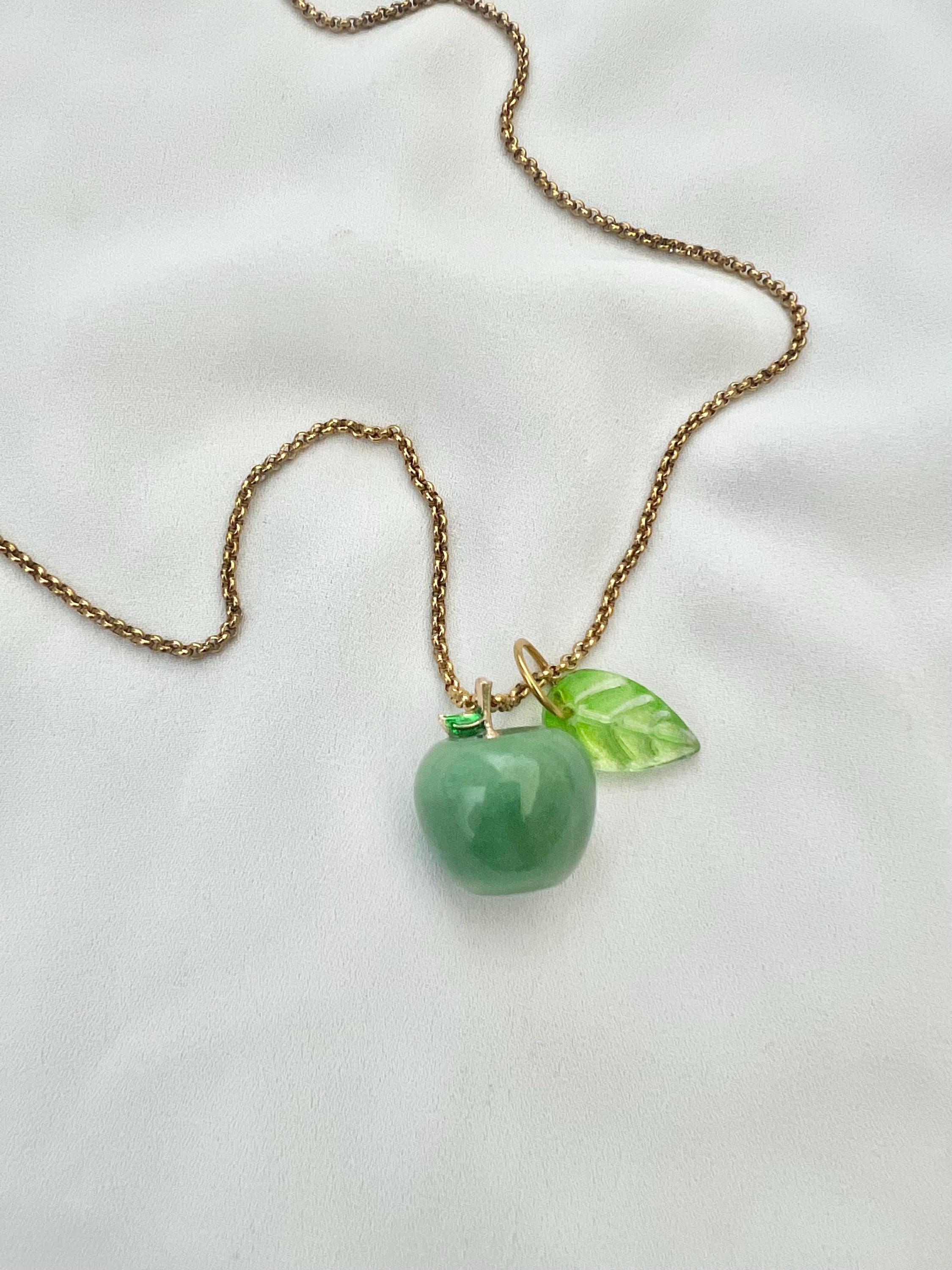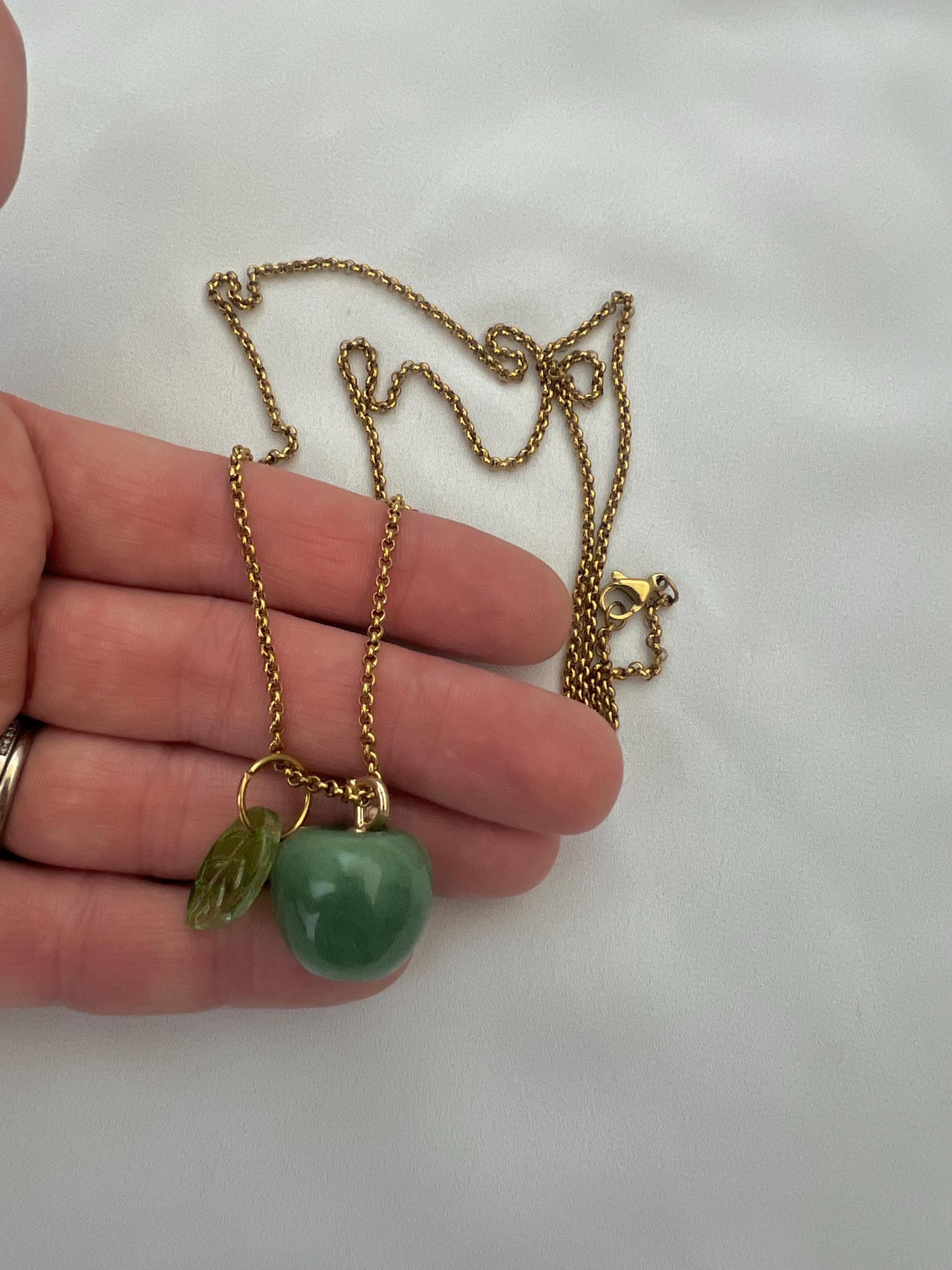 Green Aventurine crystal apple glass leaf pendant long gold chain necklace