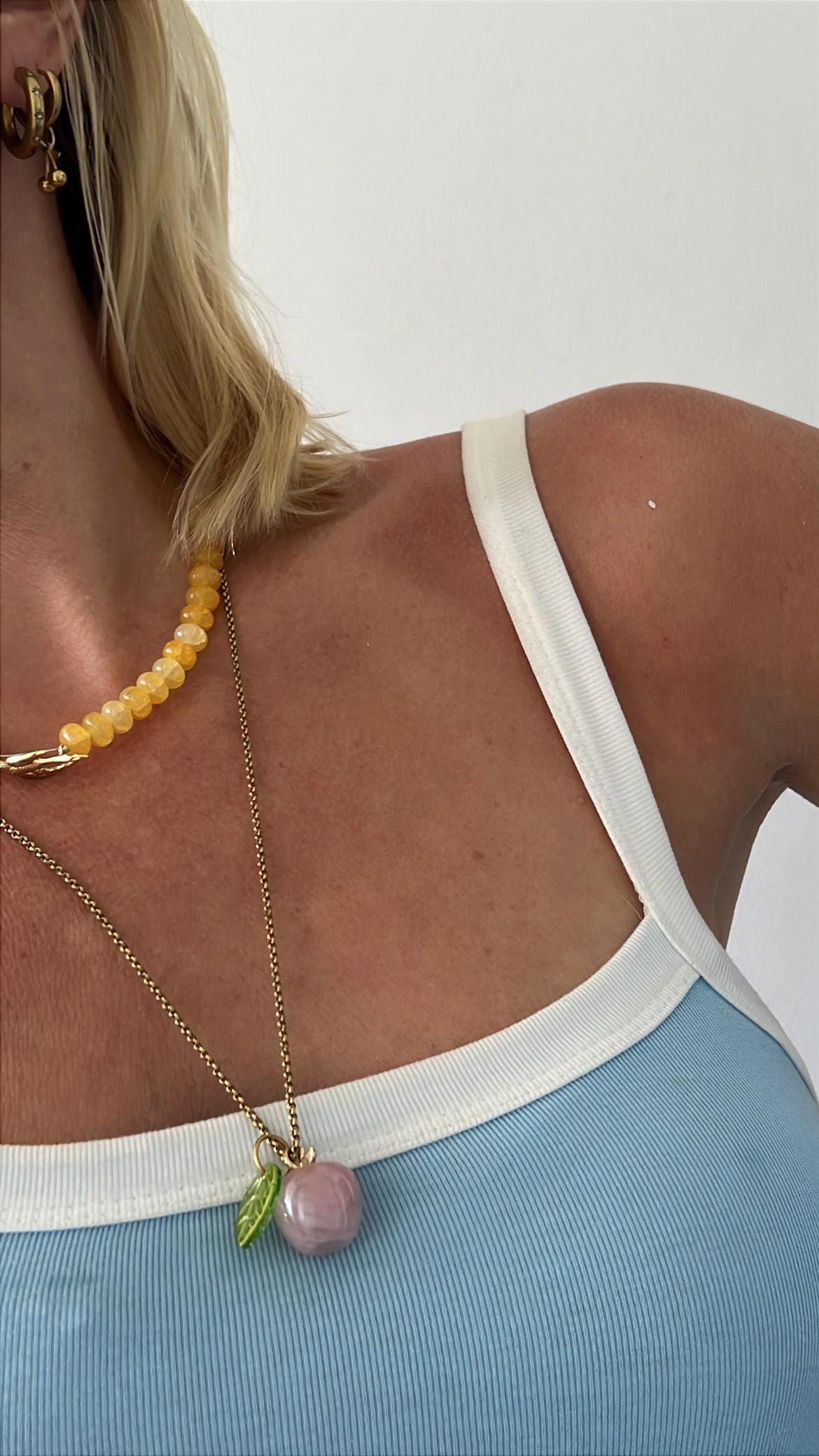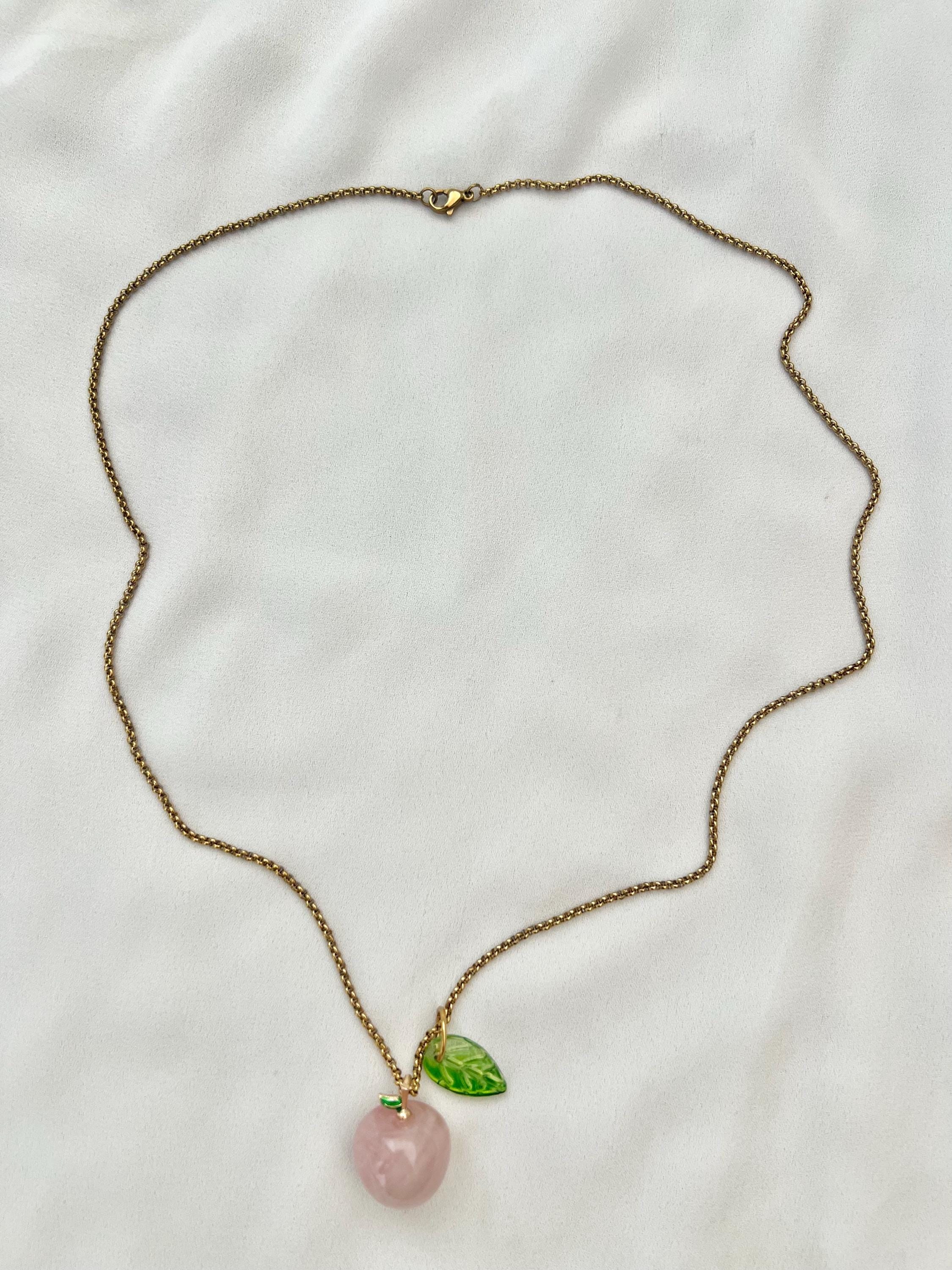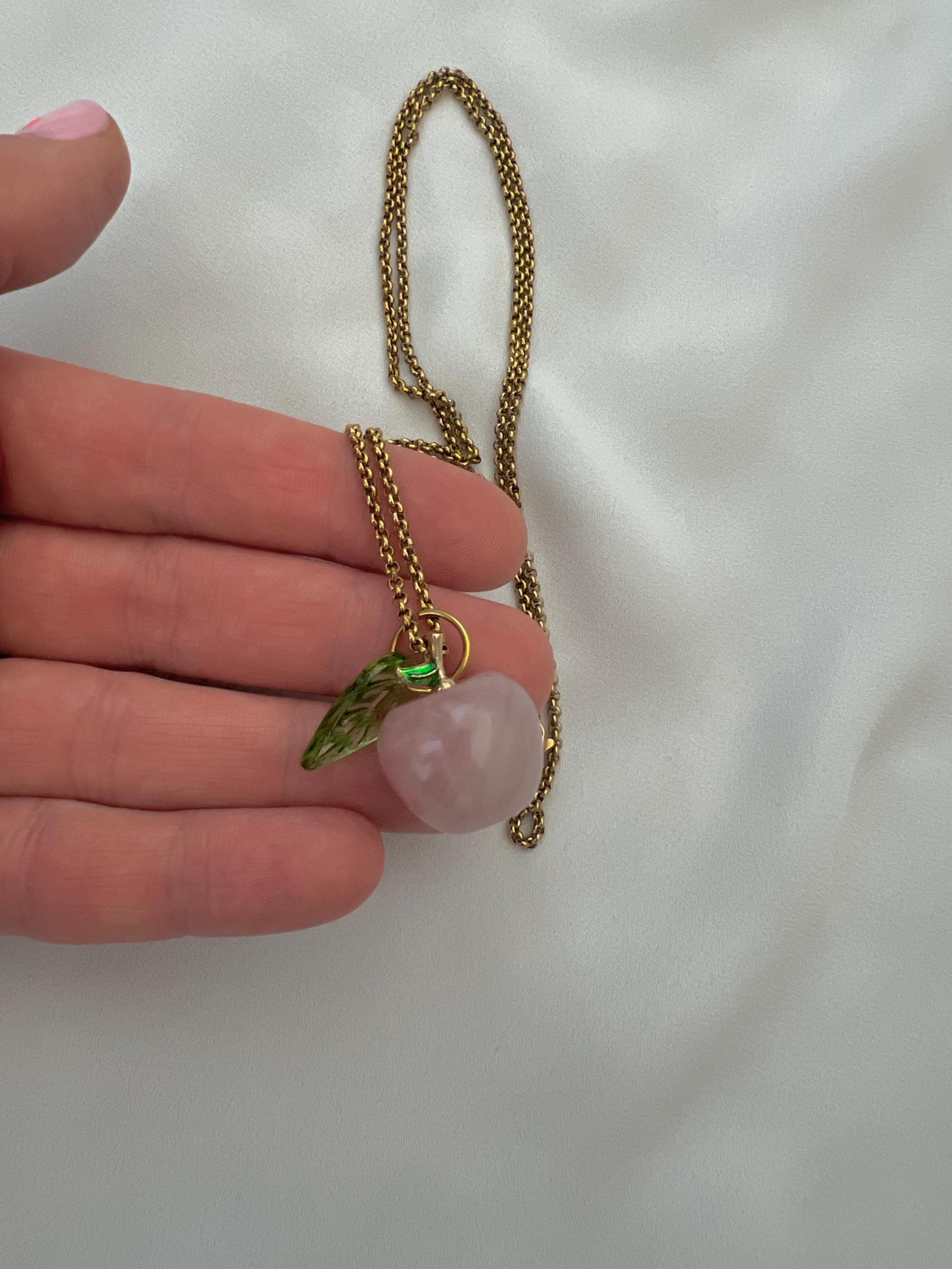 Rose Quartz crystal apple glass leaf pendant long gold chain necklace