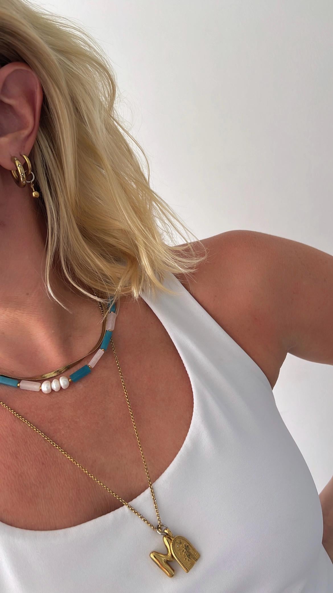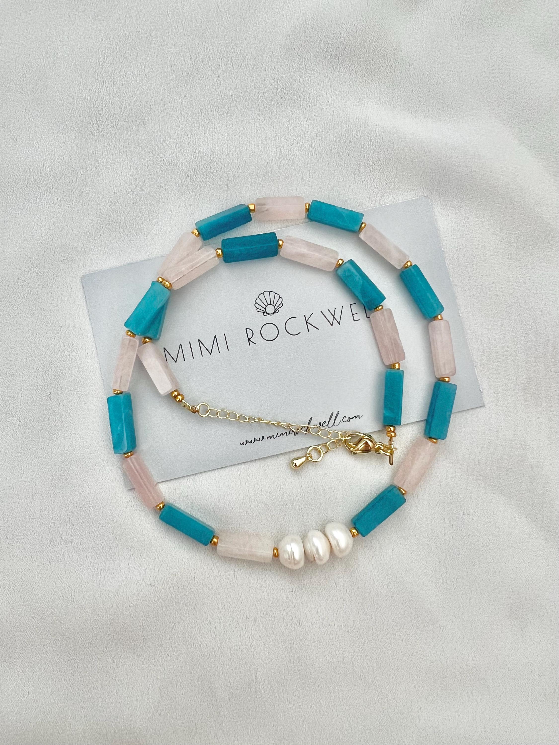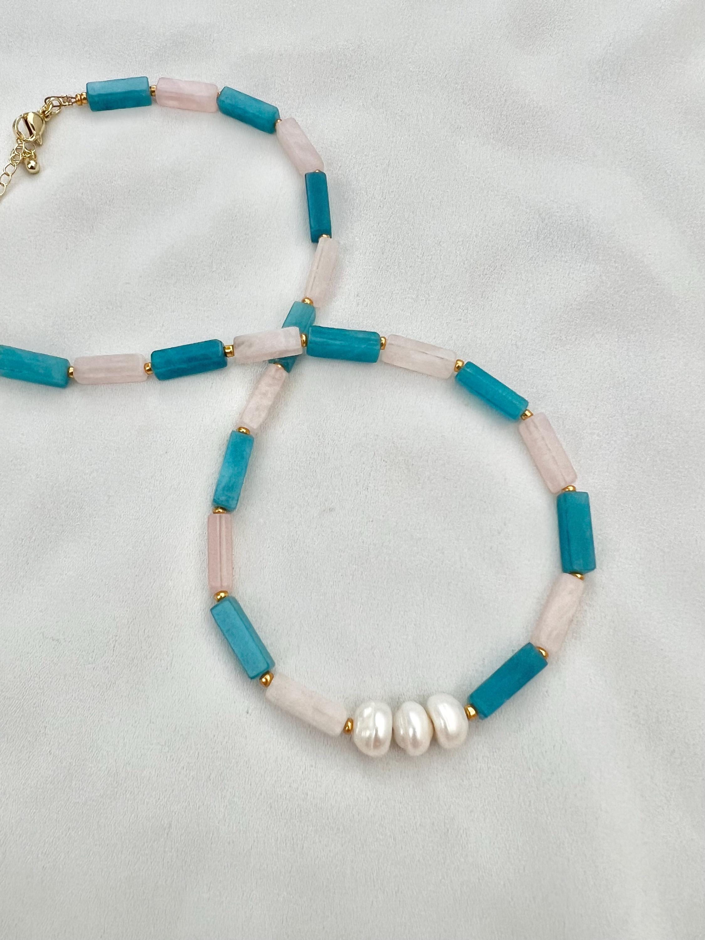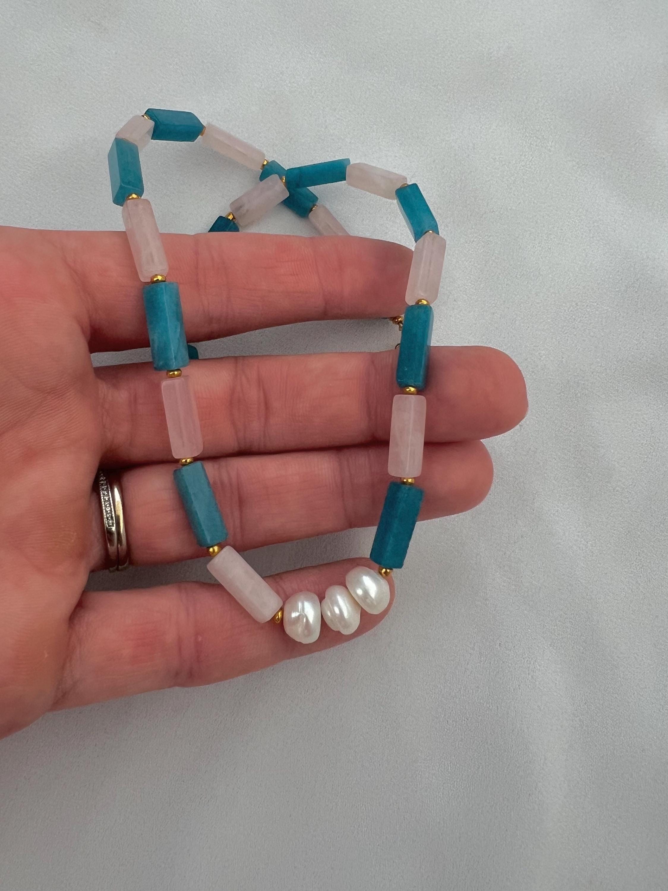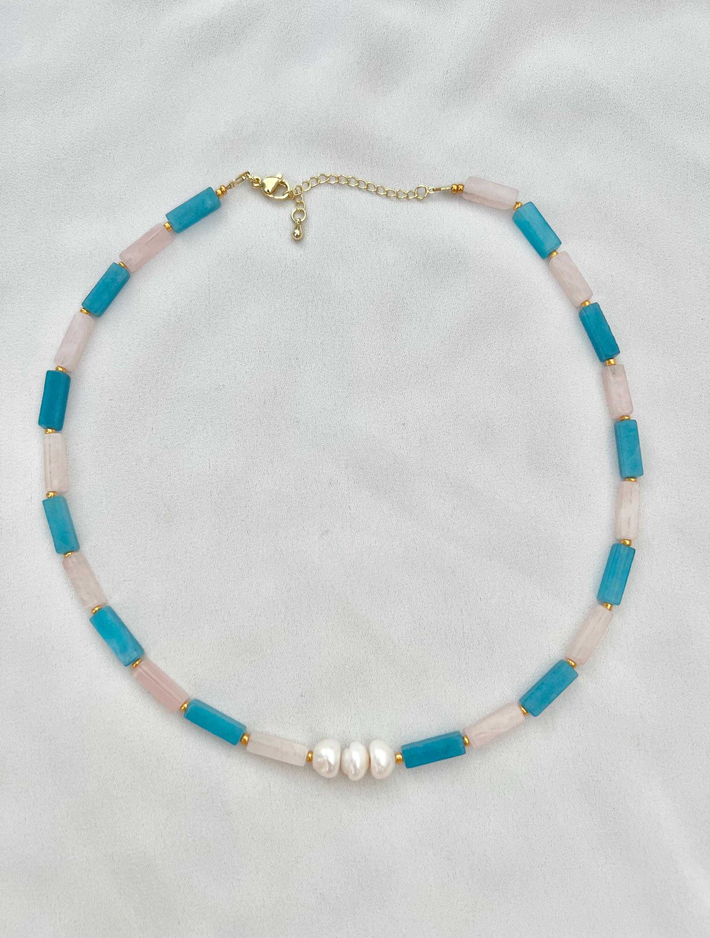 Rose Quartz blue Jade Freshwater pearl beaded gold necklace