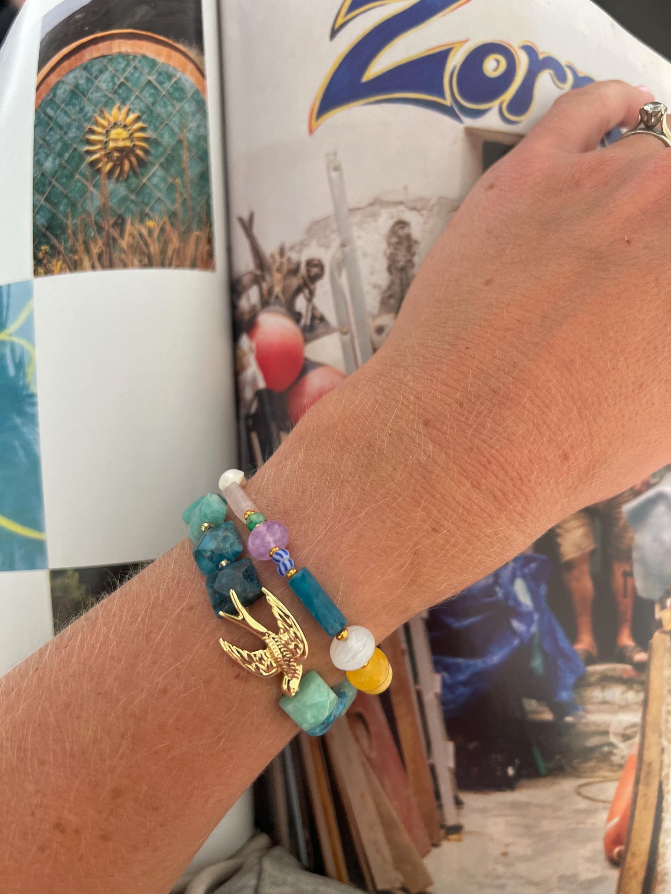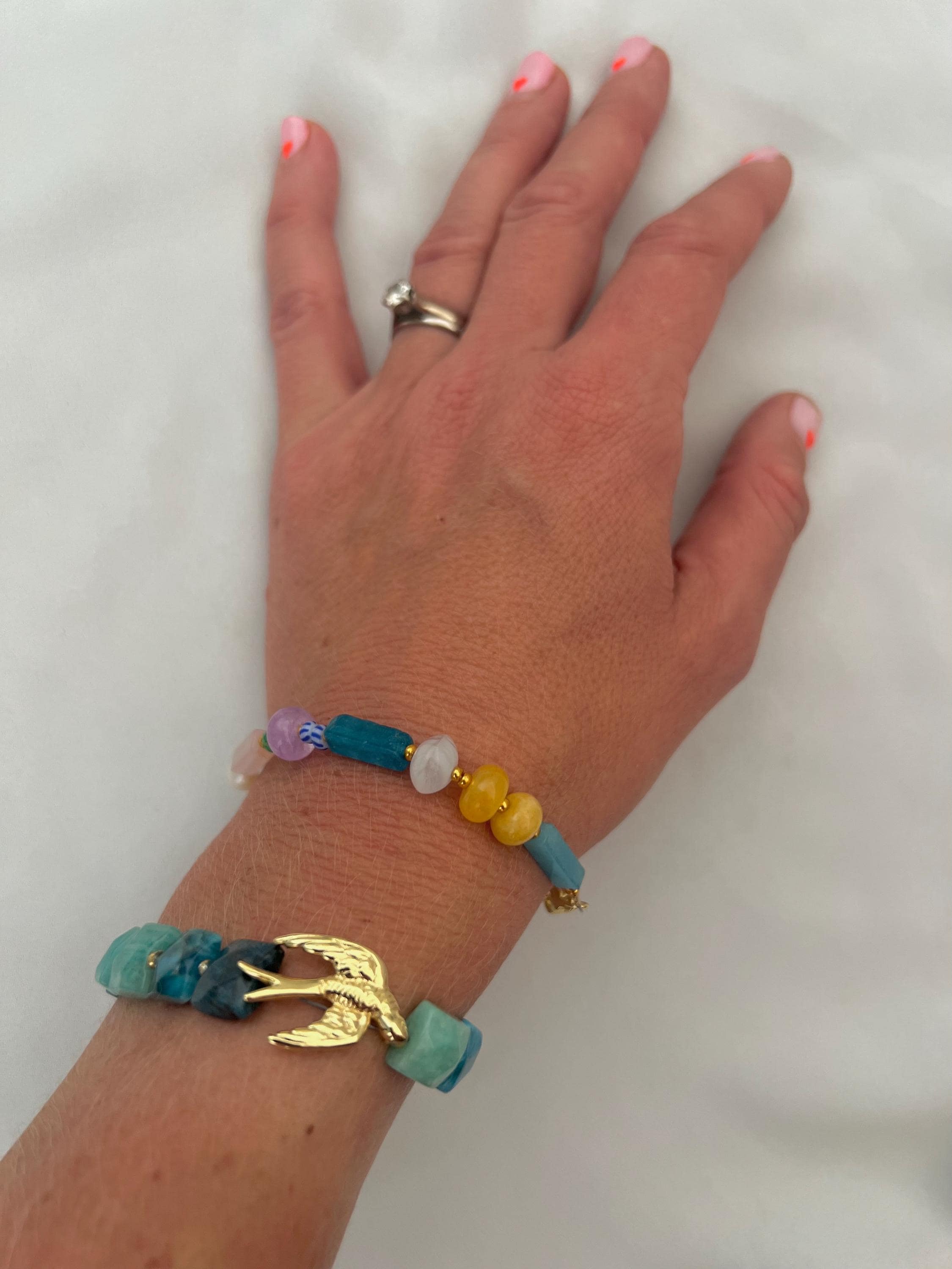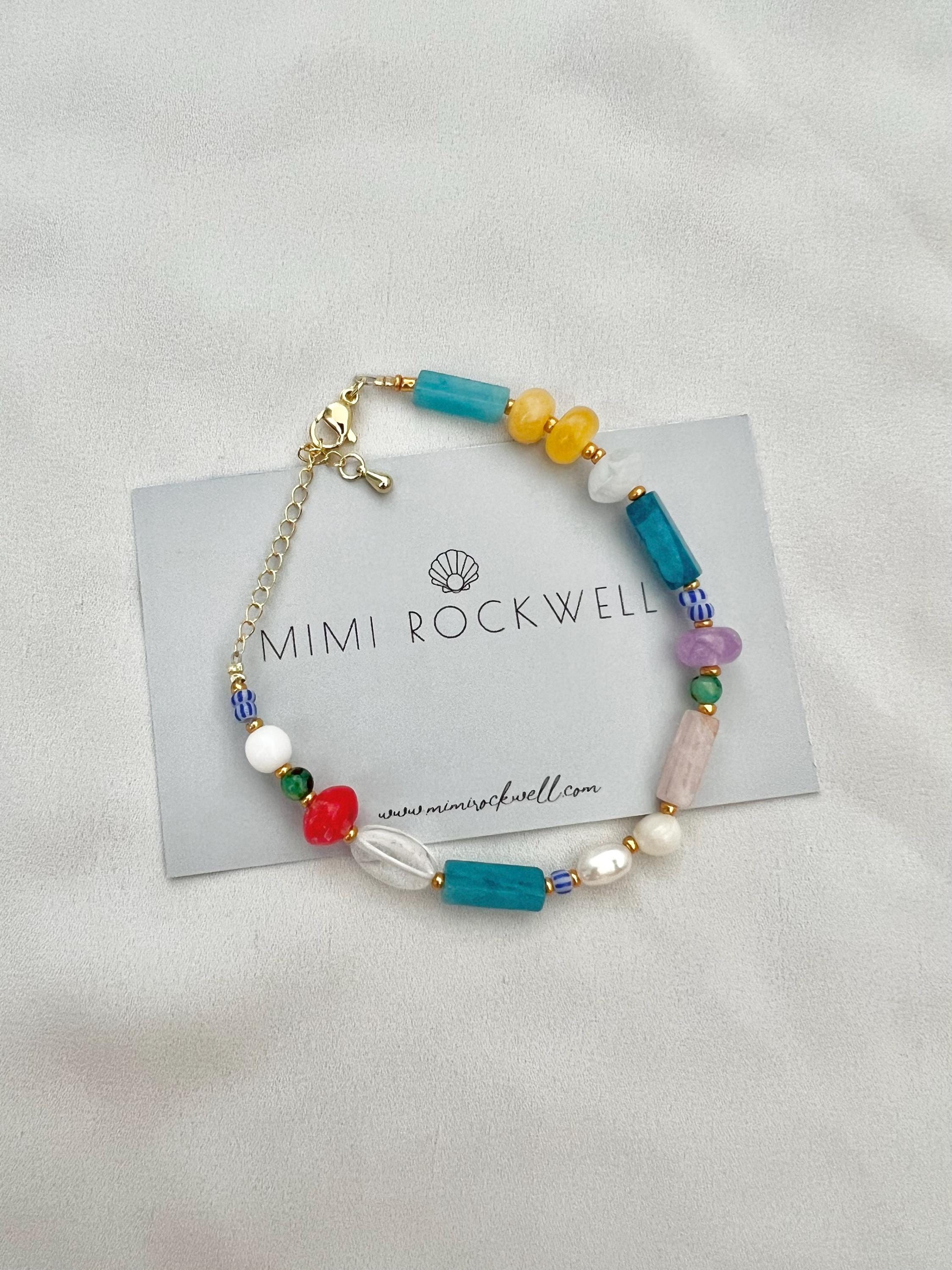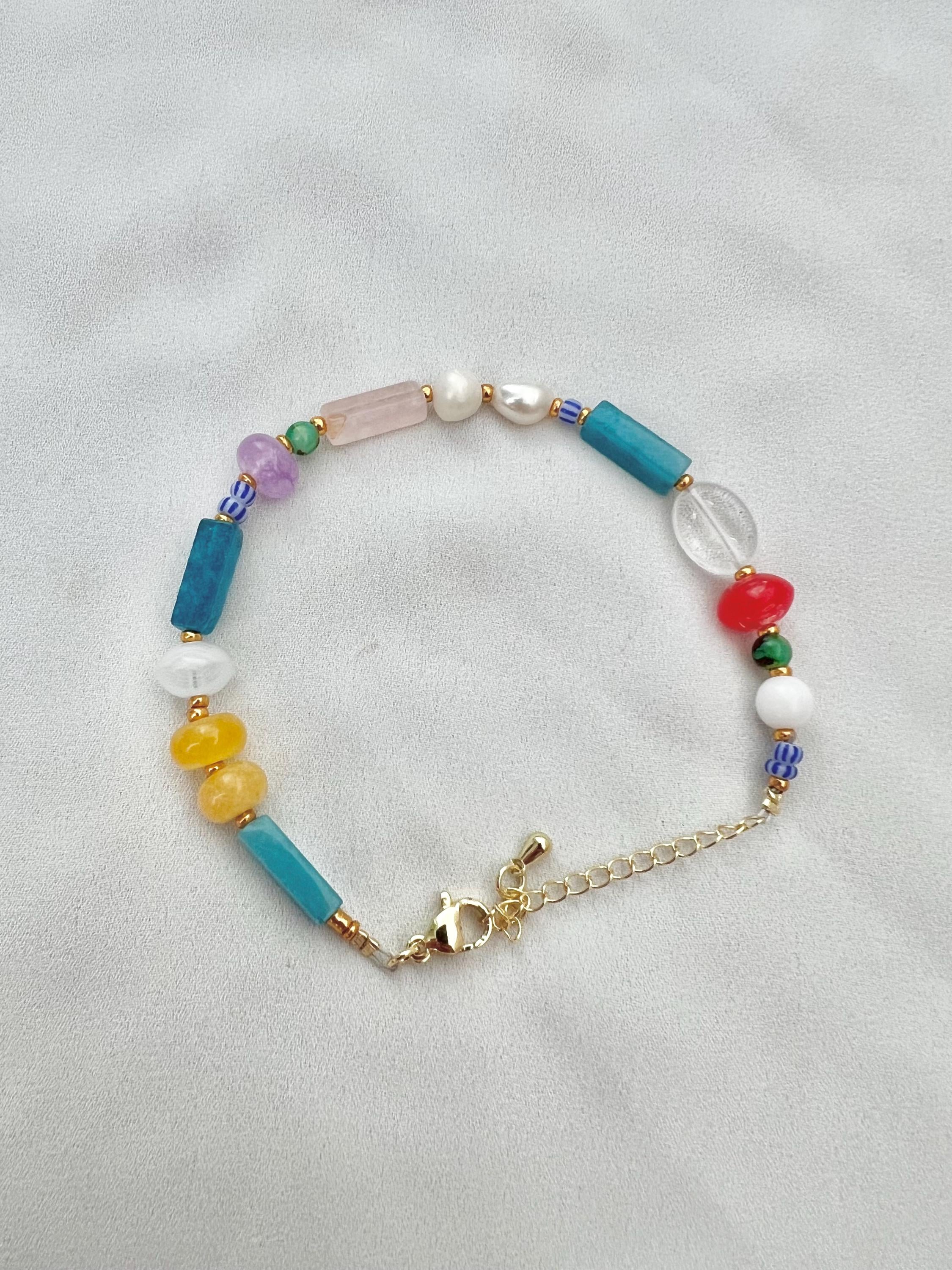 Multicoloured pearl gemstone and glass bead gold bracelet