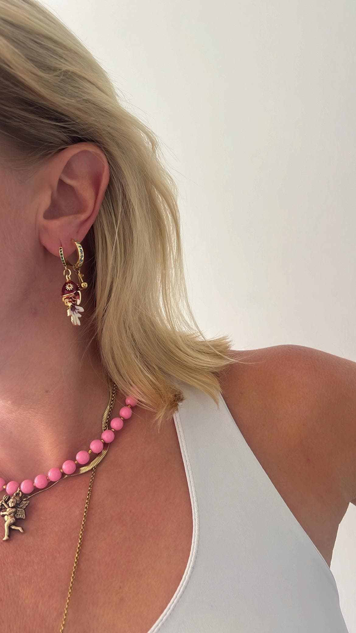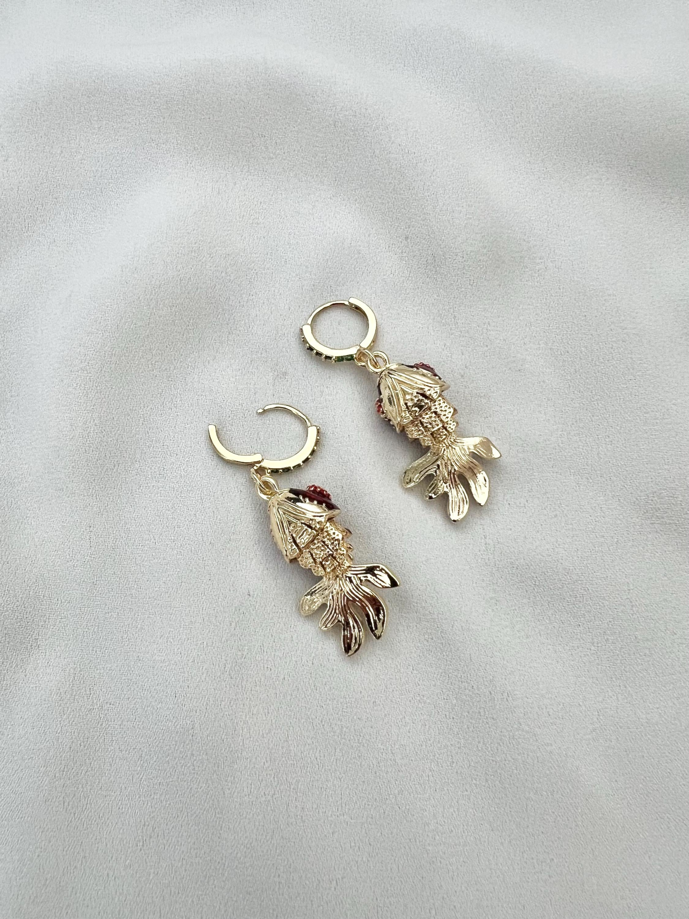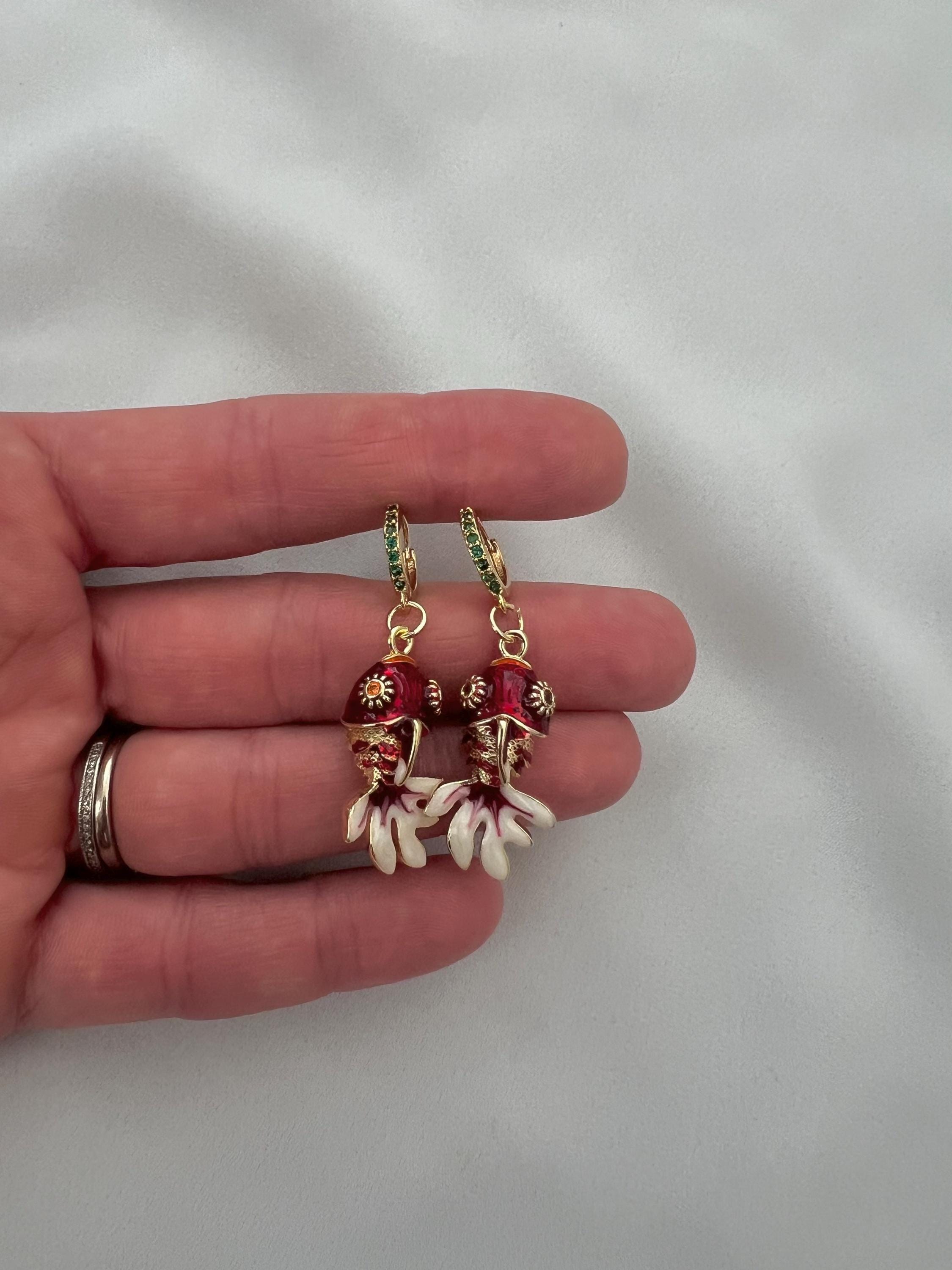 Dark red Cloisonné Koi goldfish green cubic zirconia stone gold mini hoops