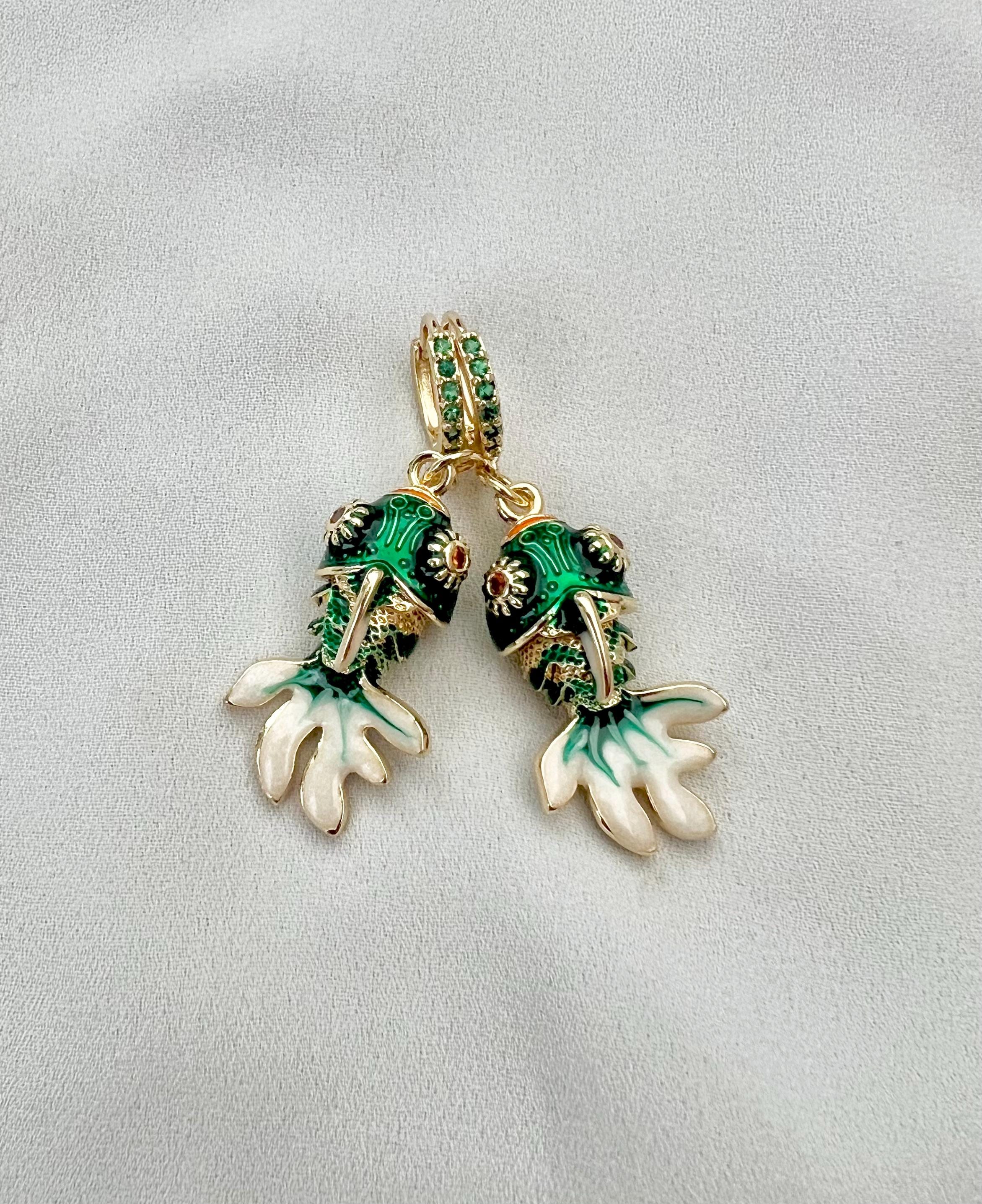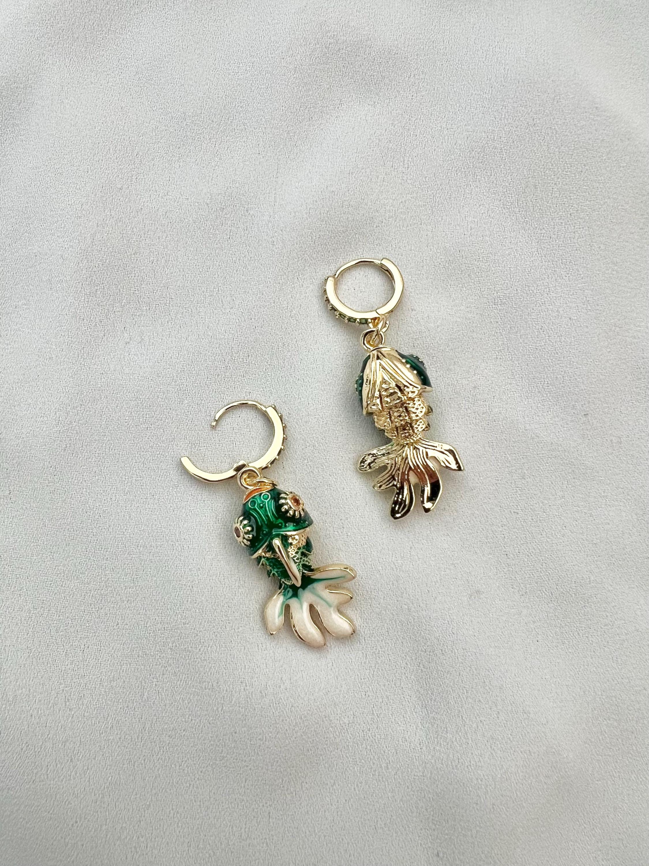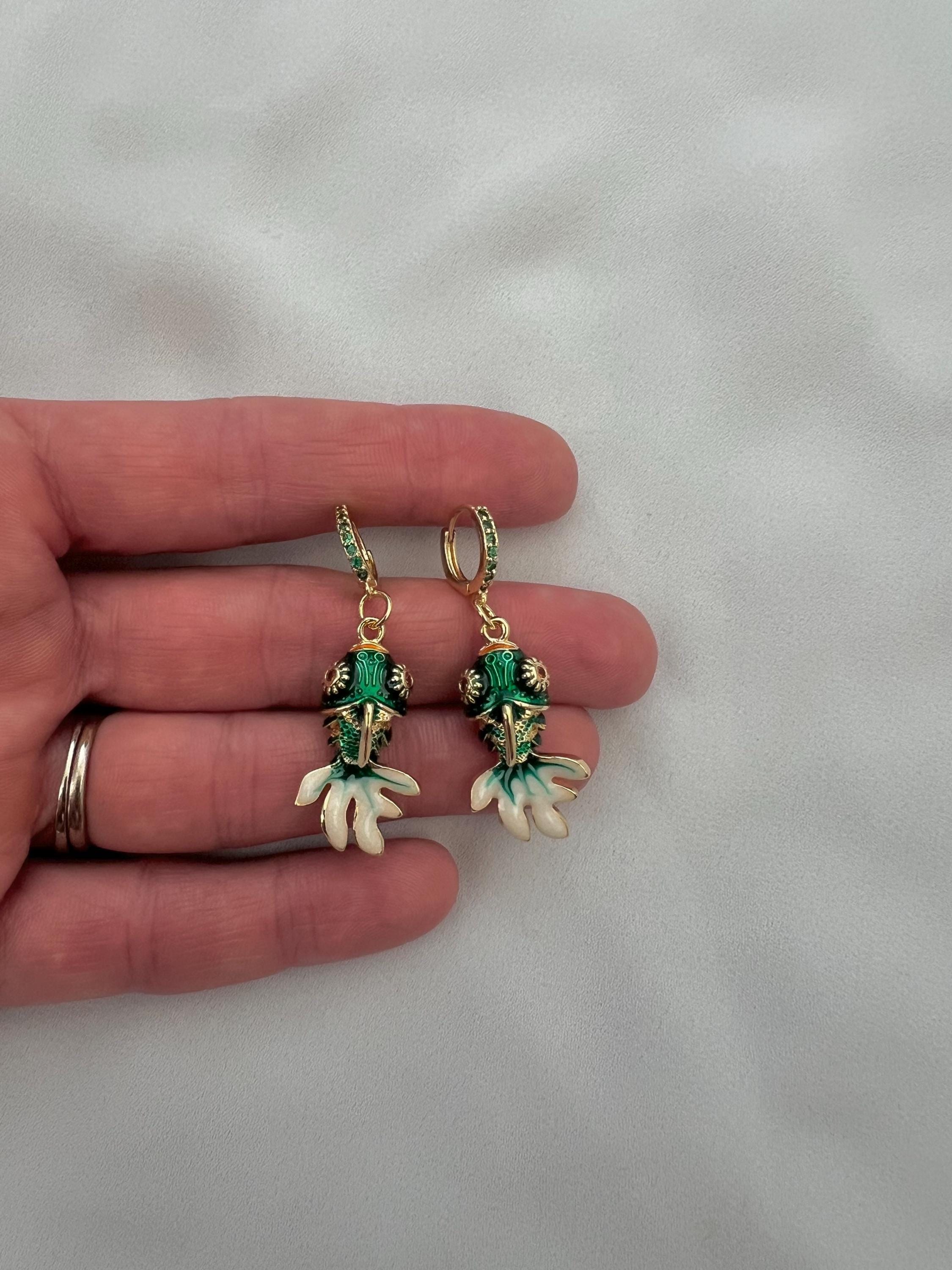 Green Cloisonné Koi goldfish cubic zirconia stone gold mini hoops