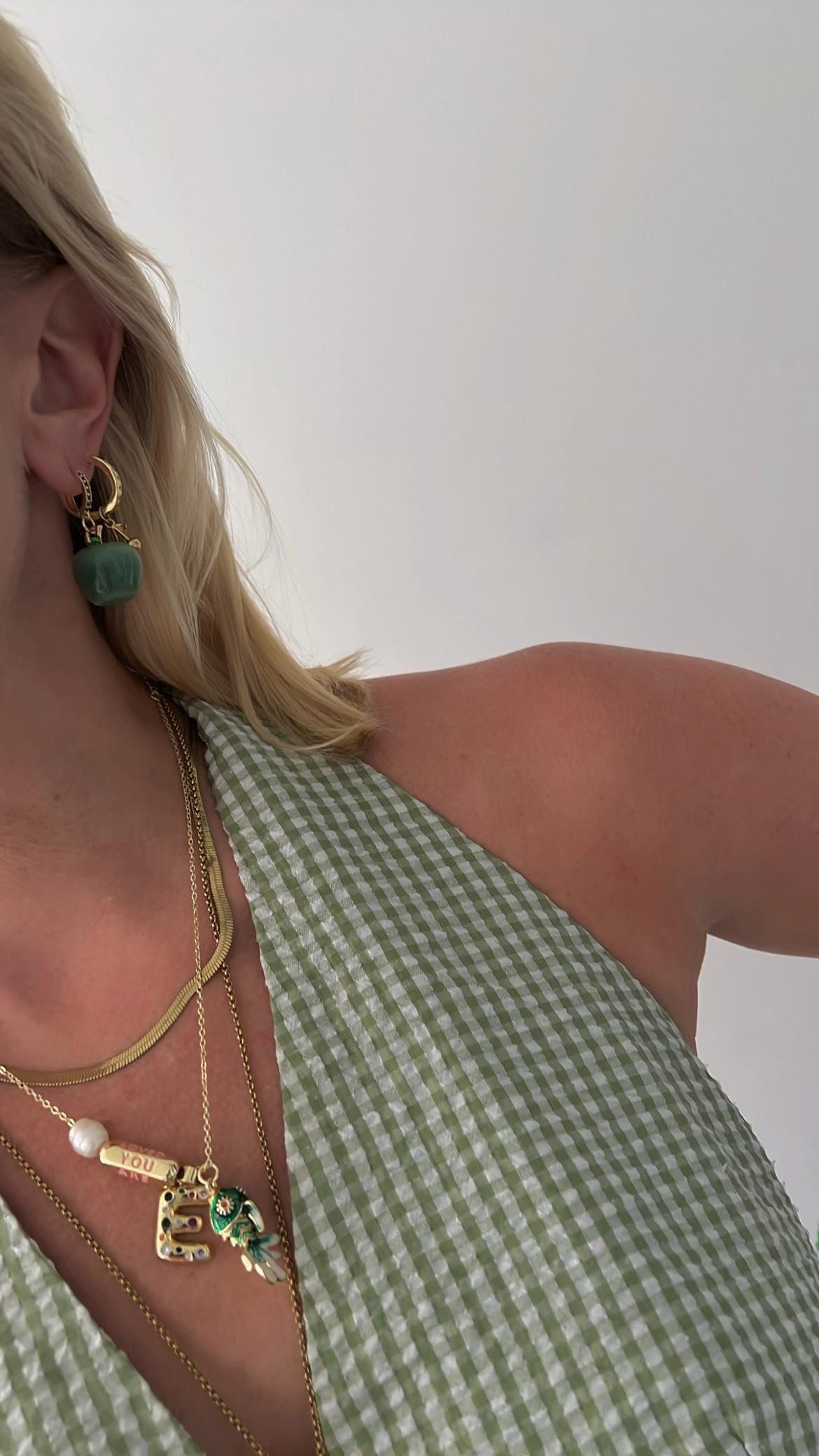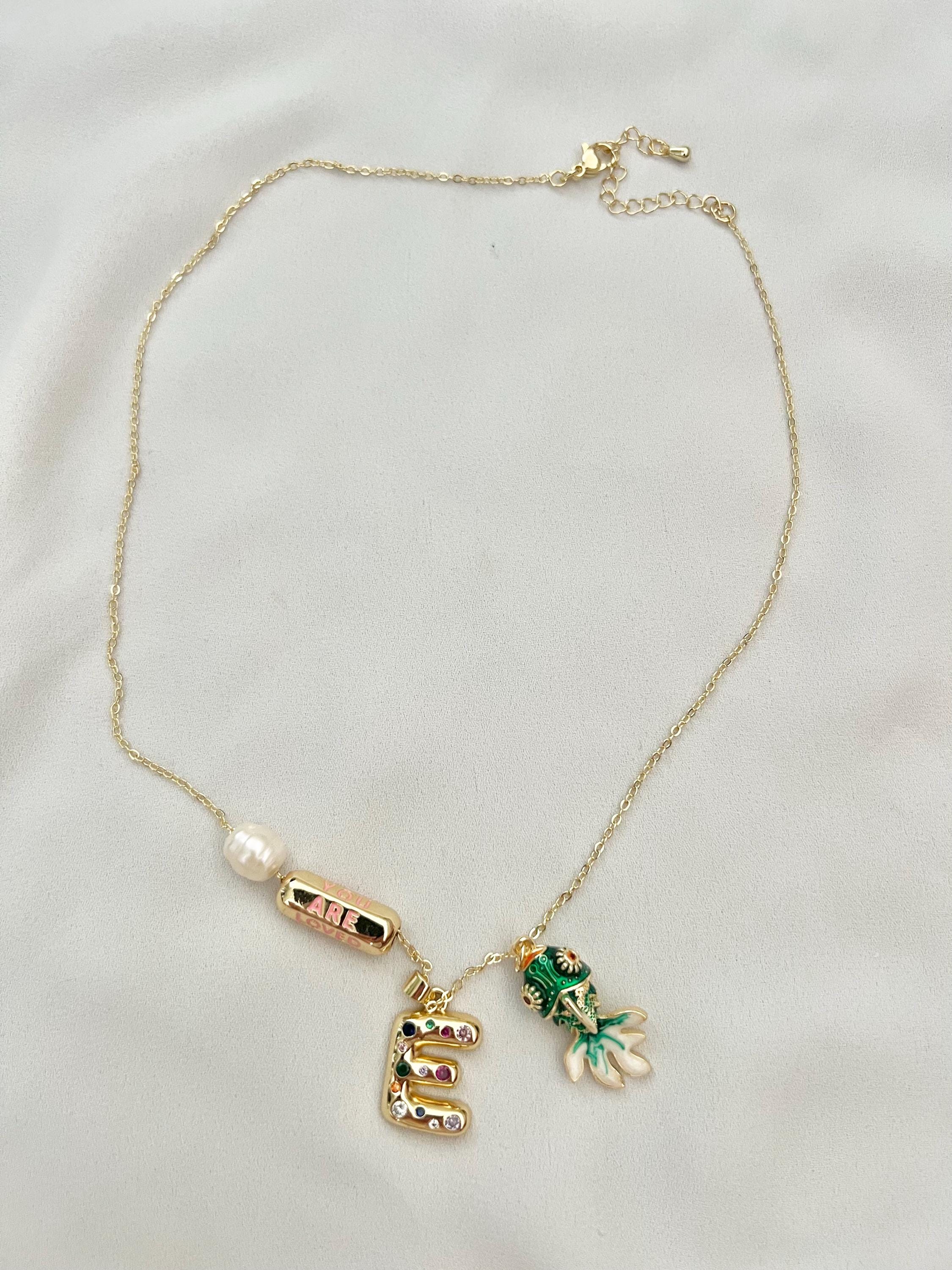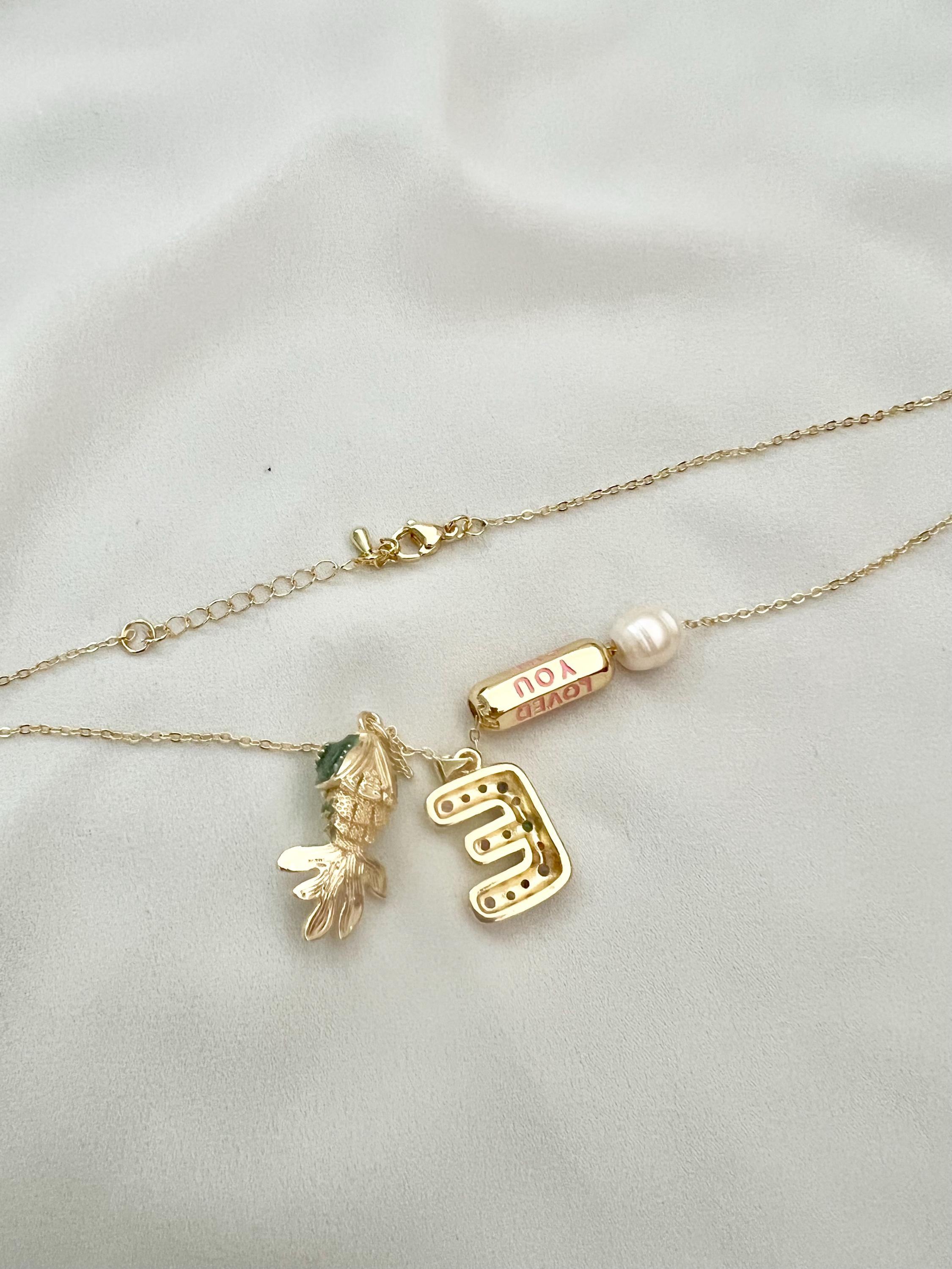 Green Cloisonné goldfish custom Cubic Zirconia bubble letter You are loved pendant pearl gold necklace
