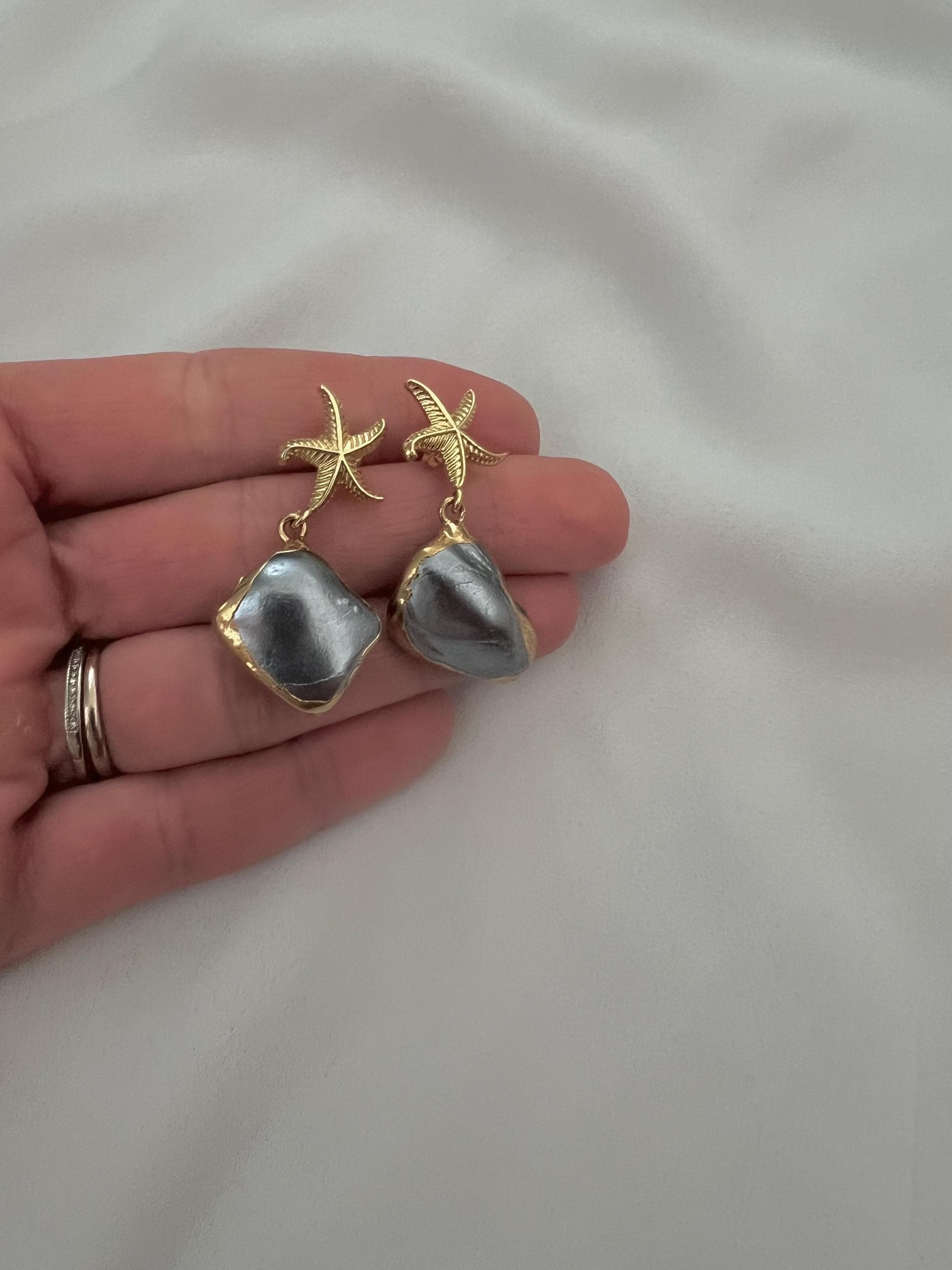 Gold plated blue Baroque pearl starfish stud dangle drop earrings