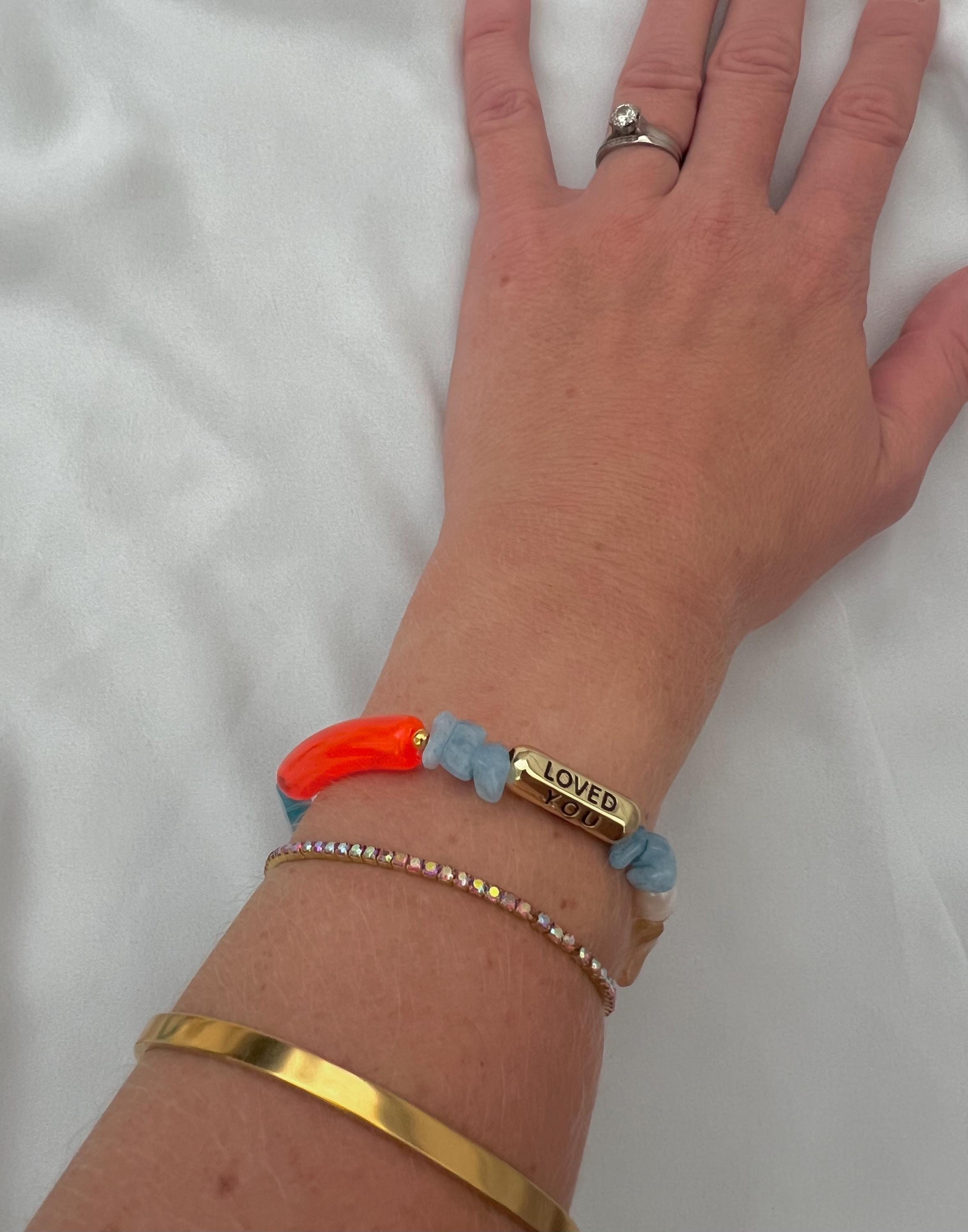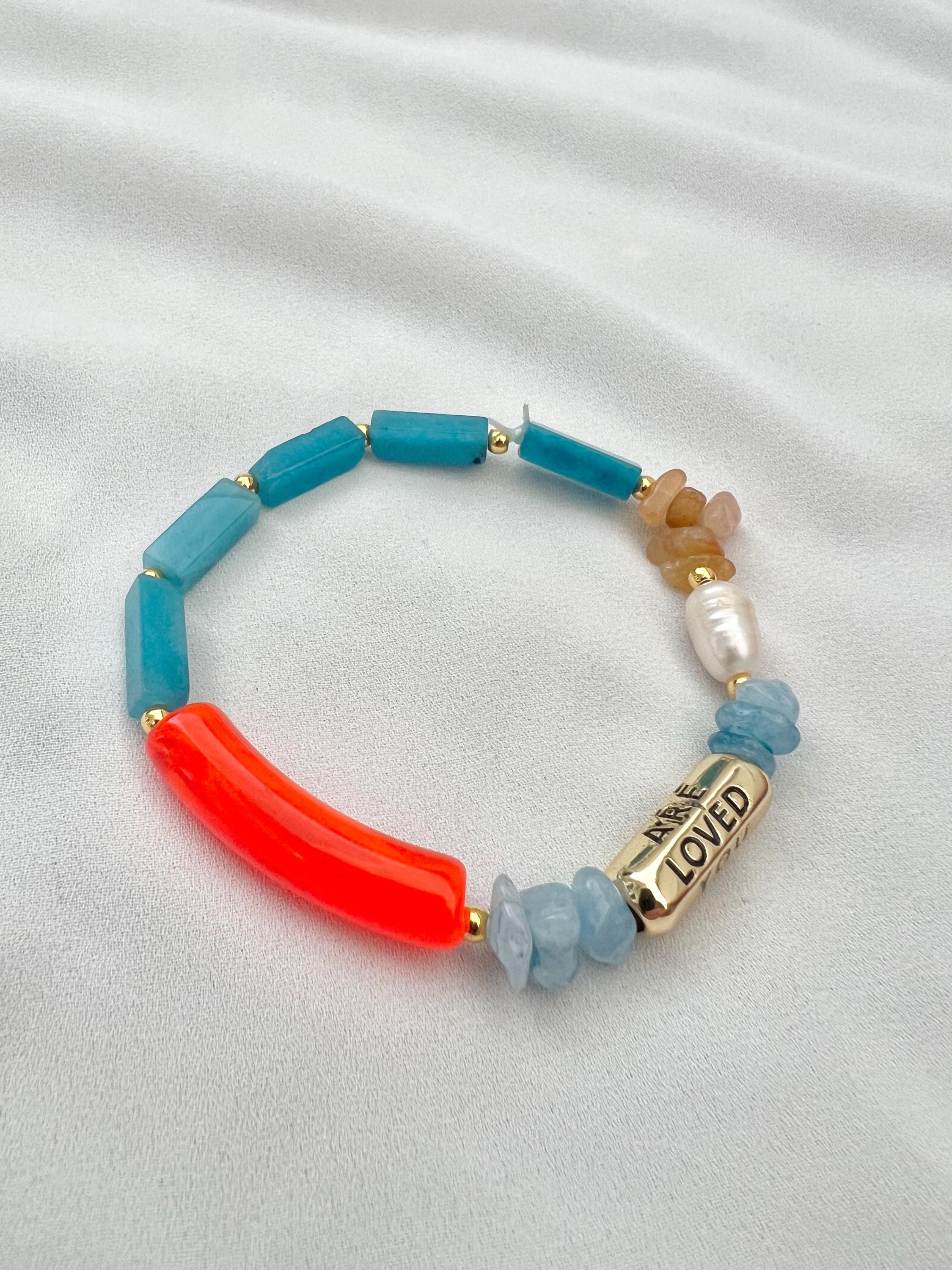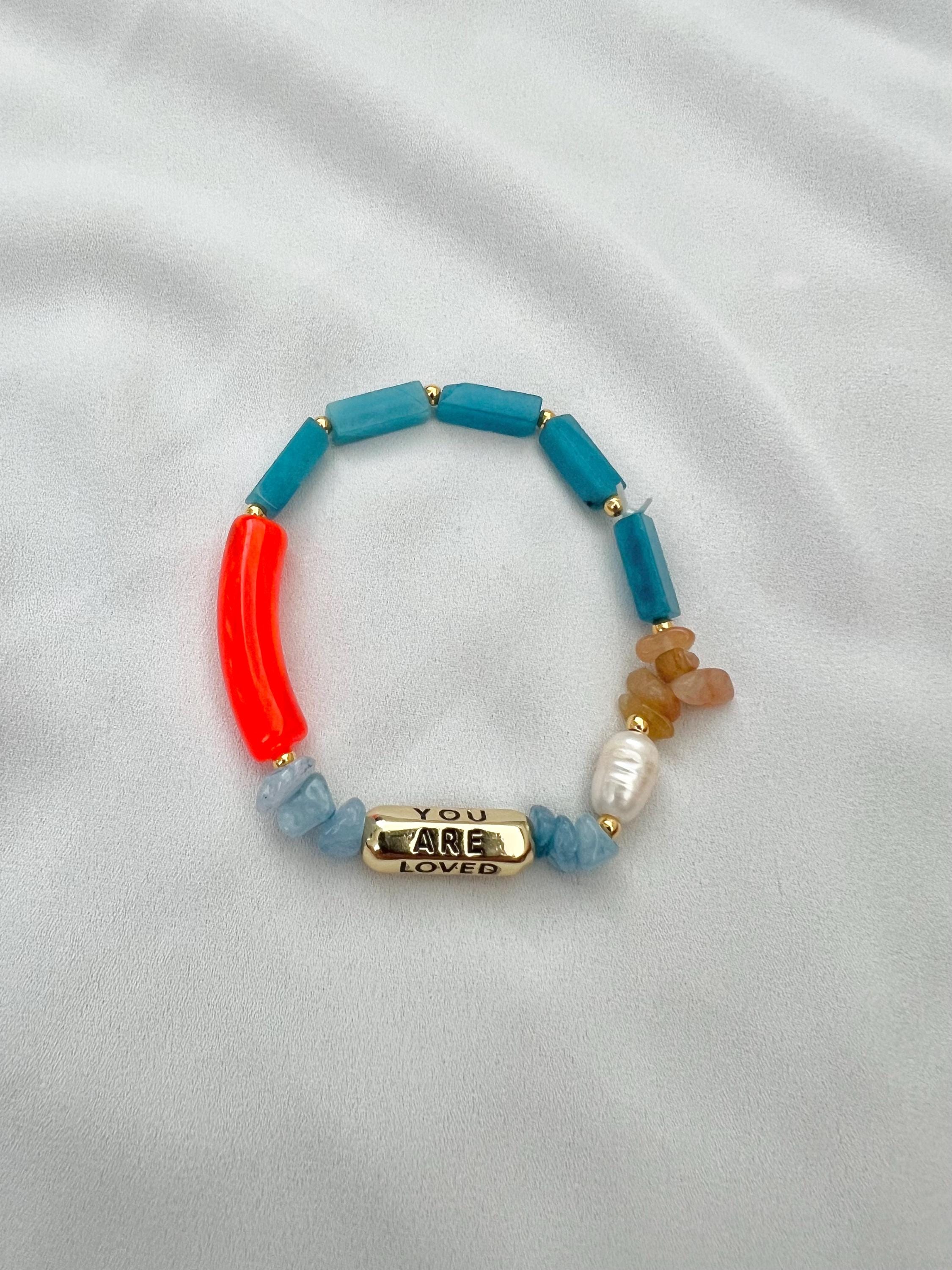 You are loved gold charm black writing pearl gemstone bead bracelet