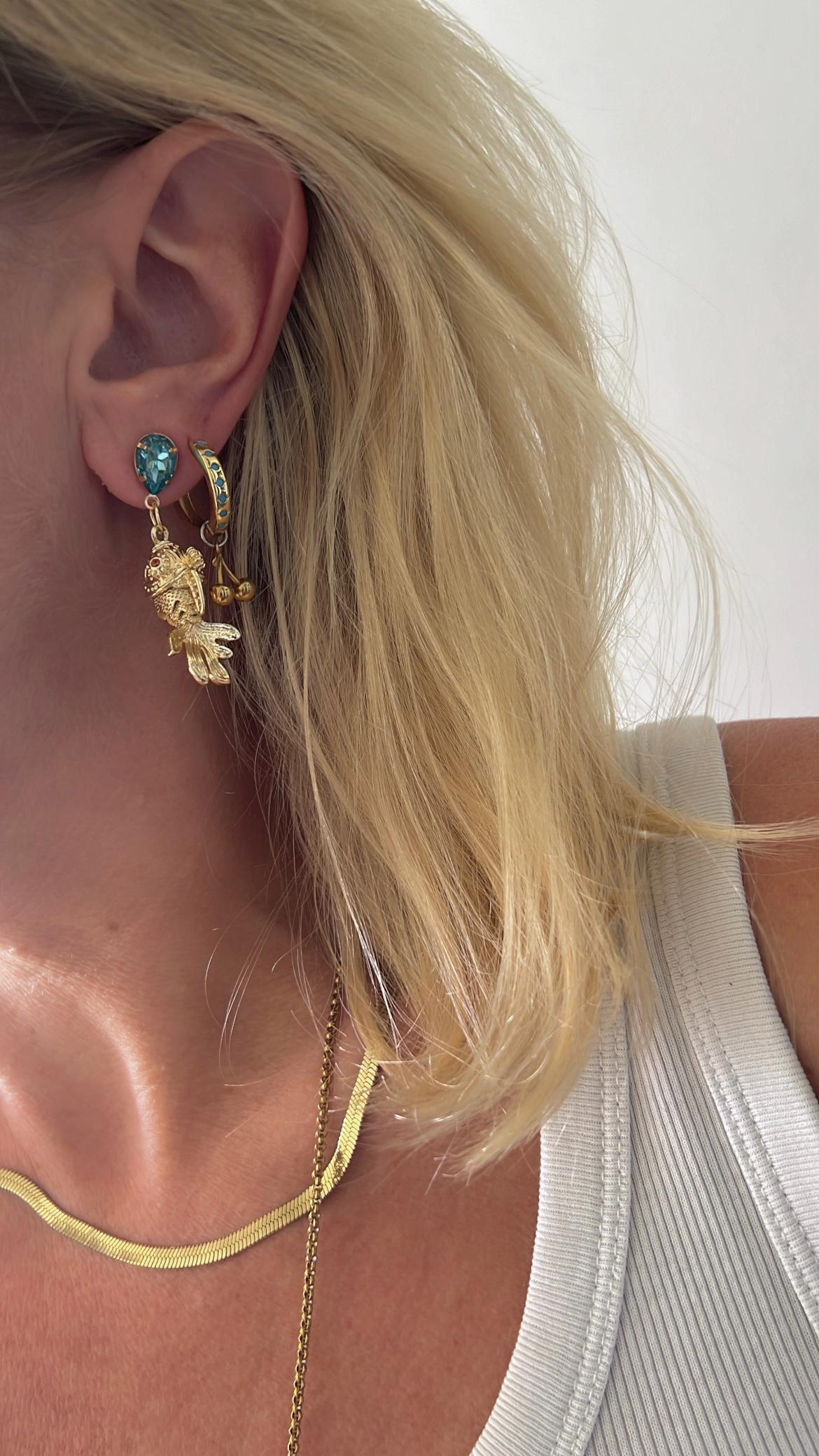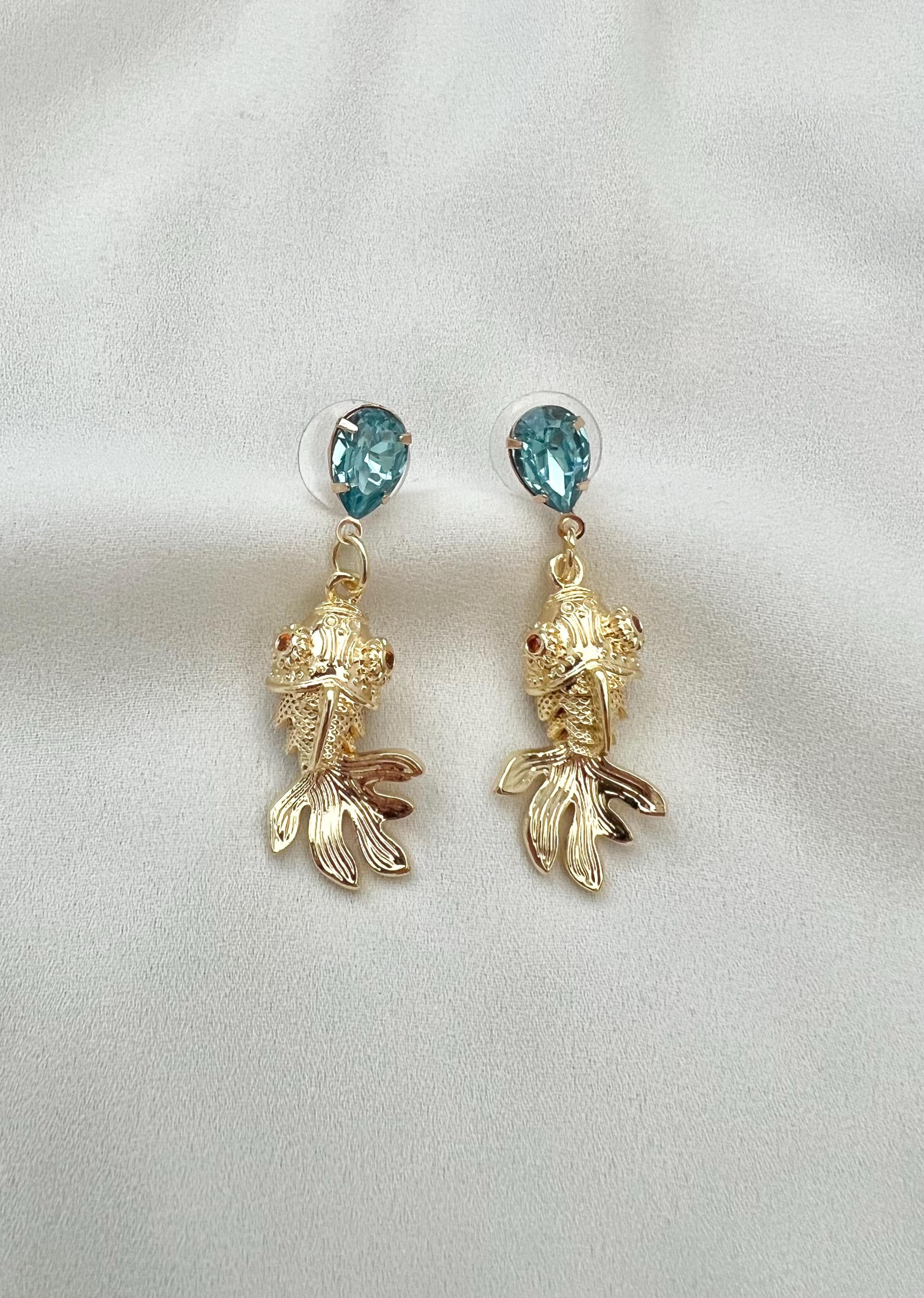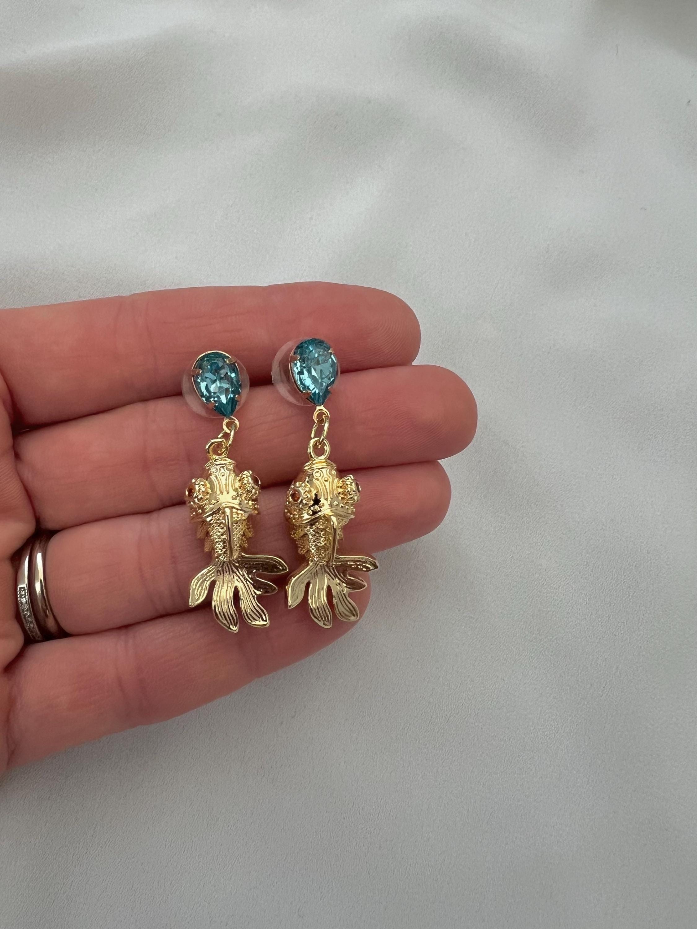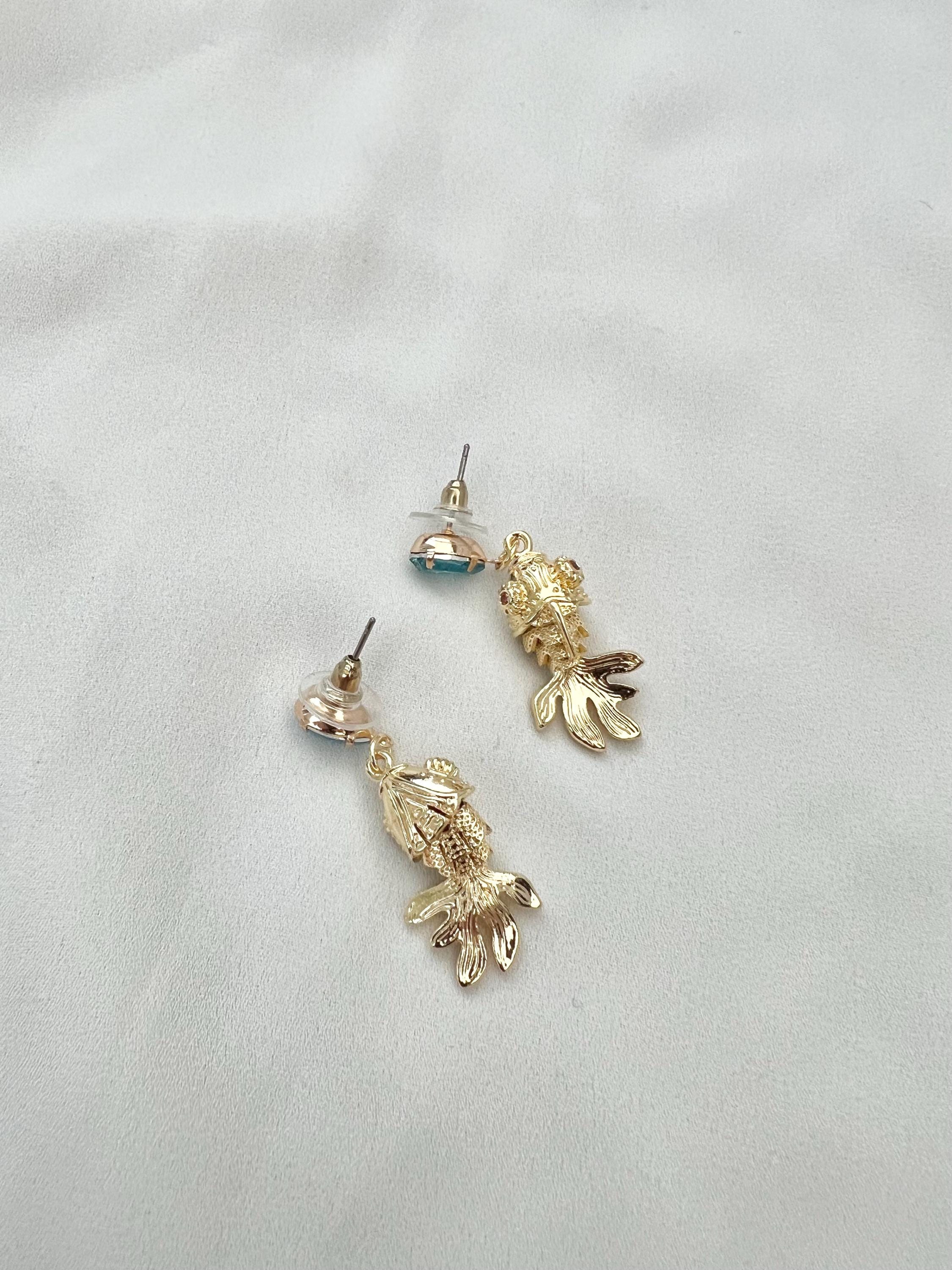 Gold Cloisonné Koi goldfish blue stone stud earrings