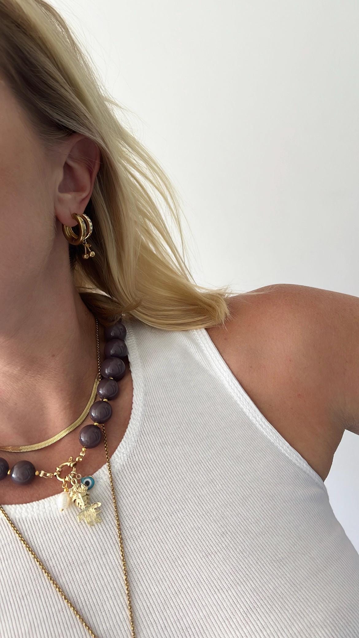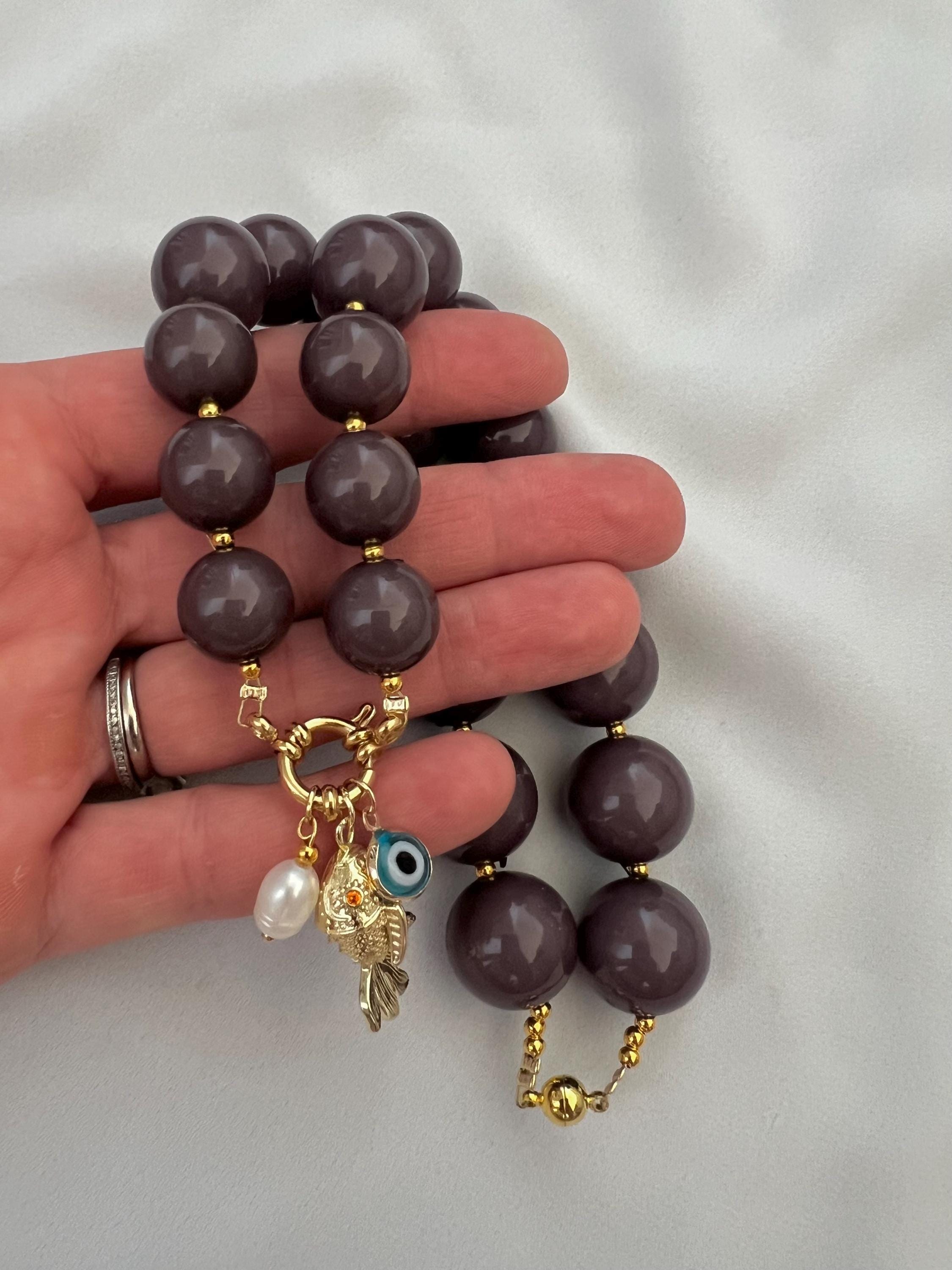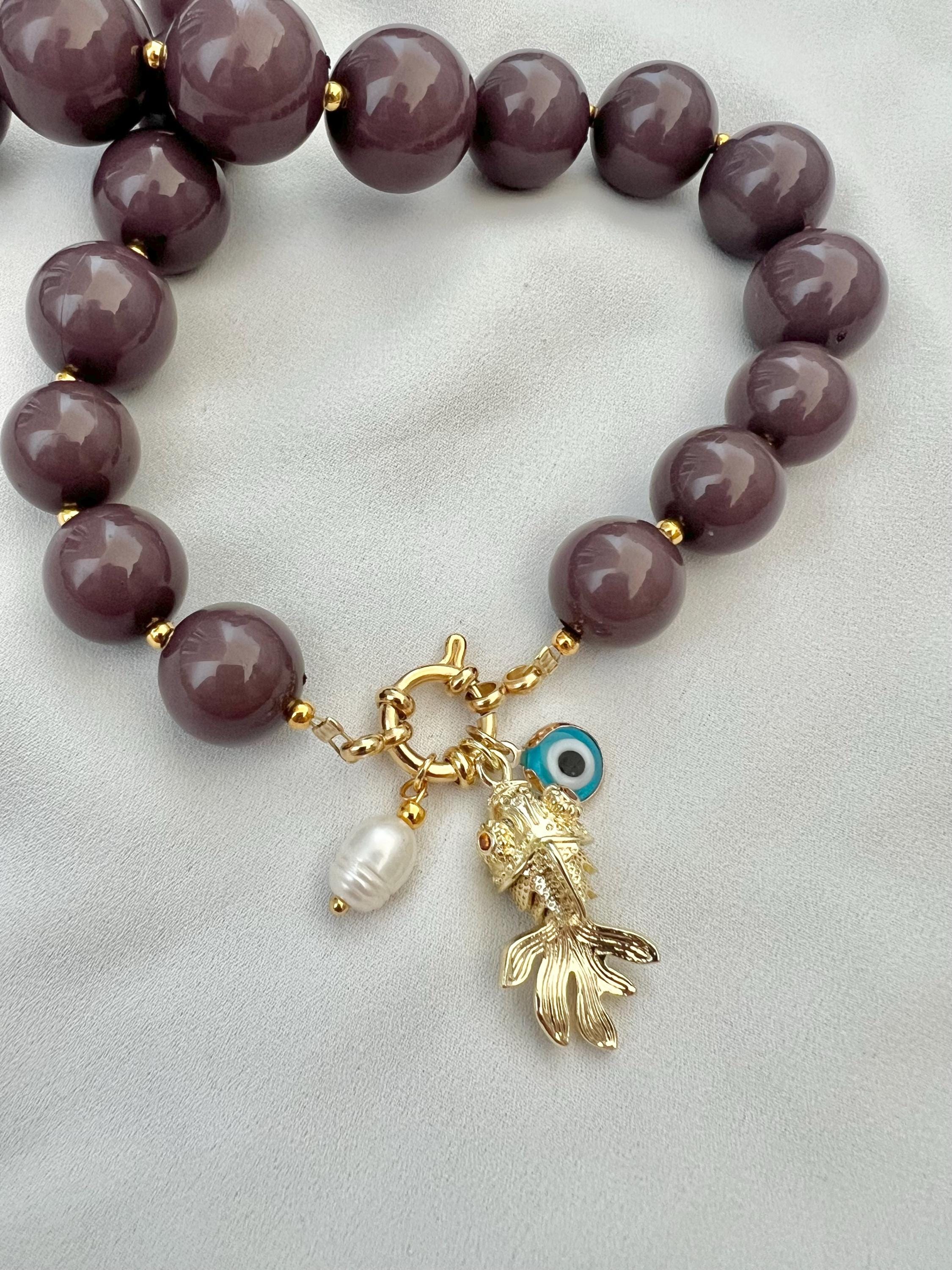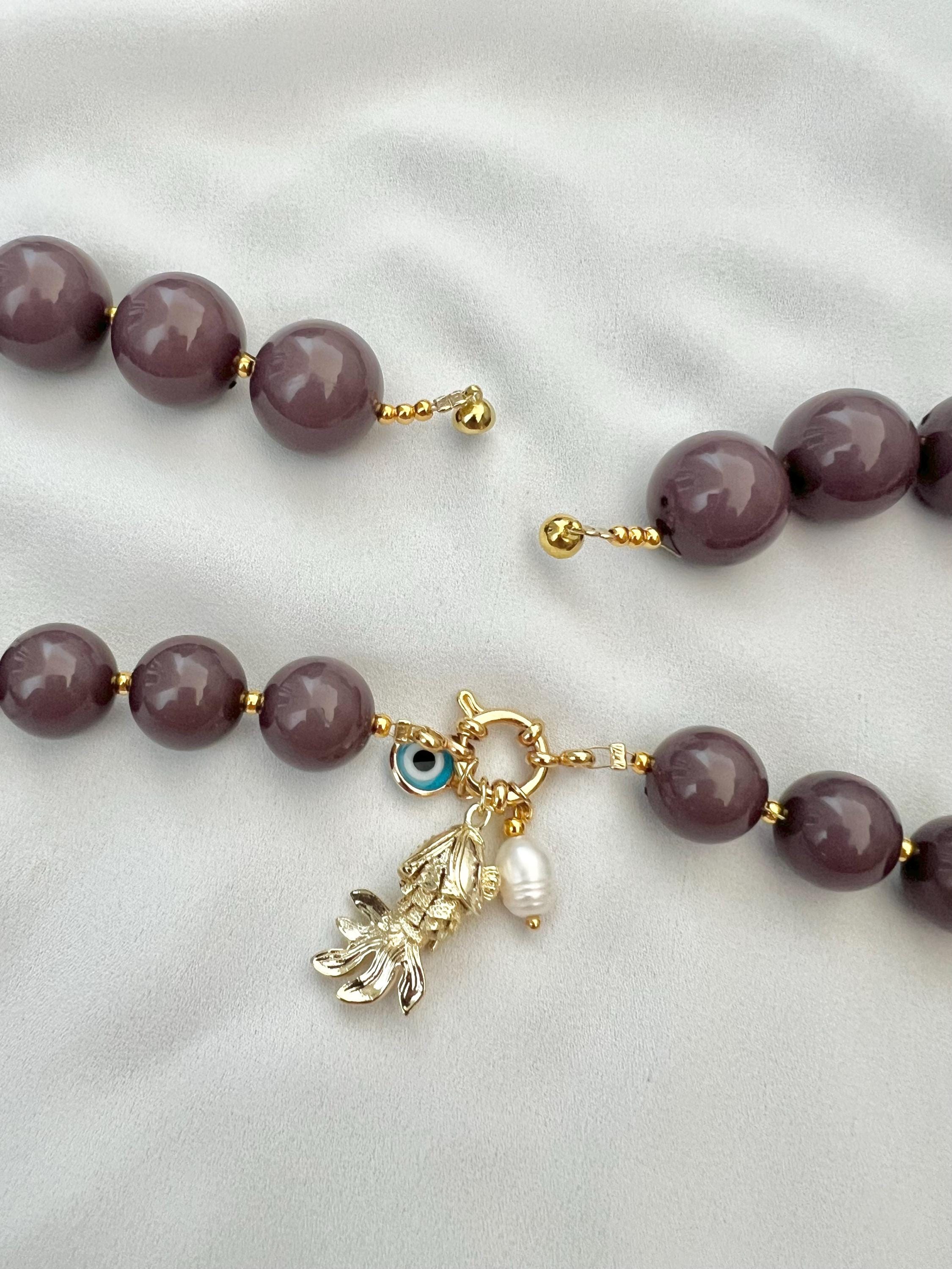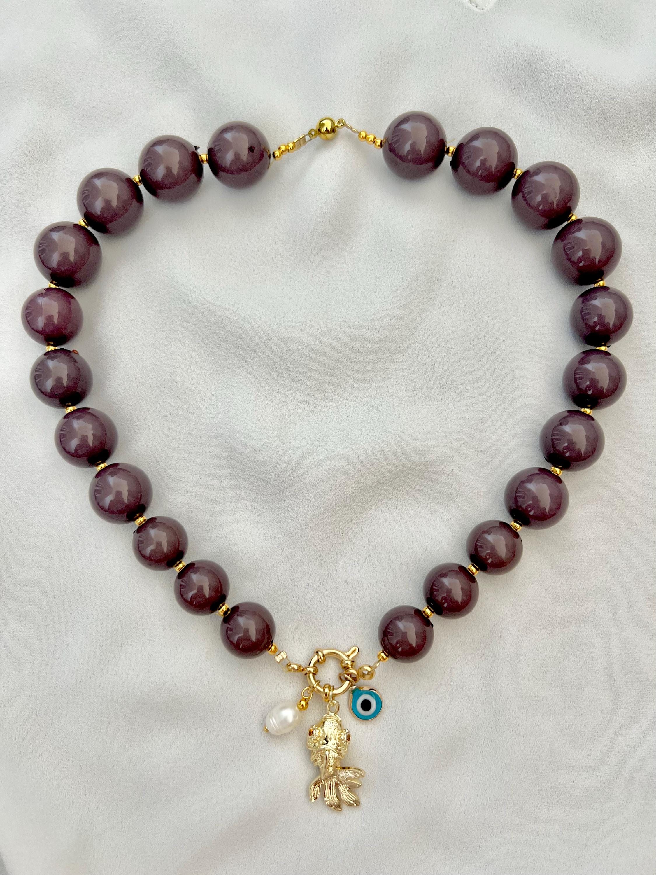 Cloisonne goldfish evil eye pearl large brownish purple bead gold necklace
