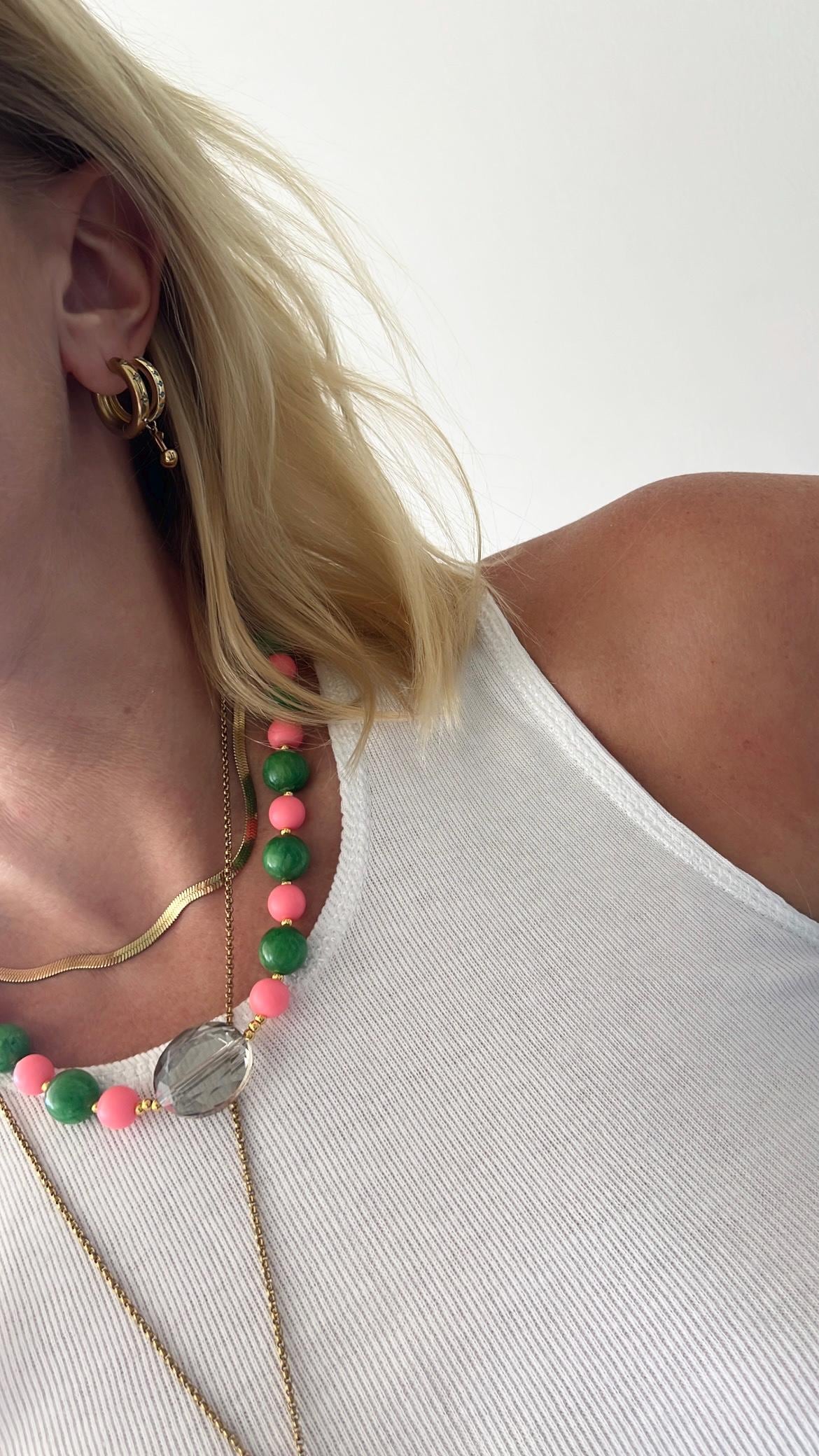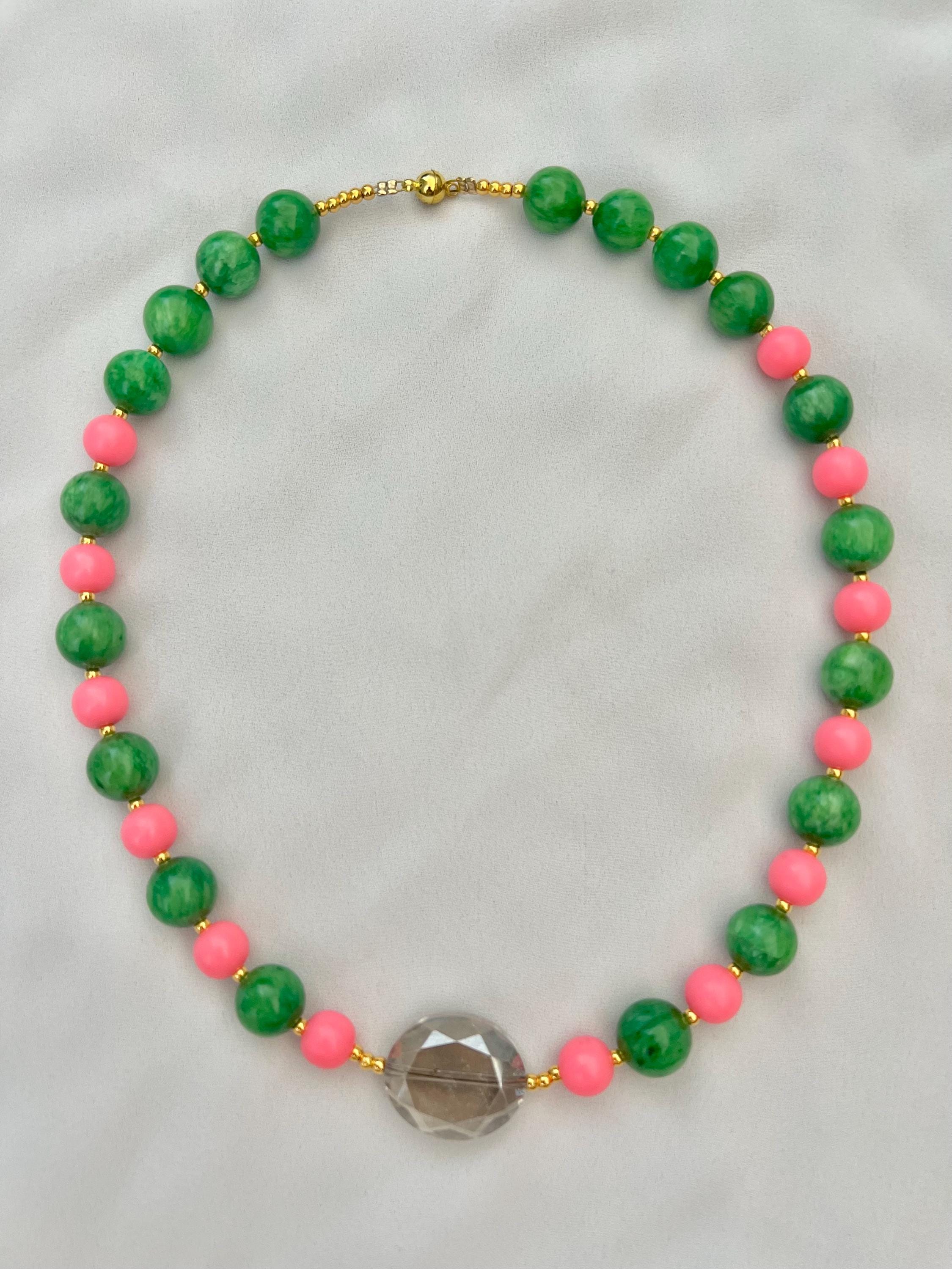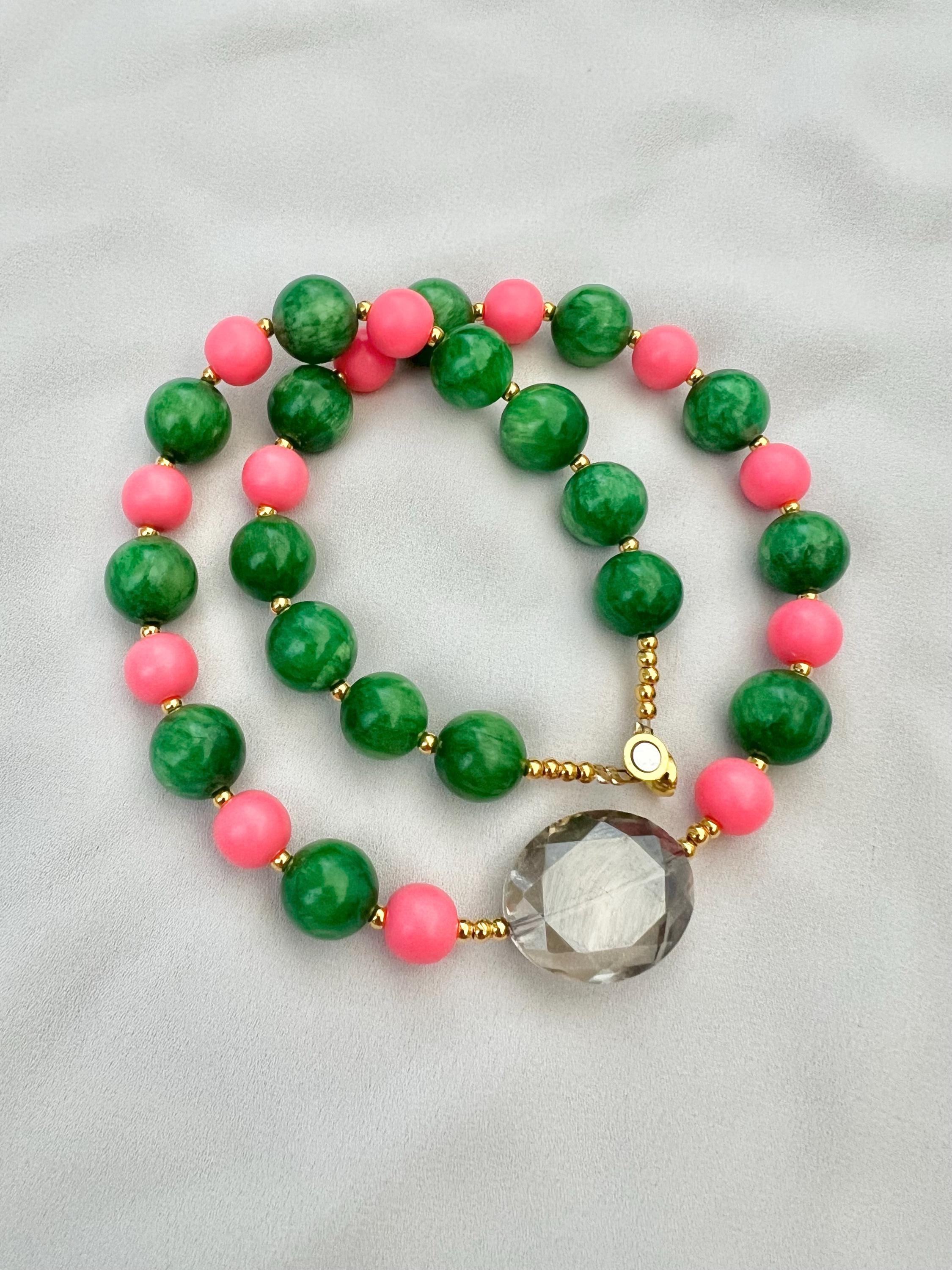 Large green Jade stone pink bead glass crystal magnetic lock gold necklace