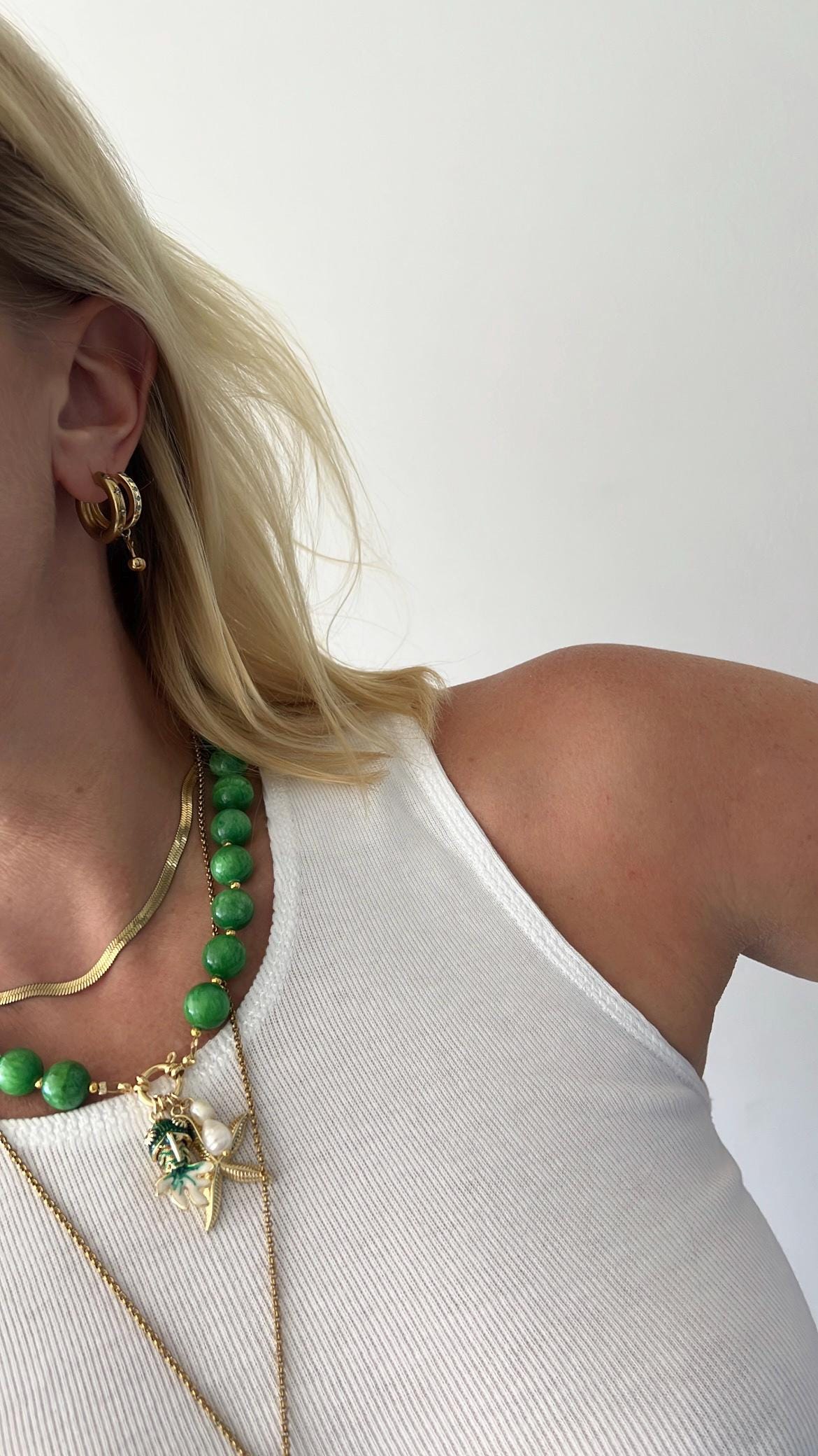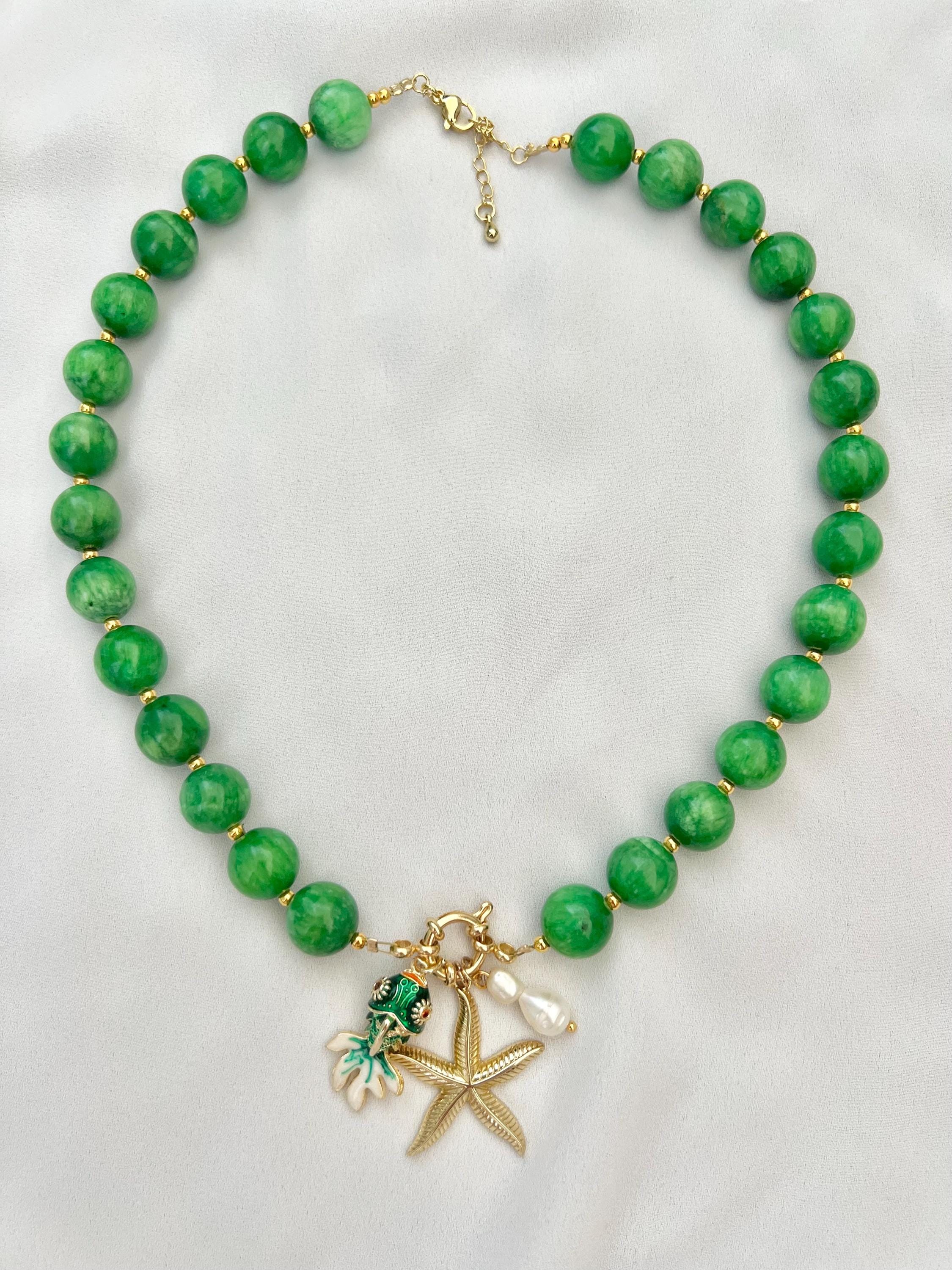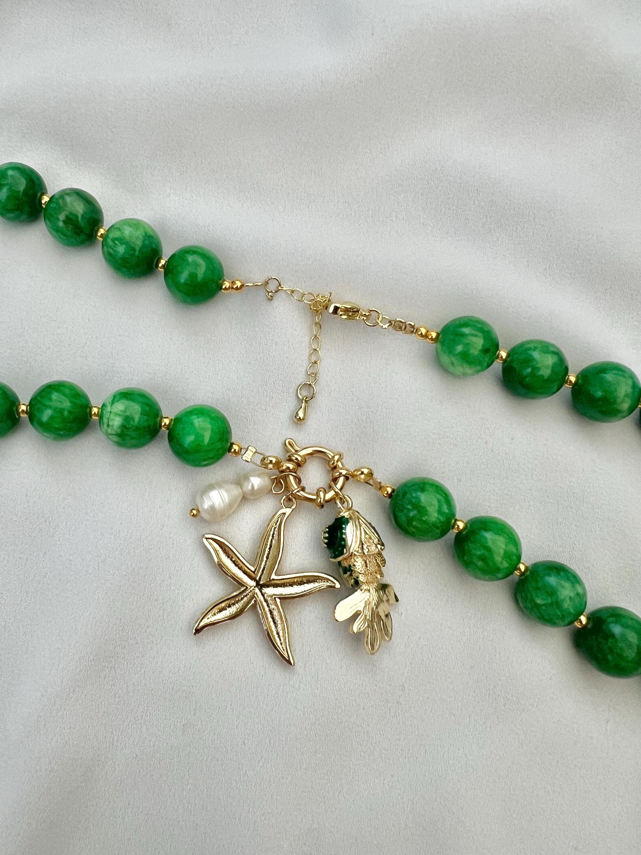 Cloisonne goldfish starfish pearl large green Jade stone bead gold necklace