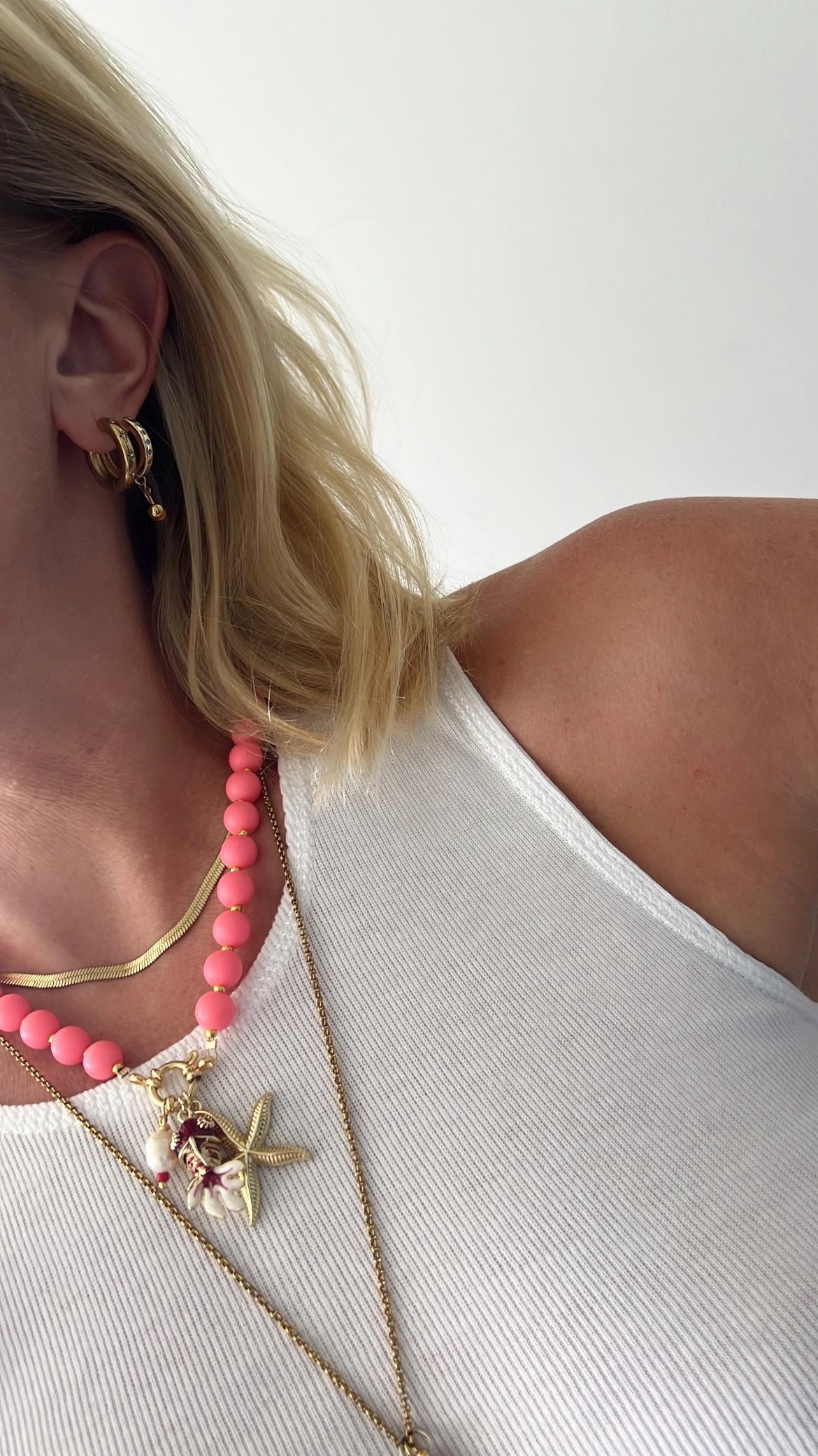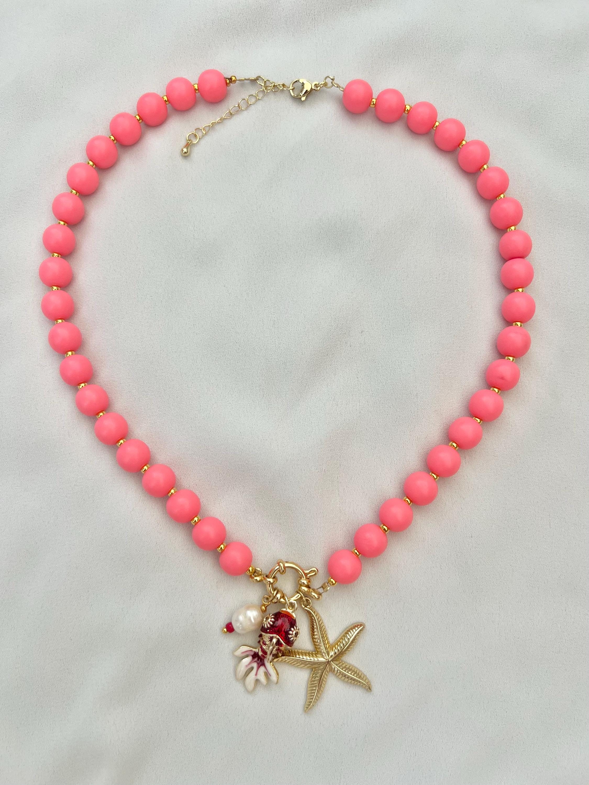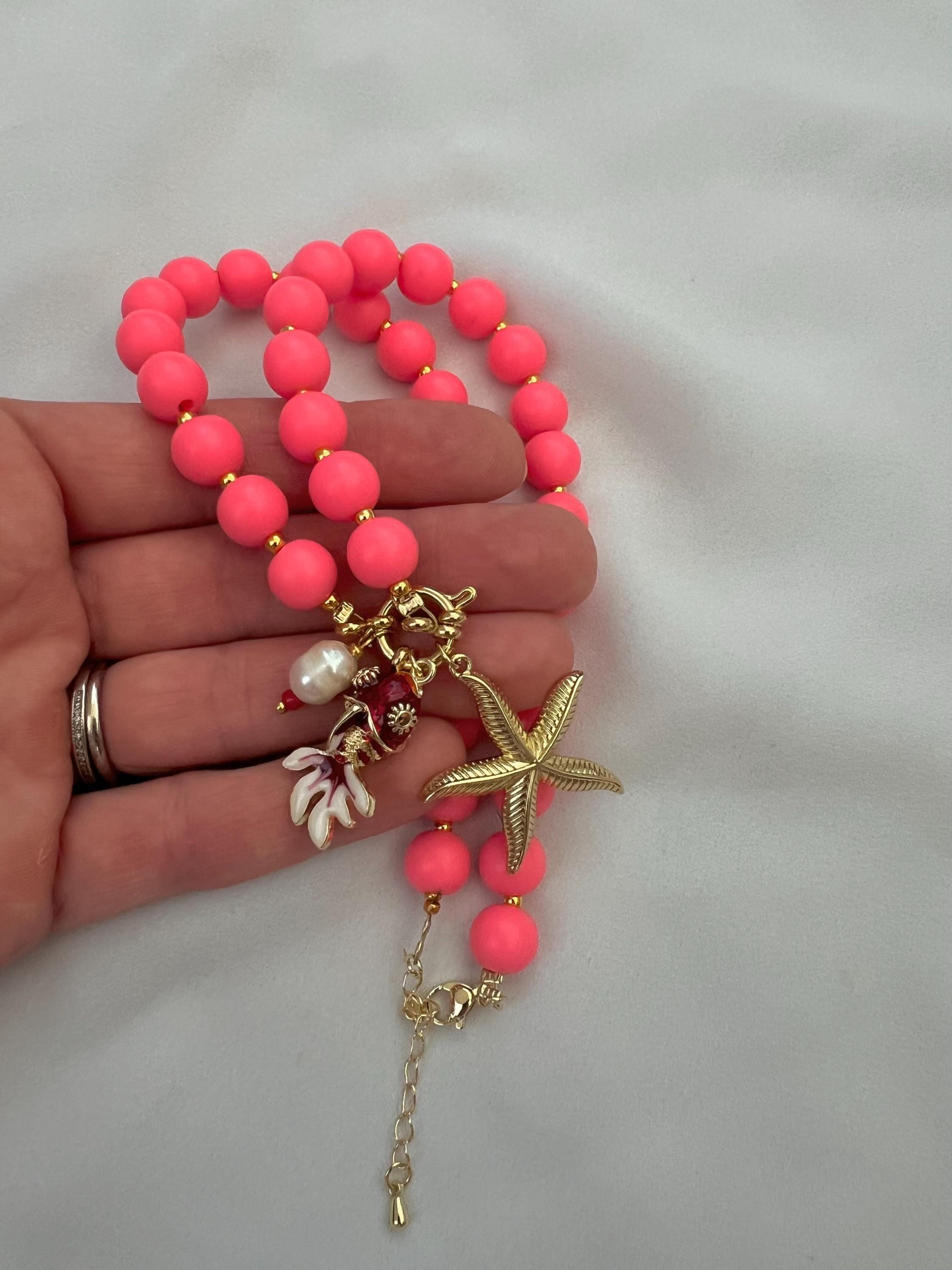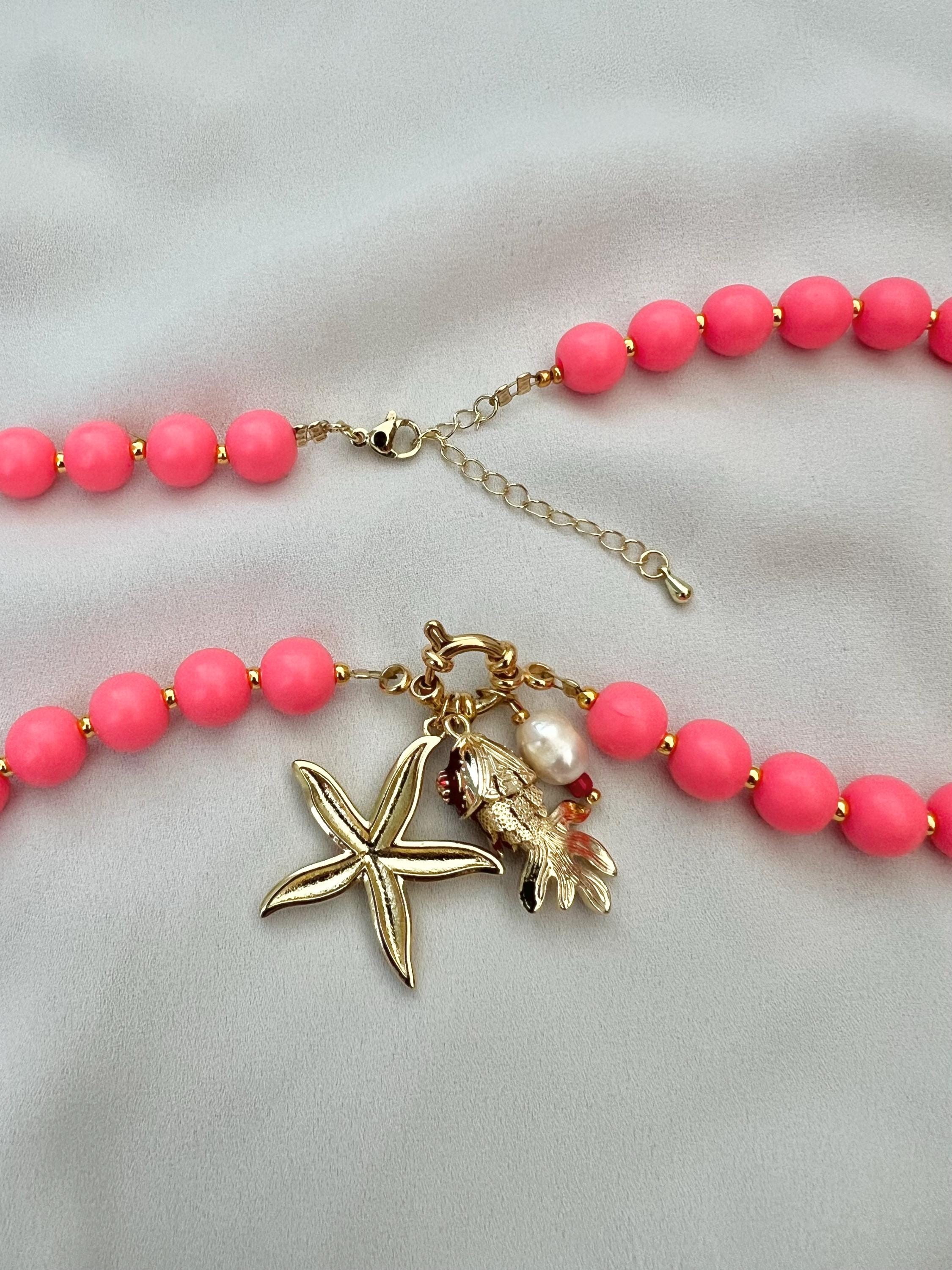 Red Cloisonné goldfish starfish pendants pearl pink bead gold necklace