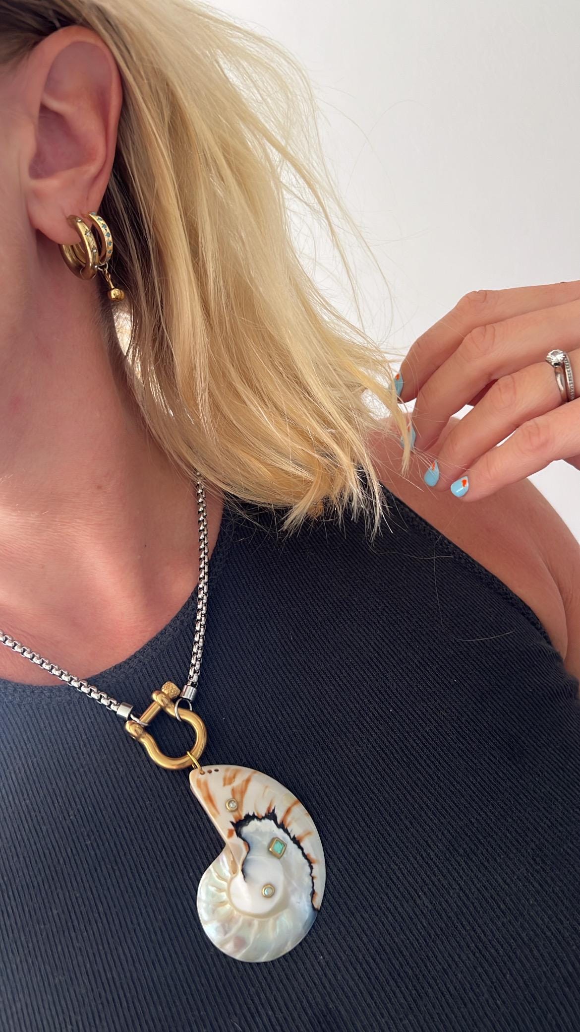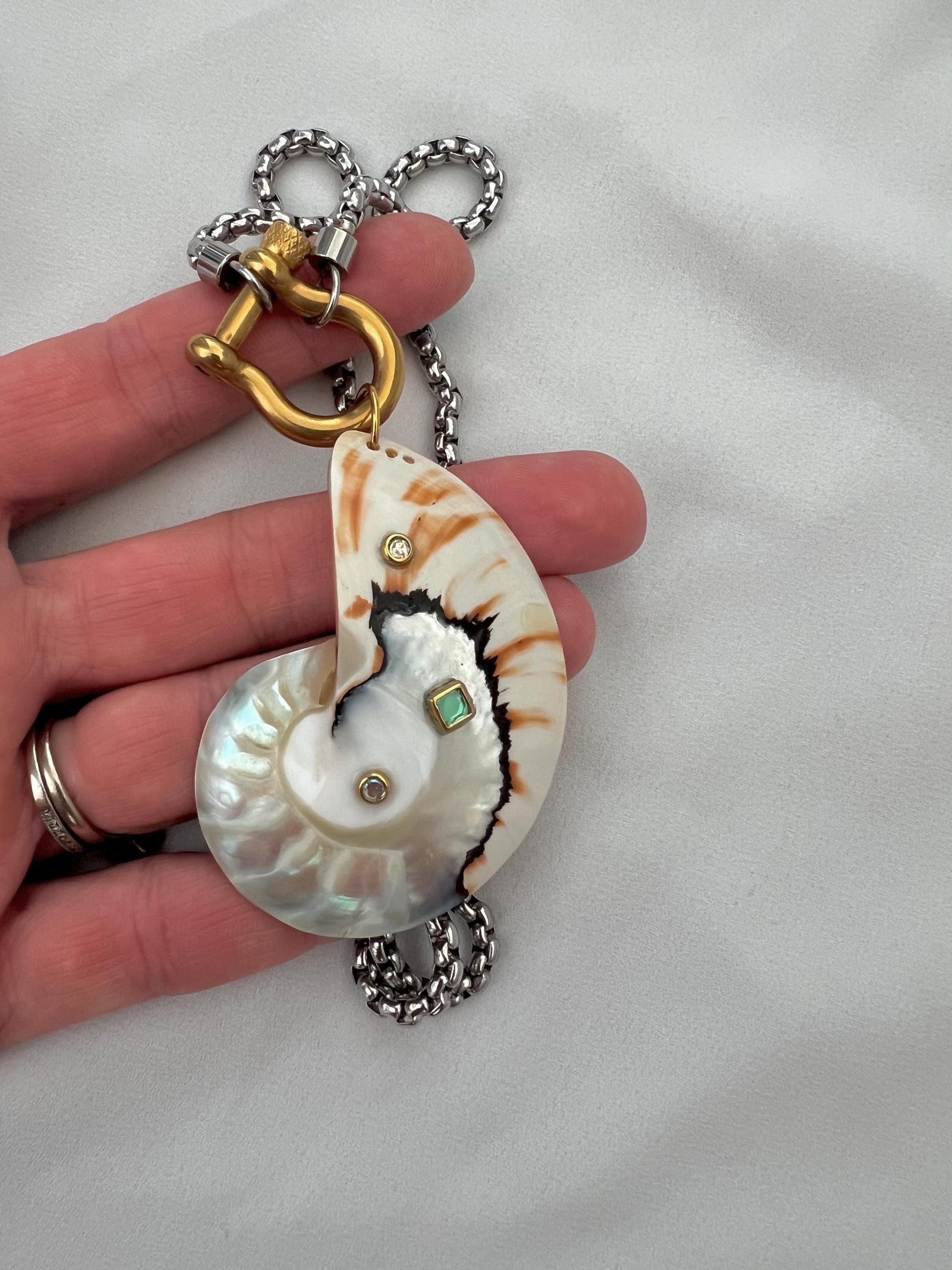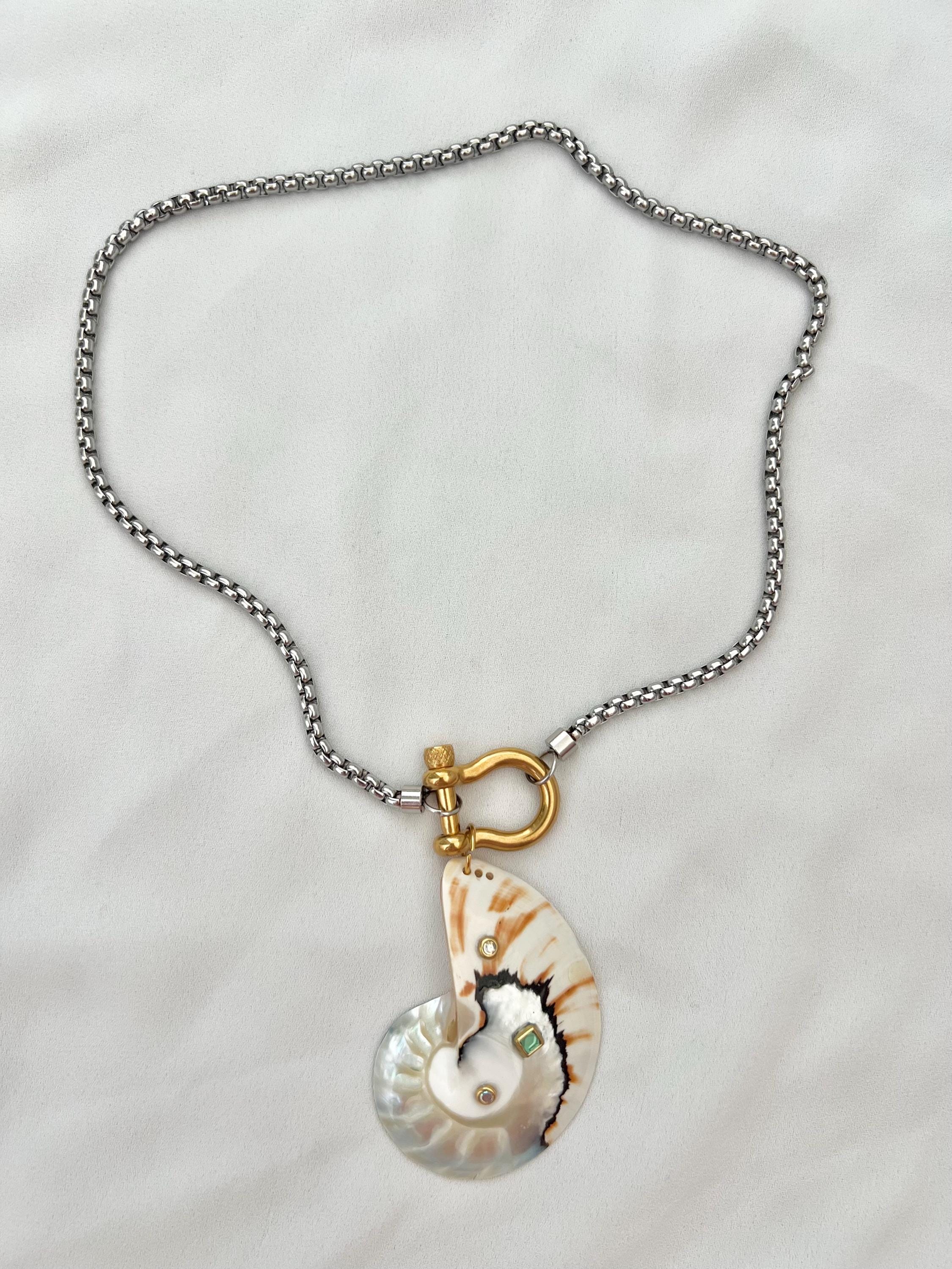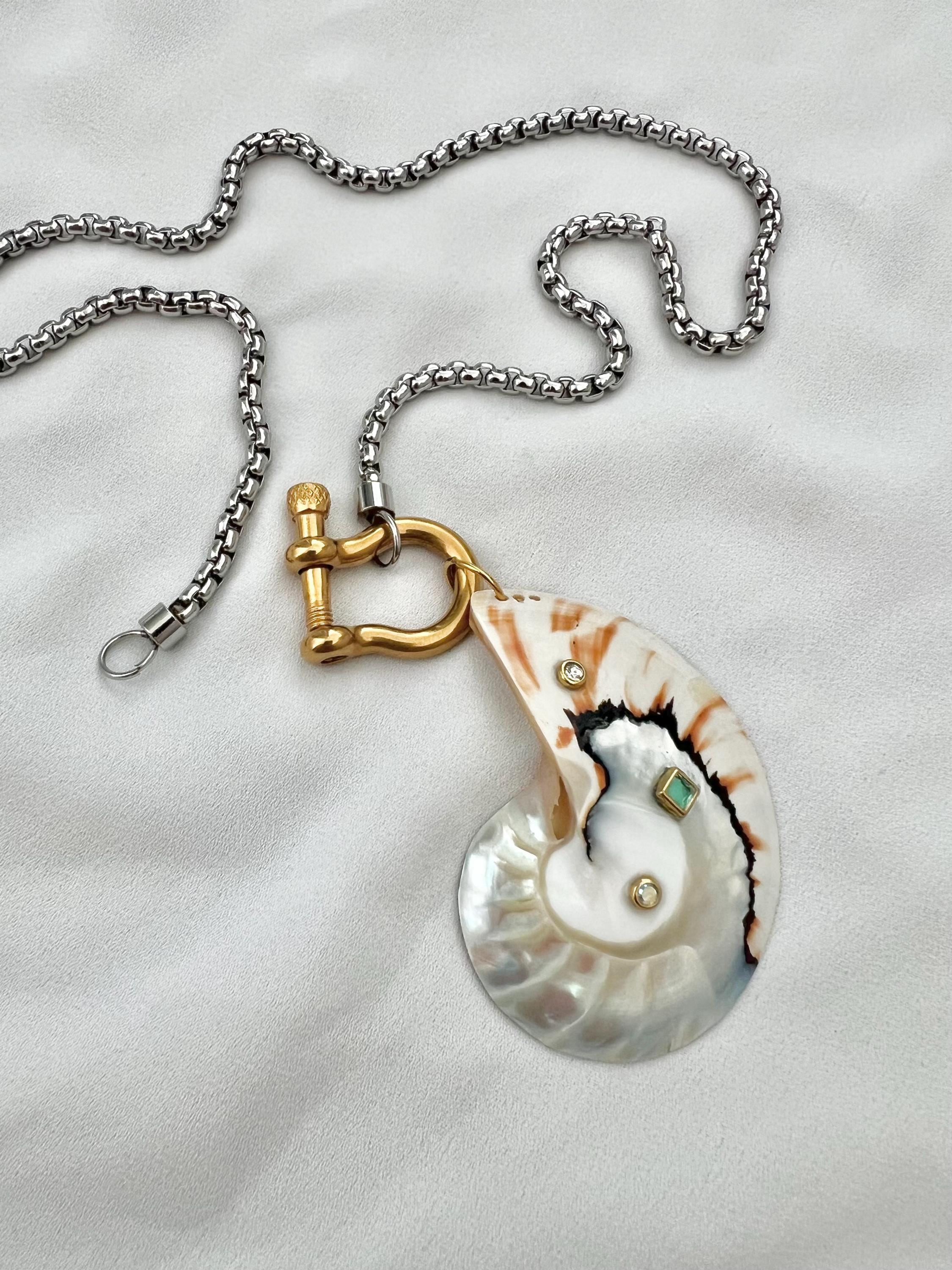 Embellished ice blue white large unique Nautilus shell horseshoe gold silver necklace
