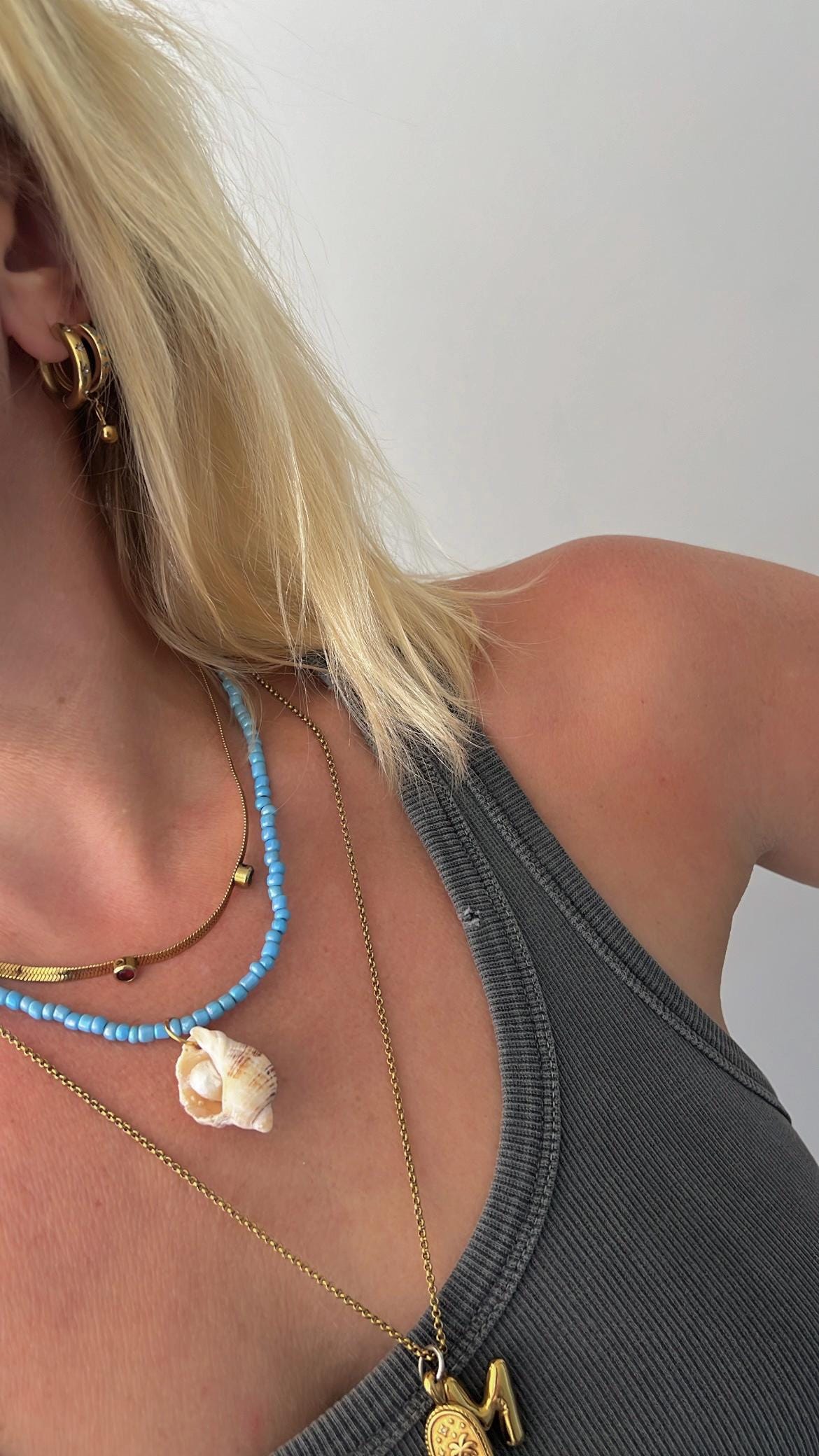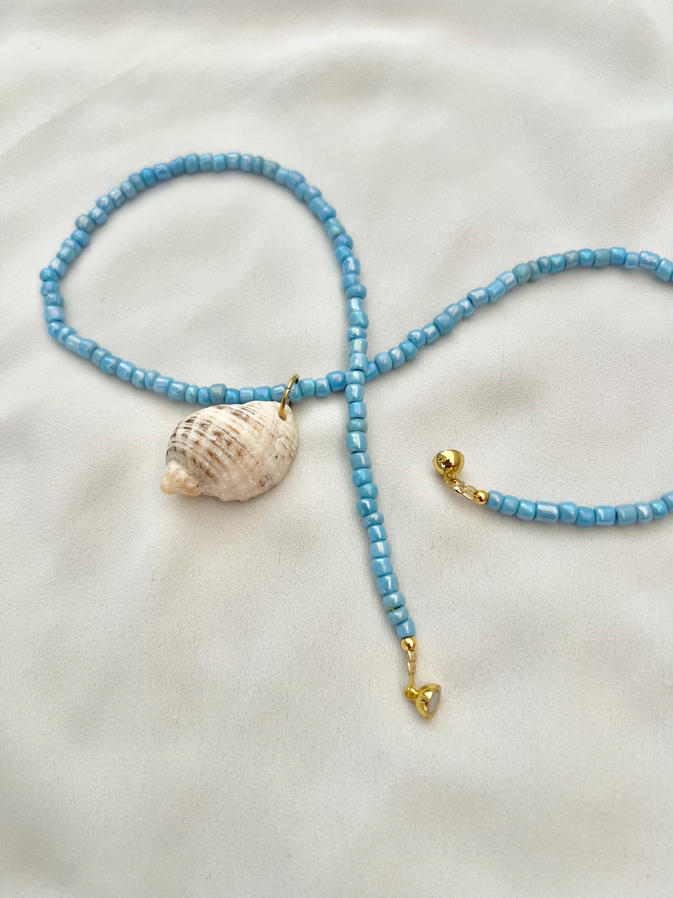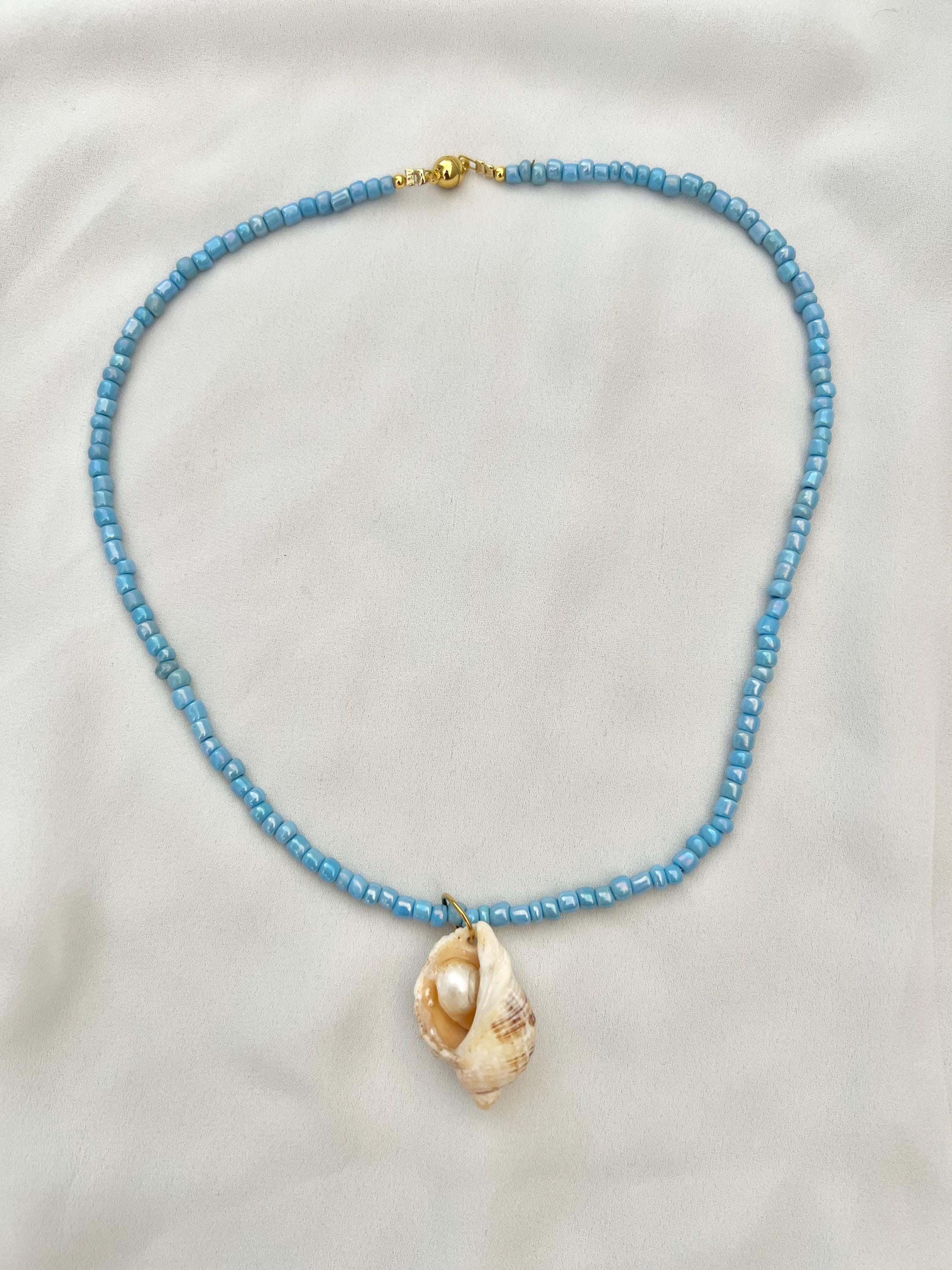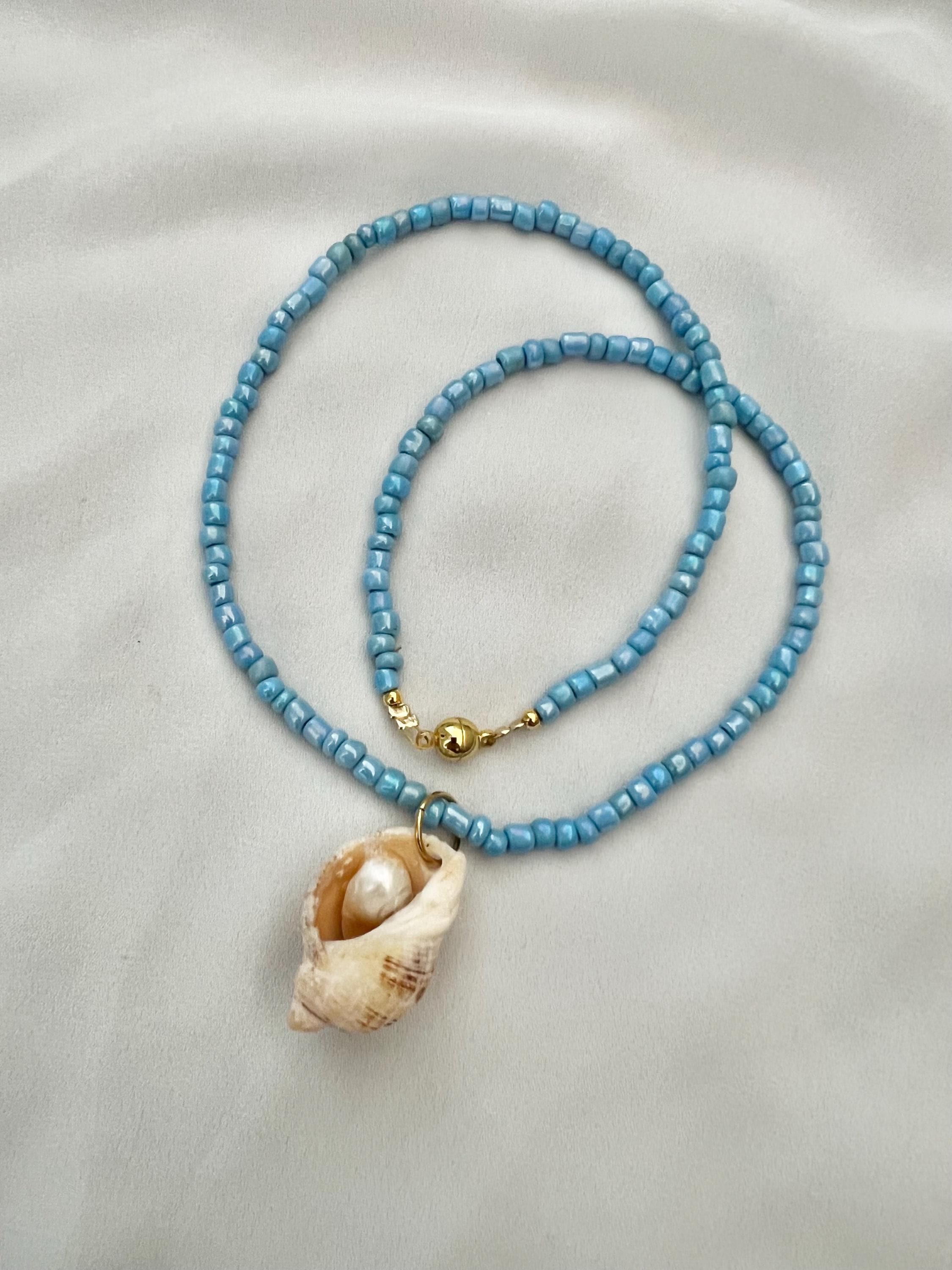 Pearl in shell sky blue seed bead magnetic lock necklace