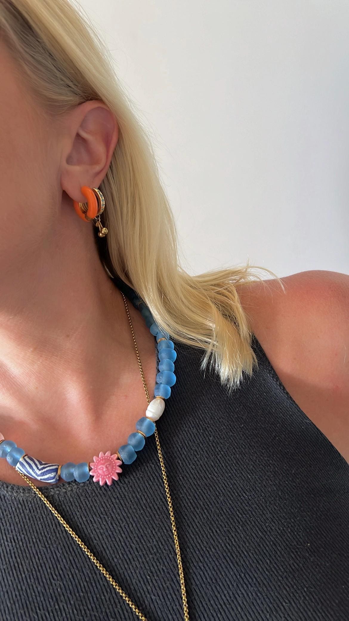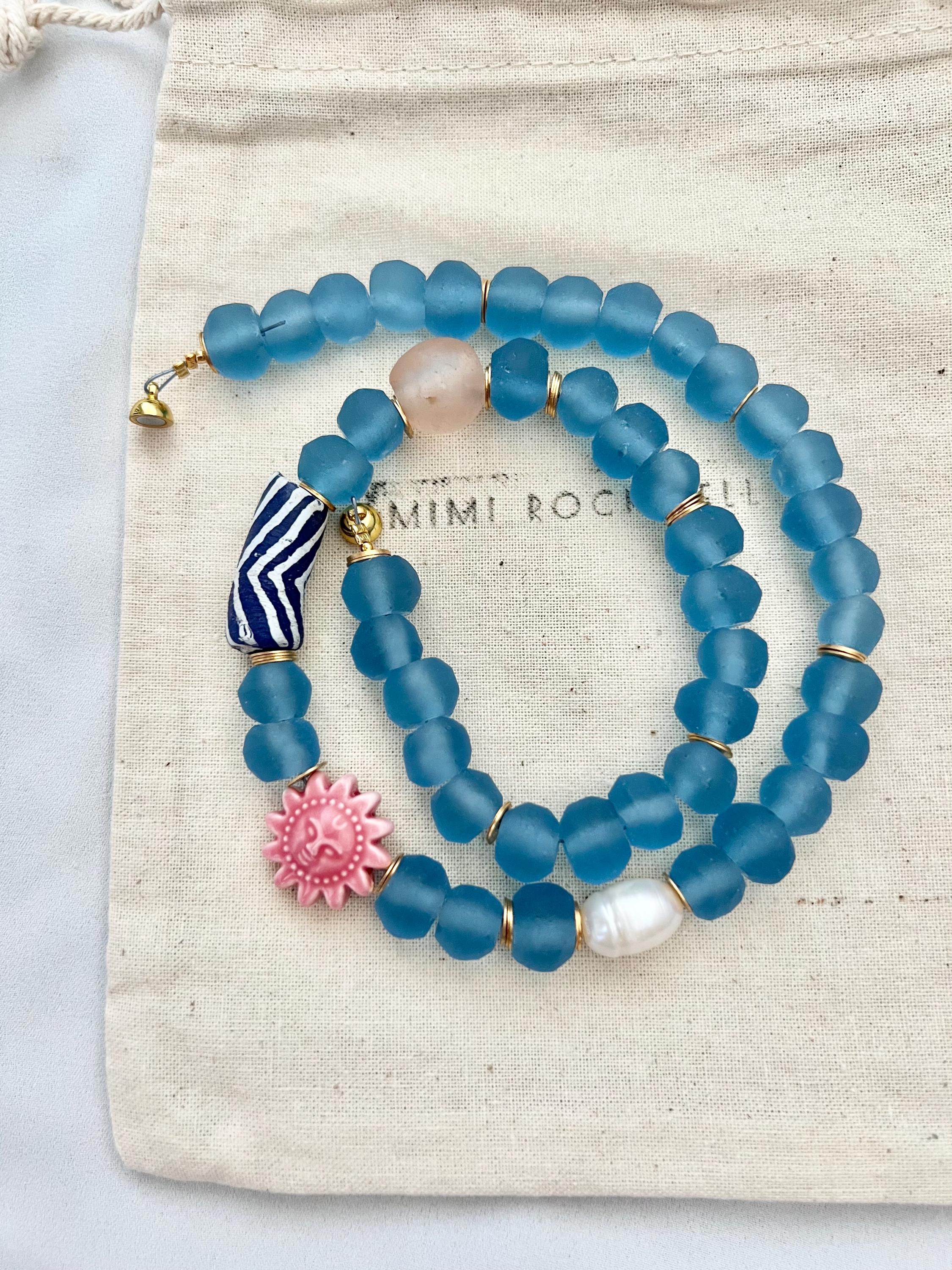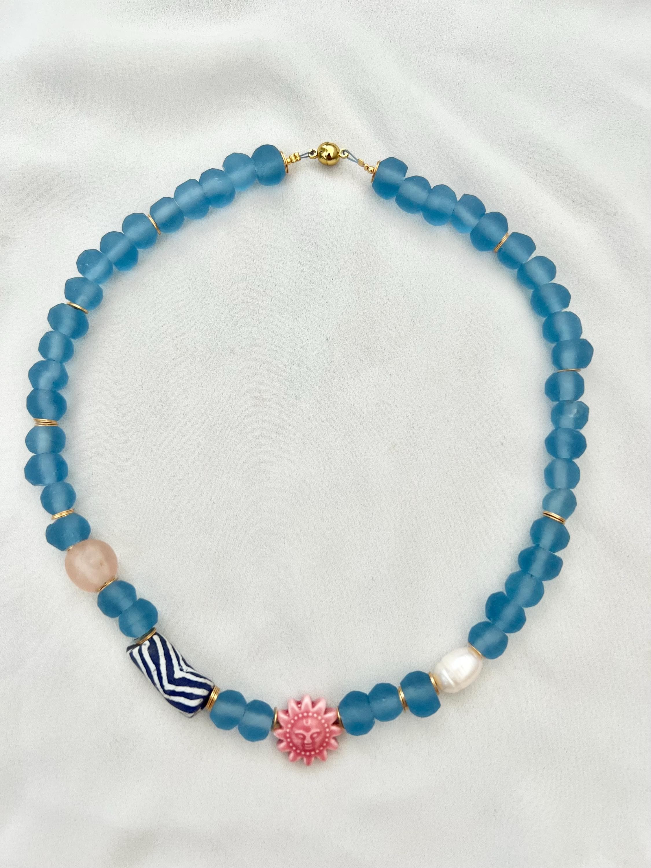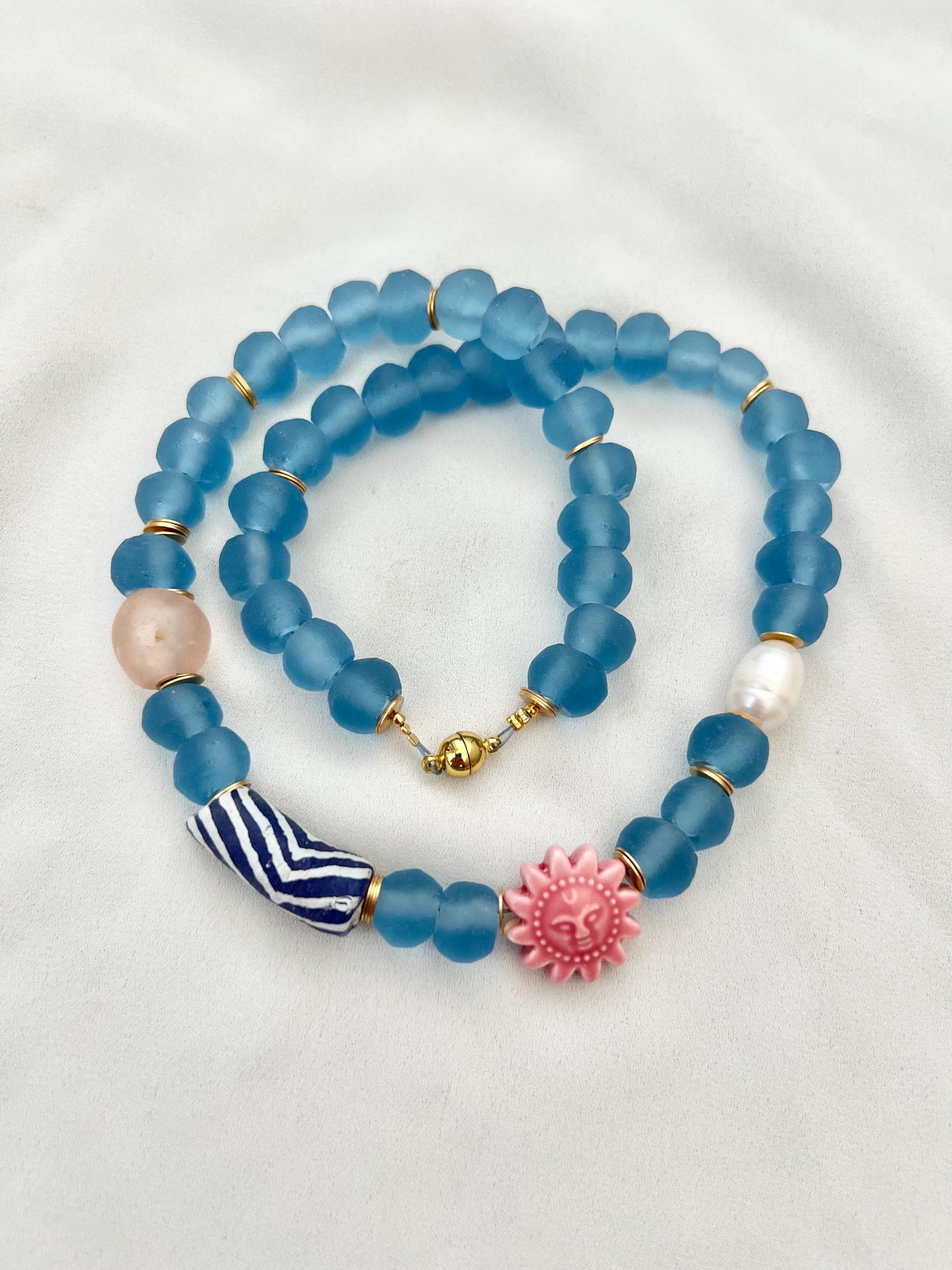 Recycled African glass blue pearl pink sun magnetic lock gold necklace