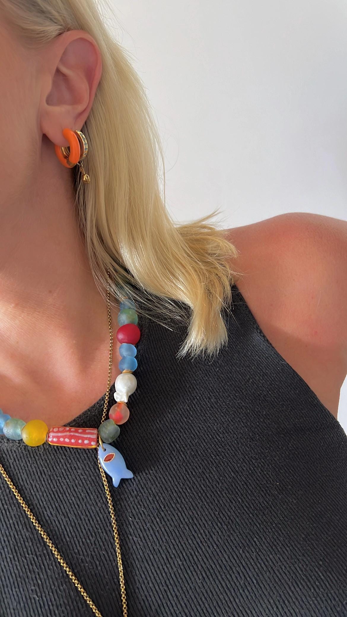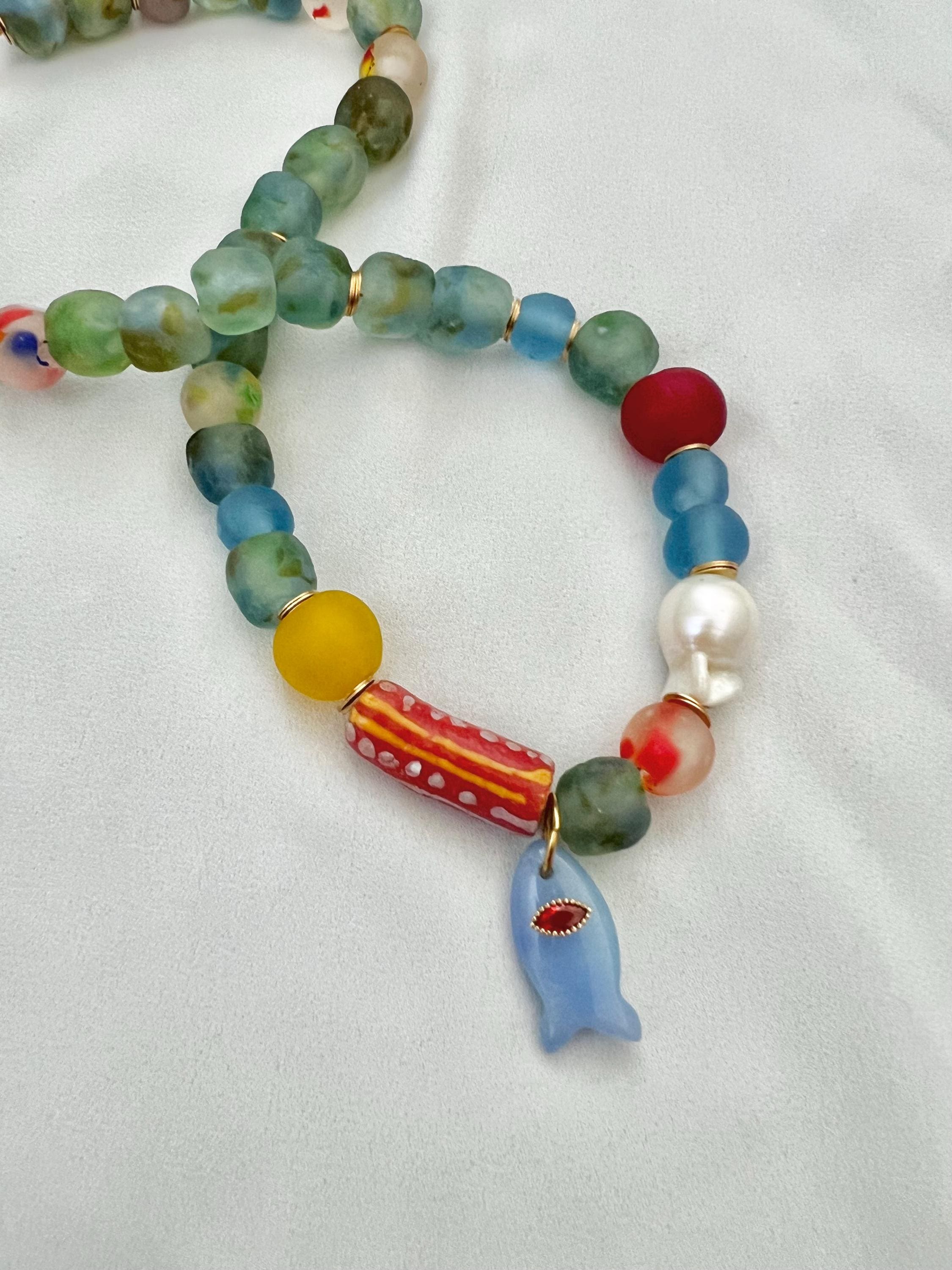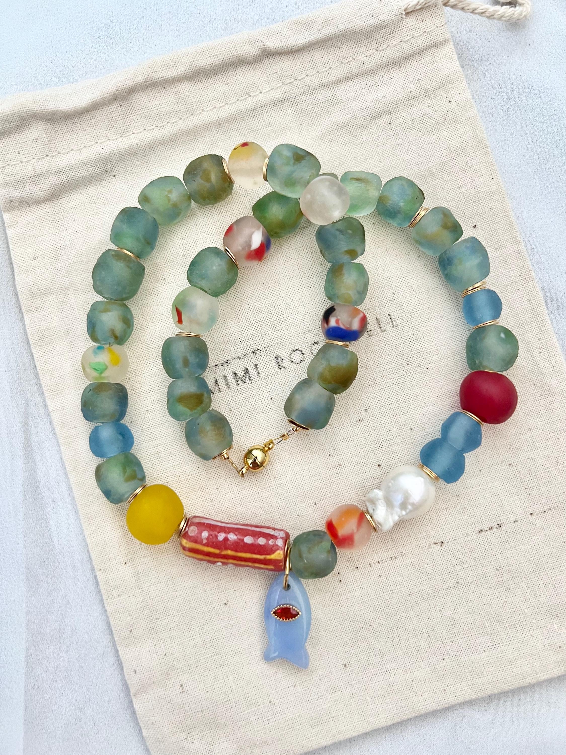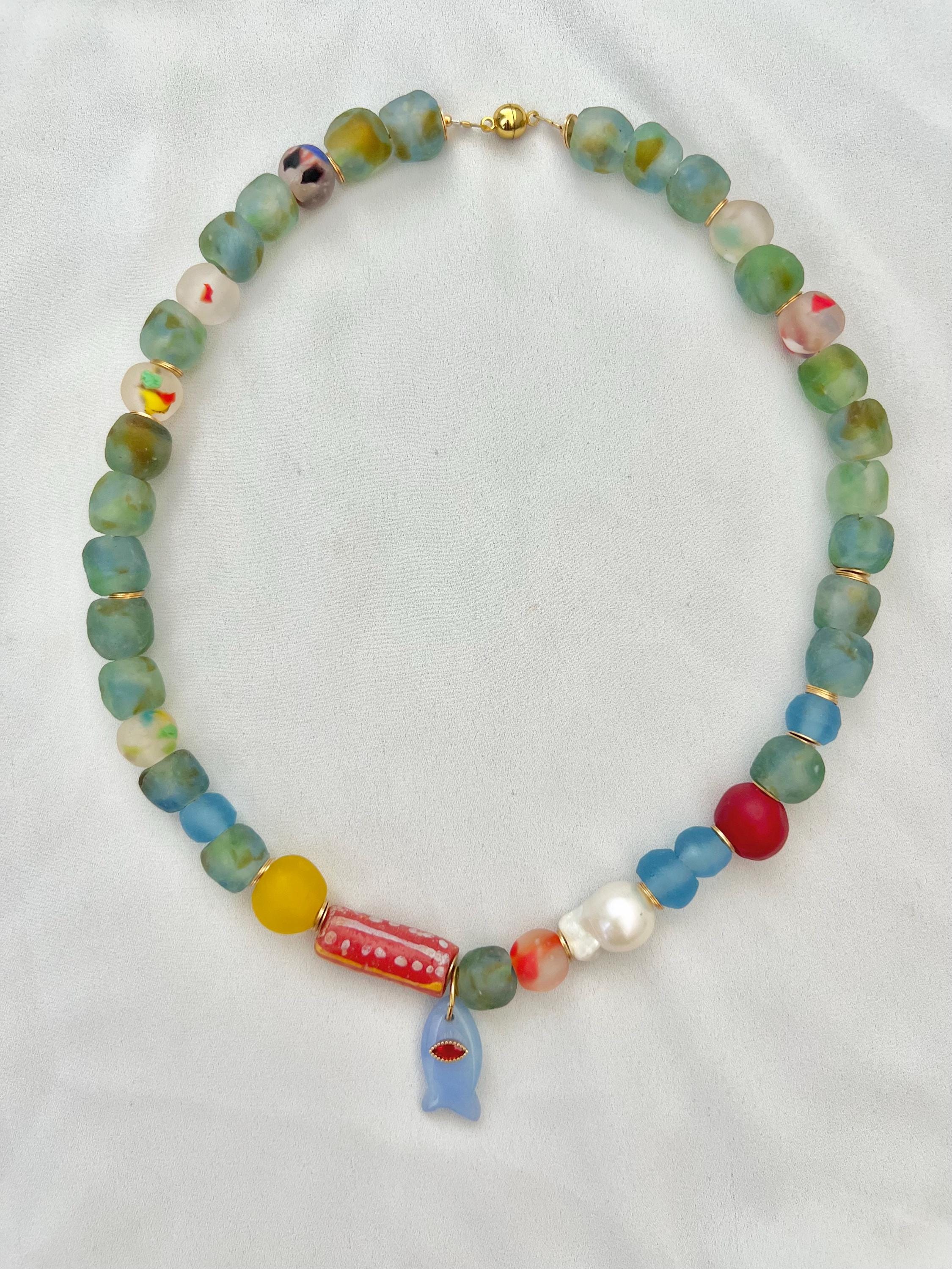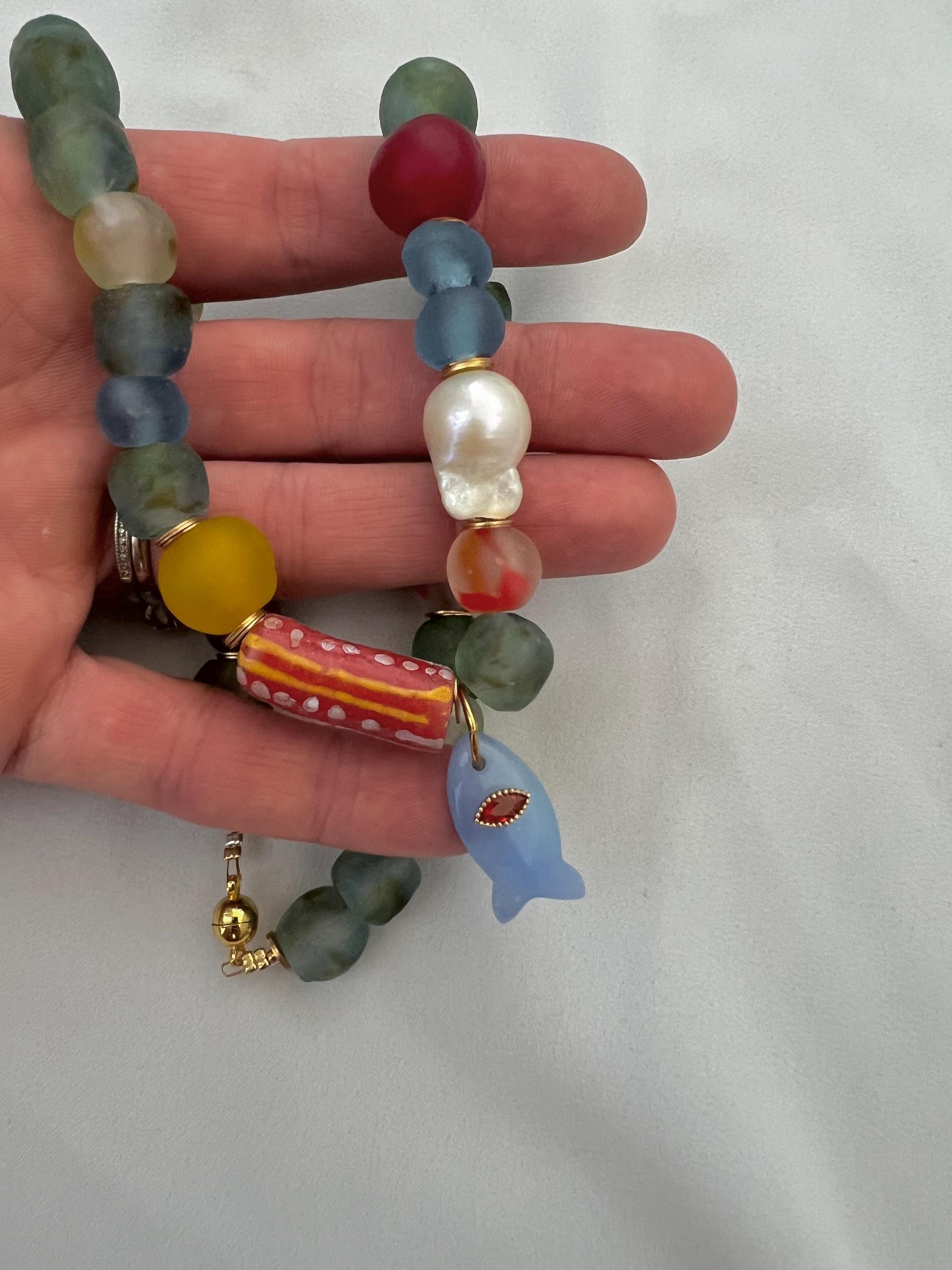 Baroque pearl recycled African glass fish pendant magnetic lock gold necklace