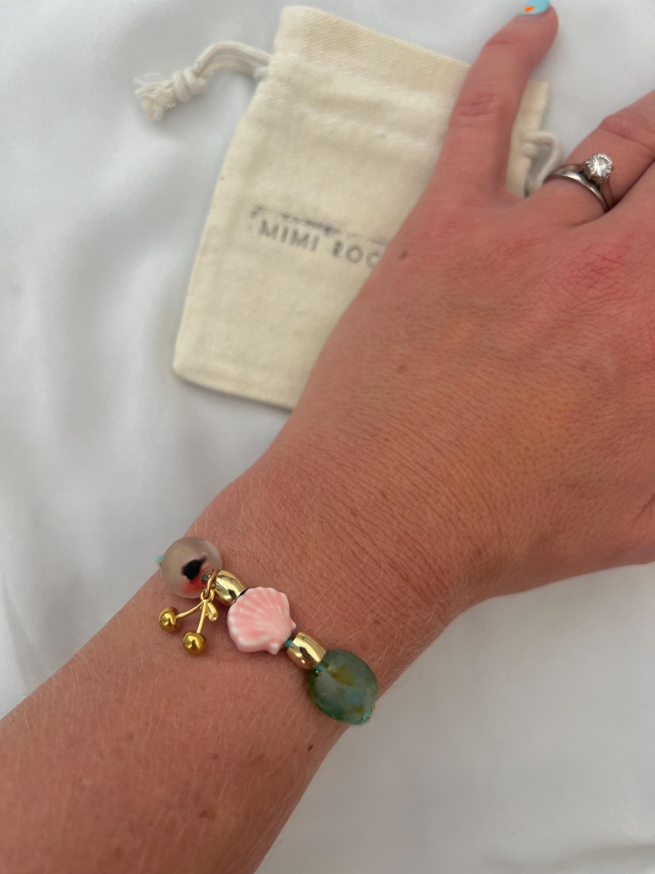 Recycled African glass shell cherry green string gold bracelet