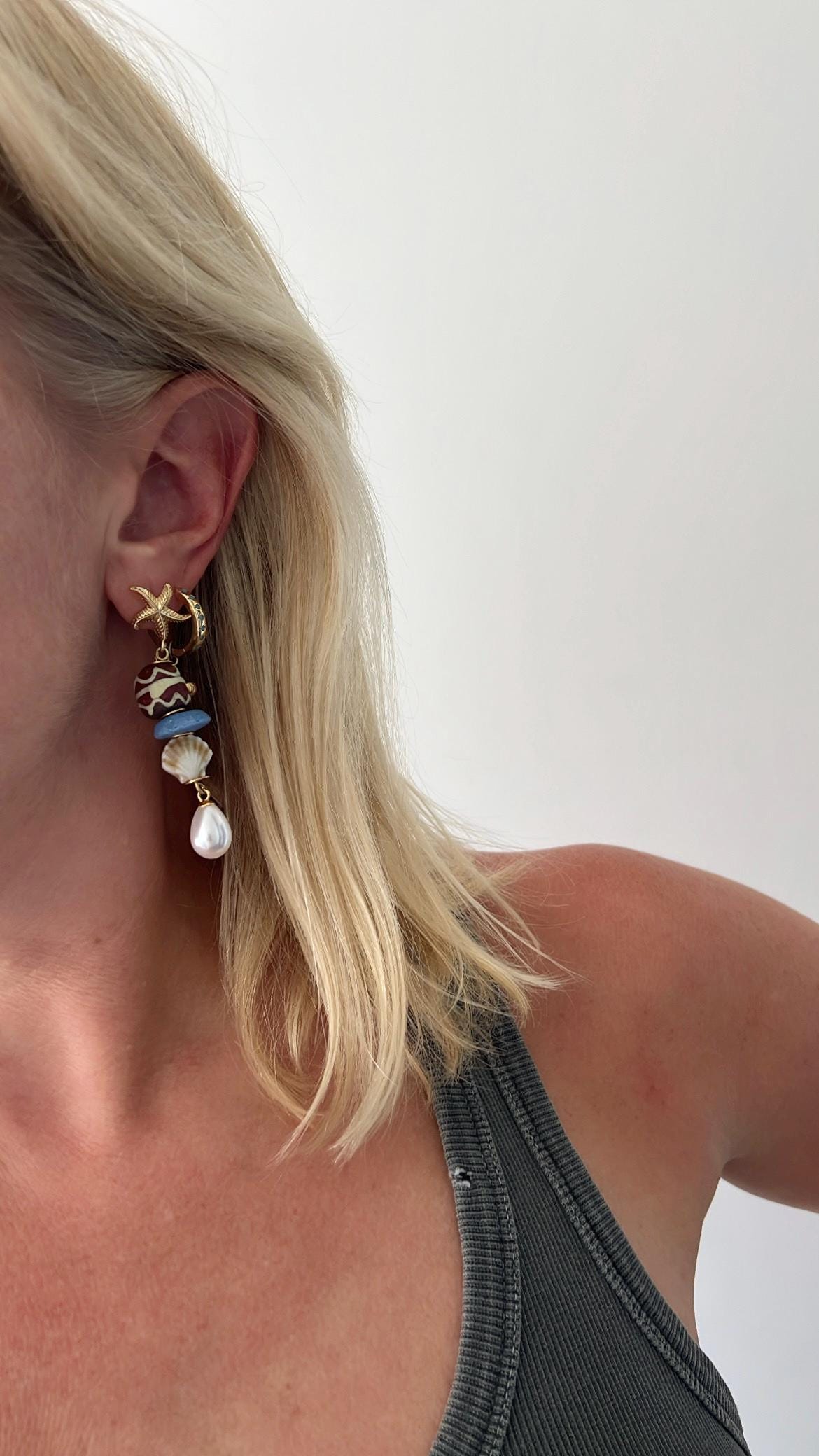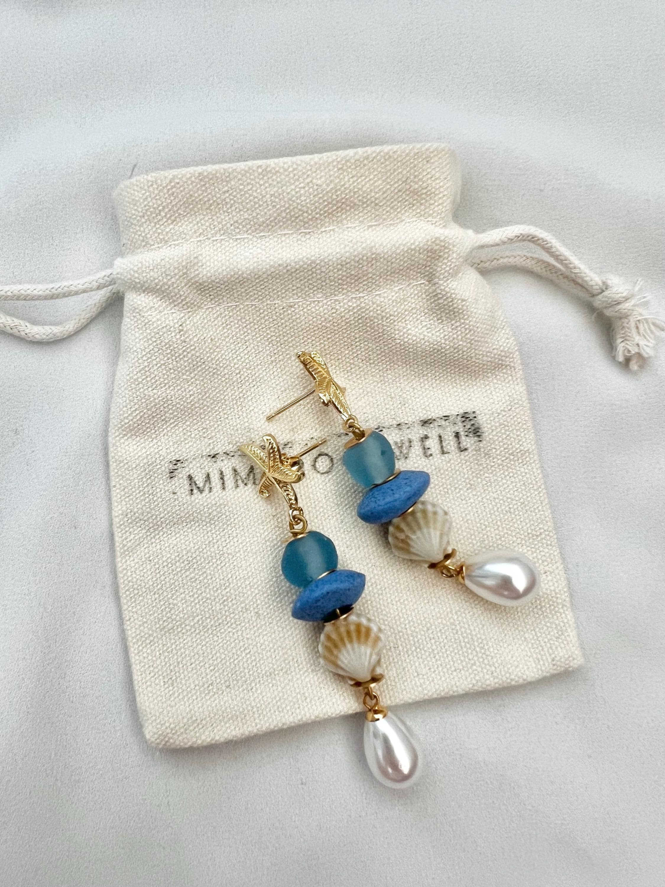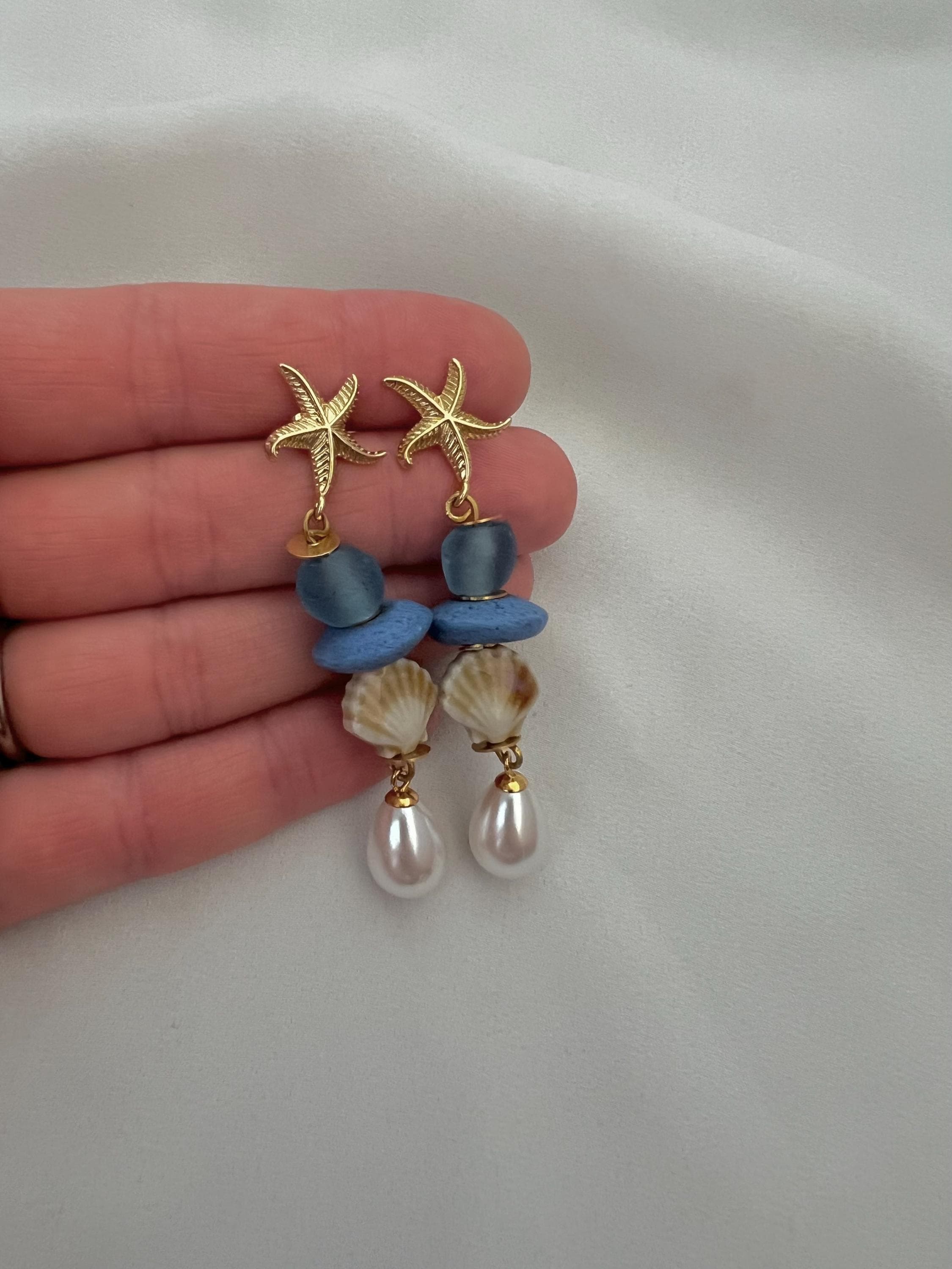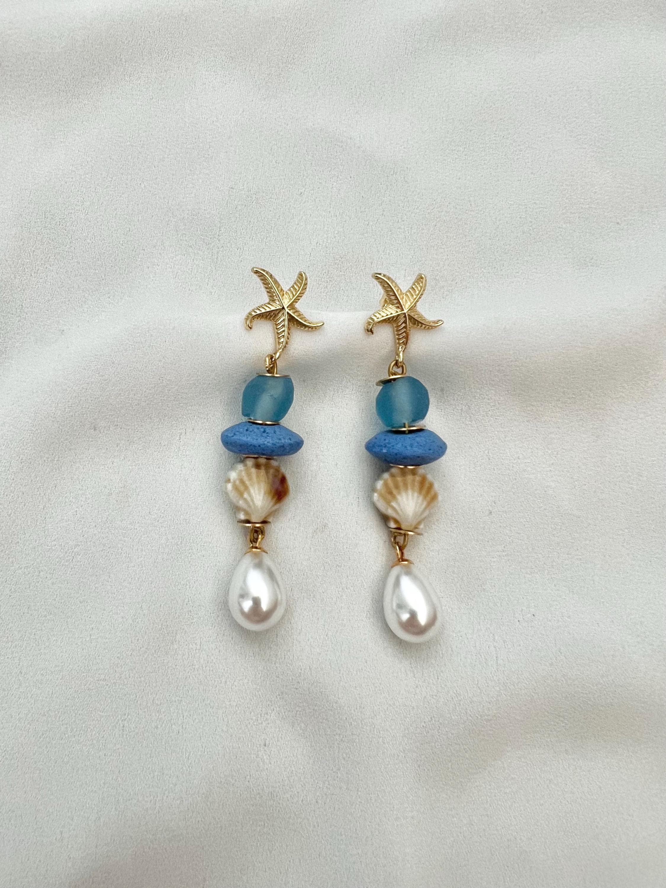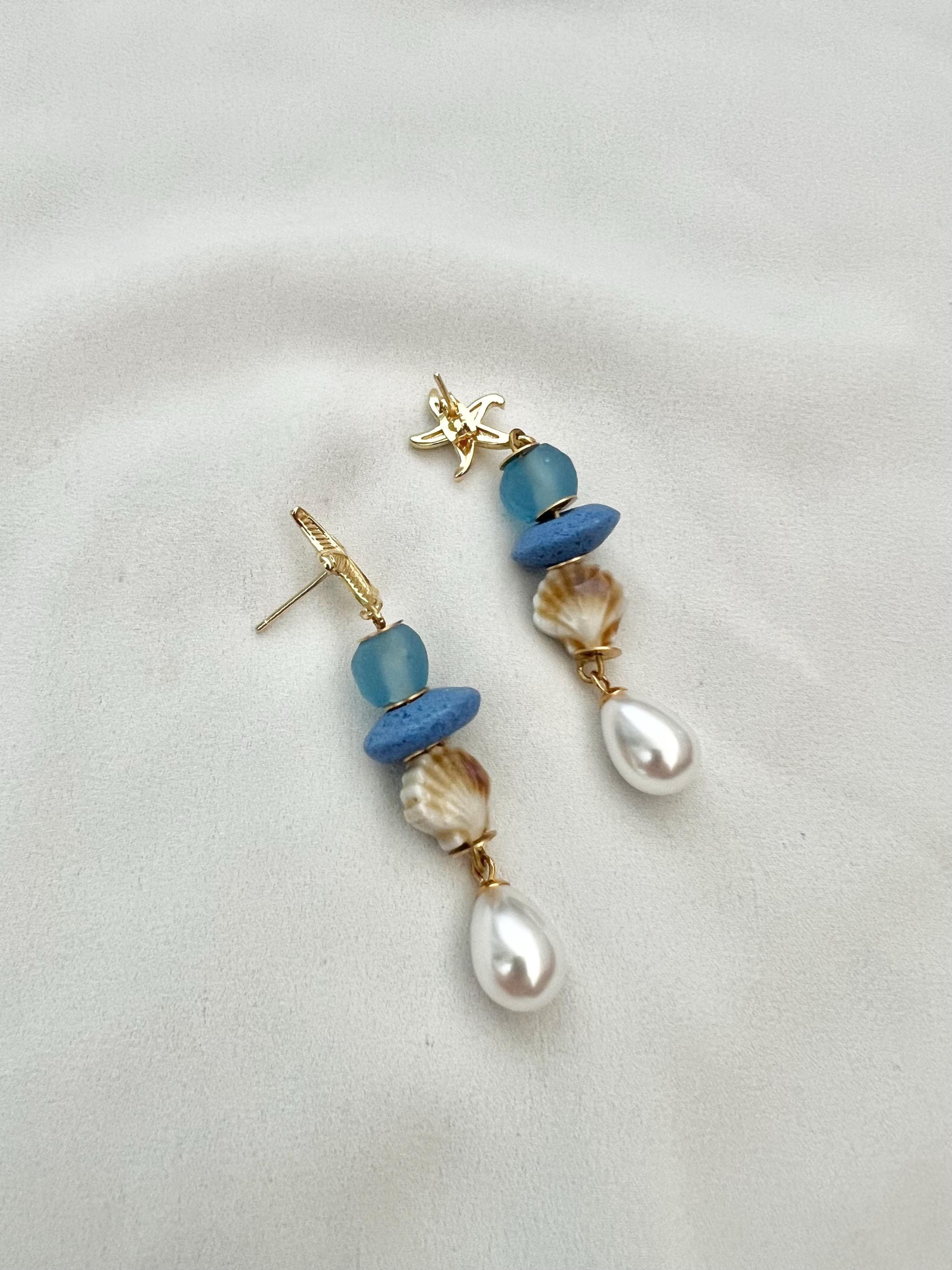 Blue recycled glass shell pearl starfish stud dangle drop gold earrings