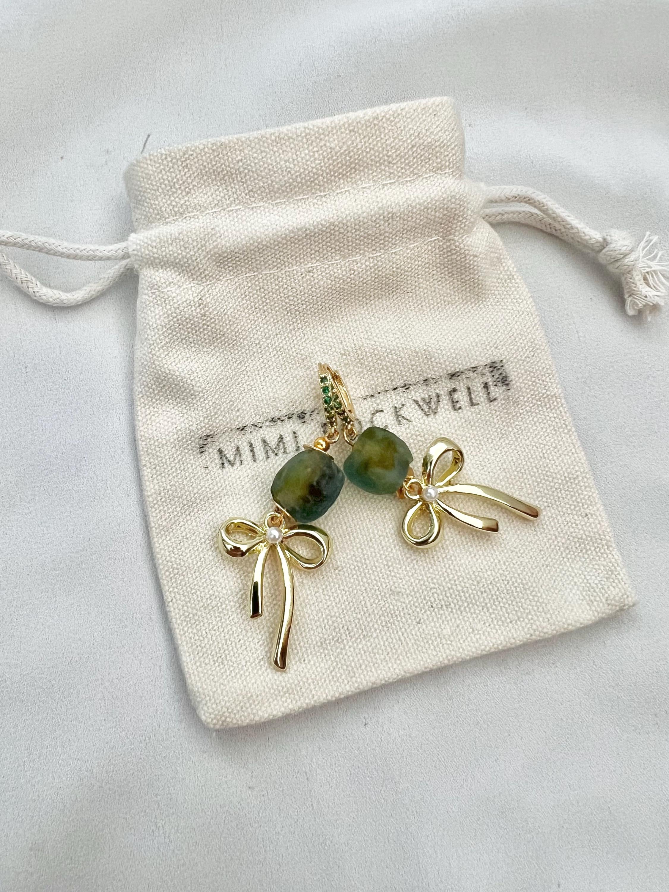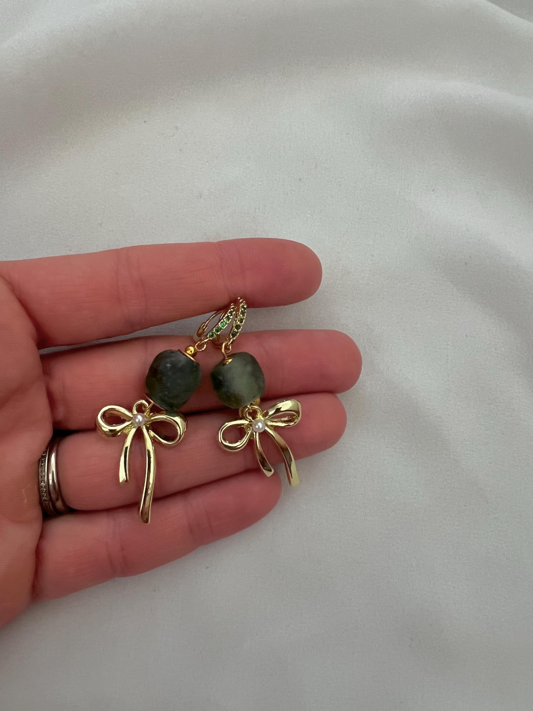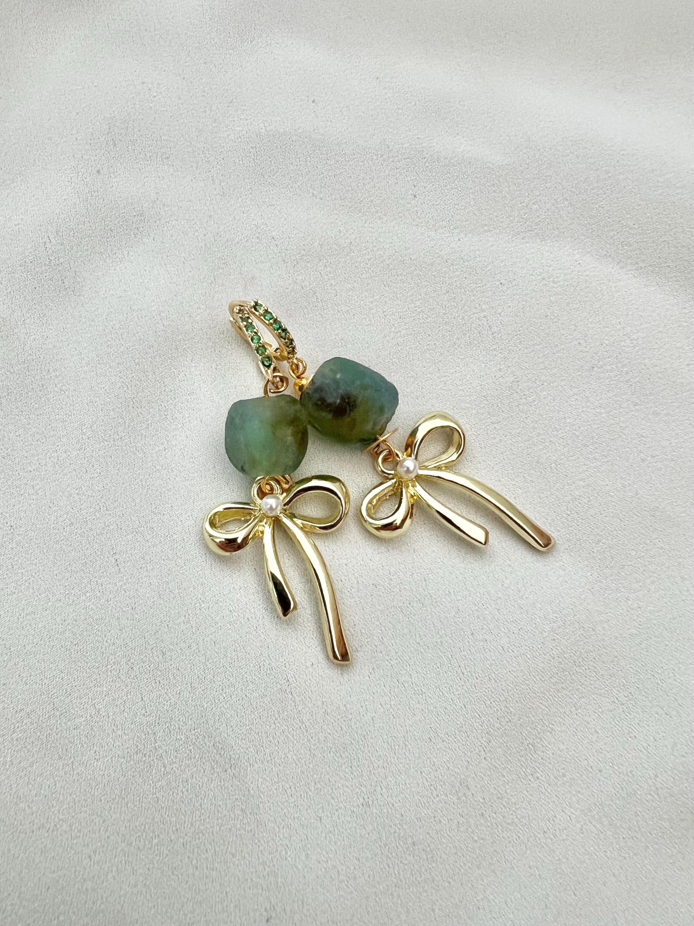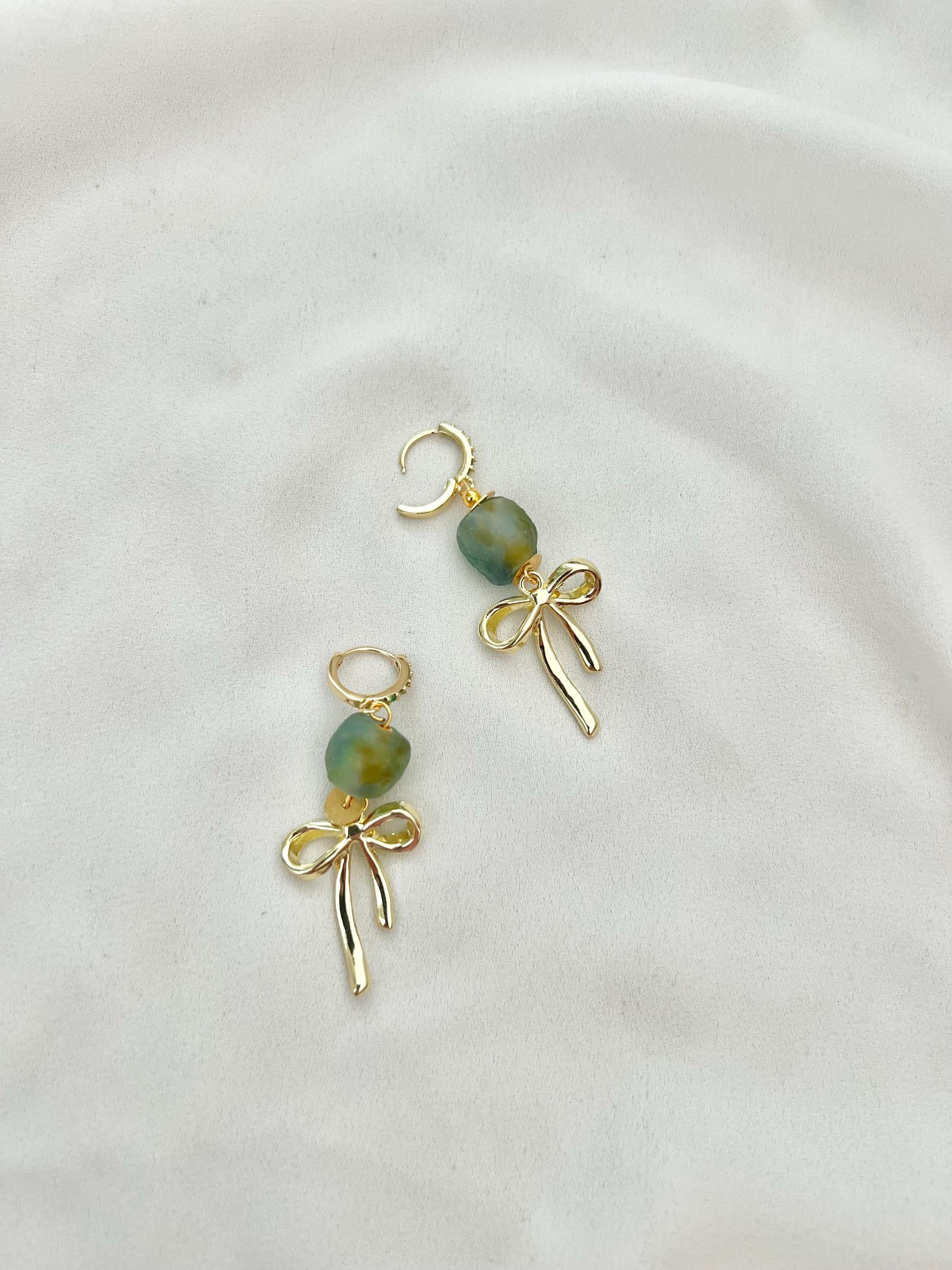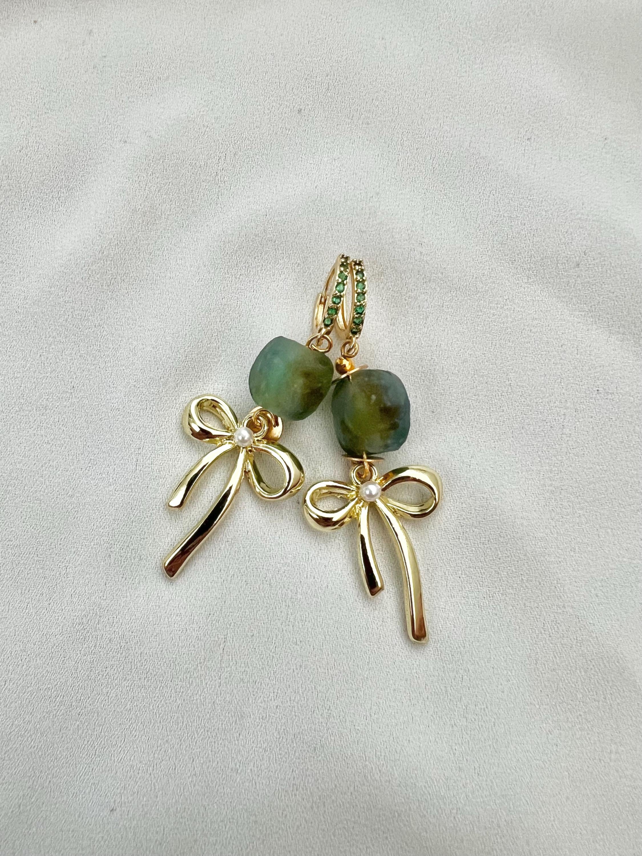Bow glass bead green cubic zirconia stone mini huggie hoops