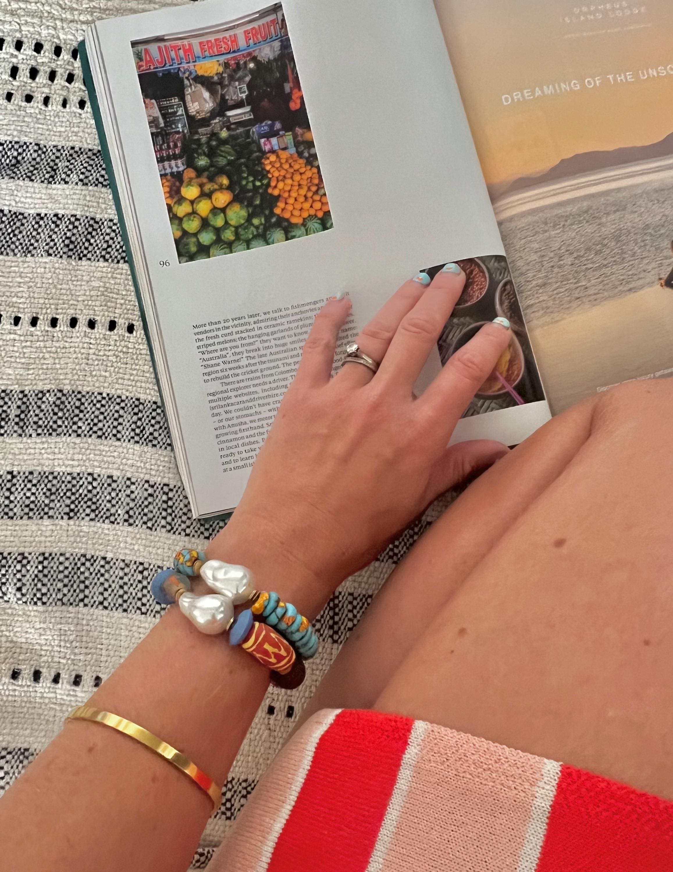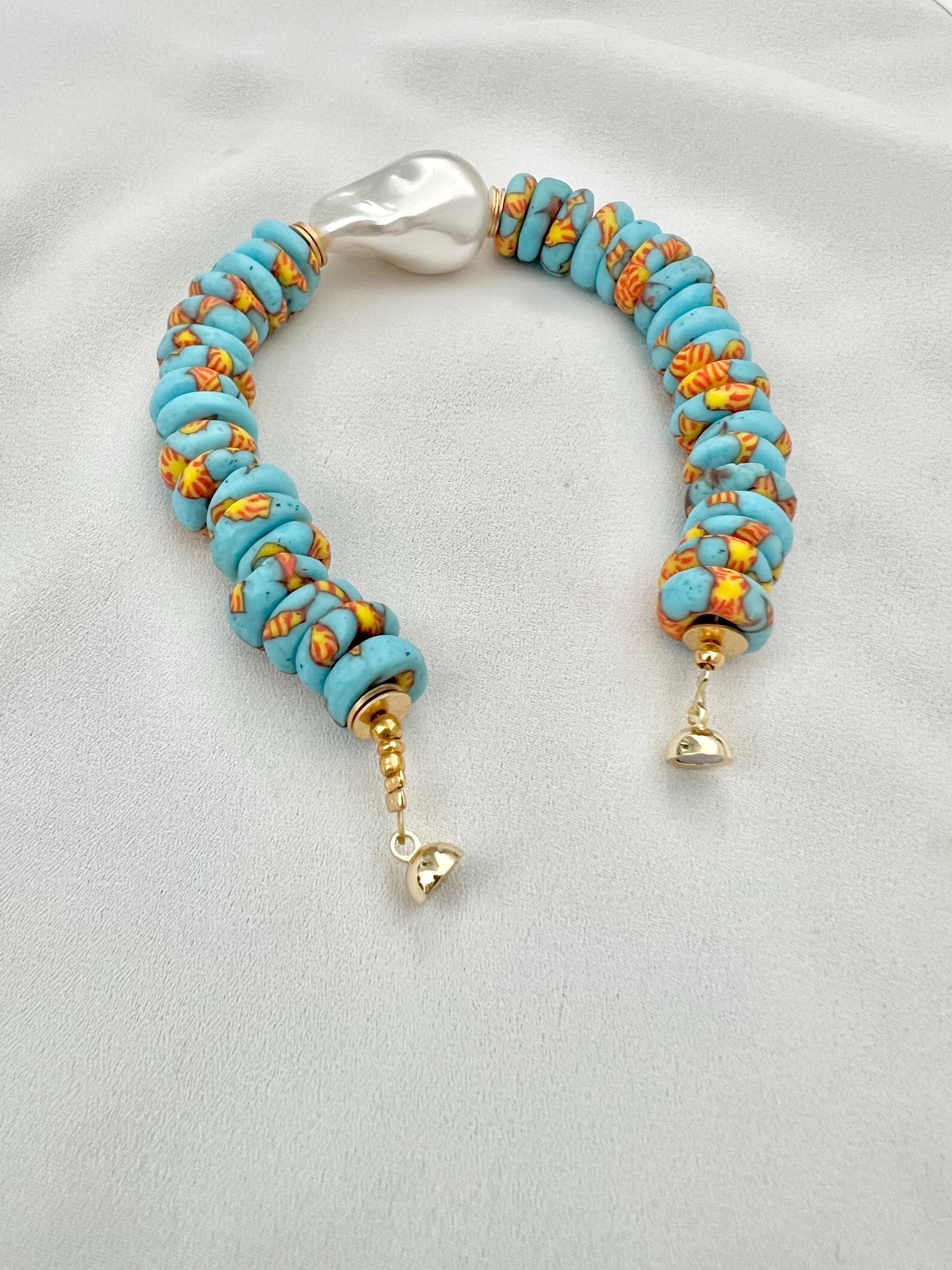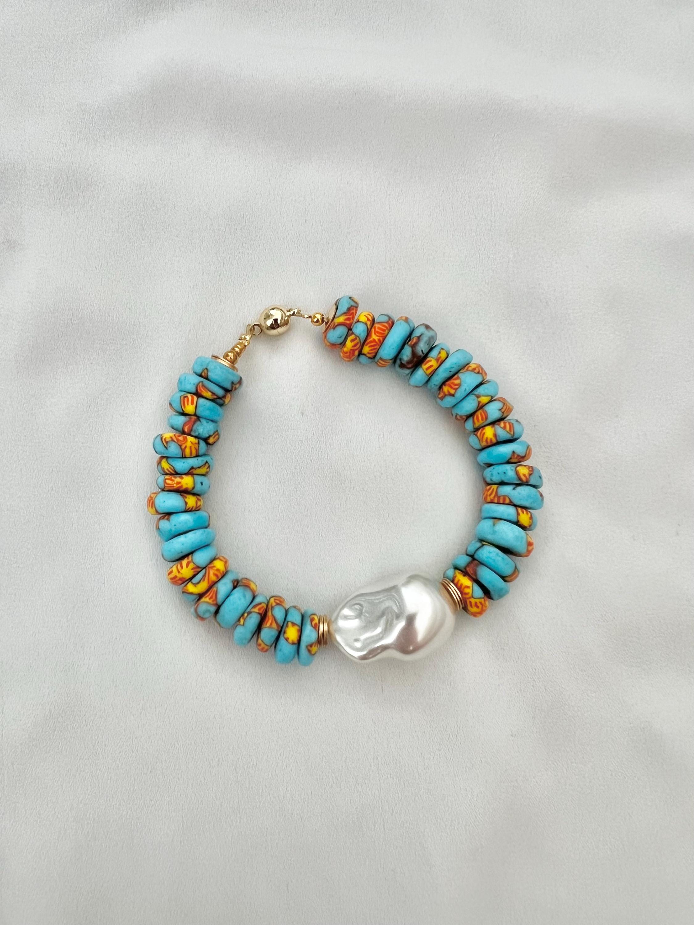Blue and orange recycled African rondelle glass Baroque pearl bracelet