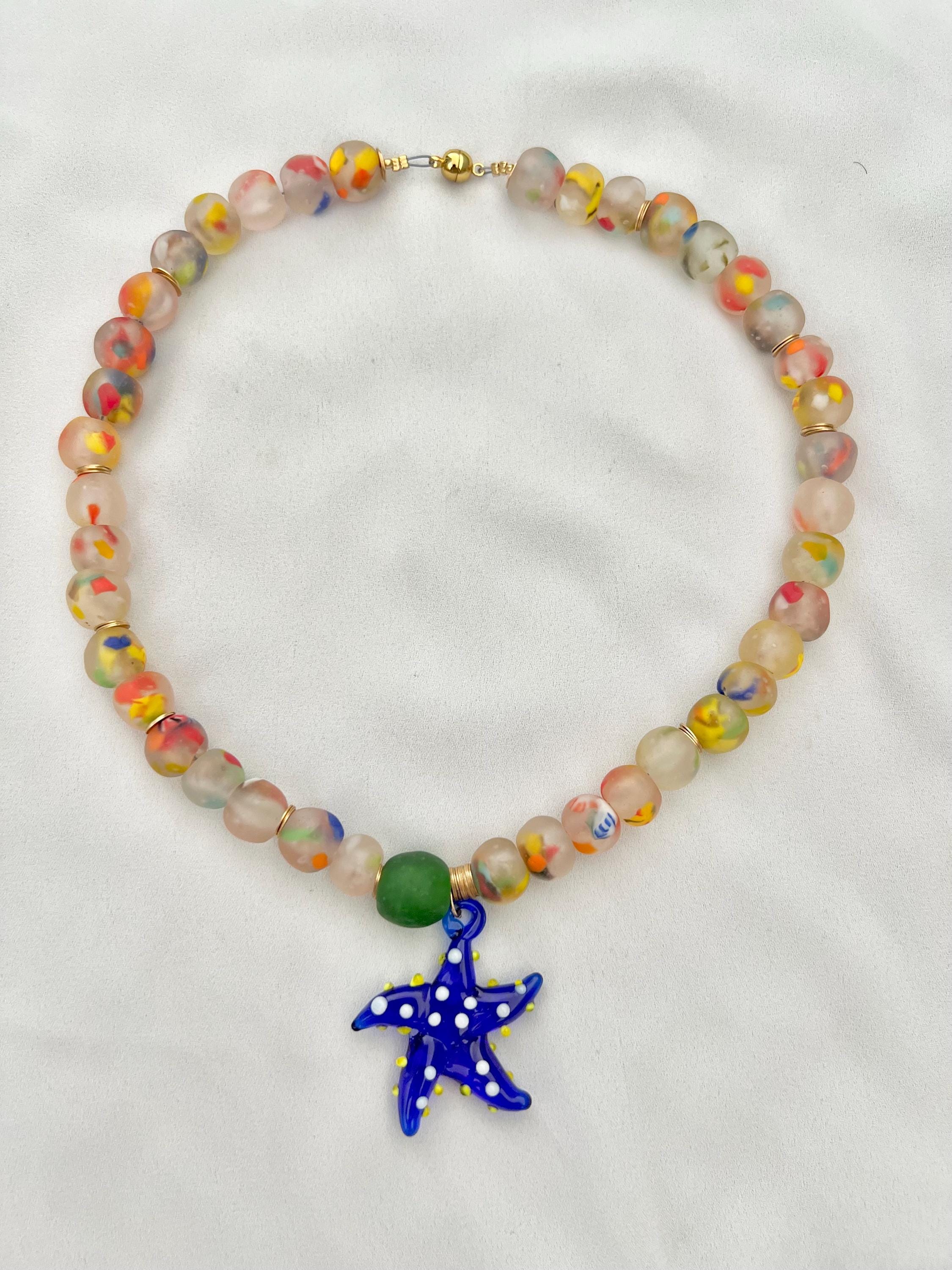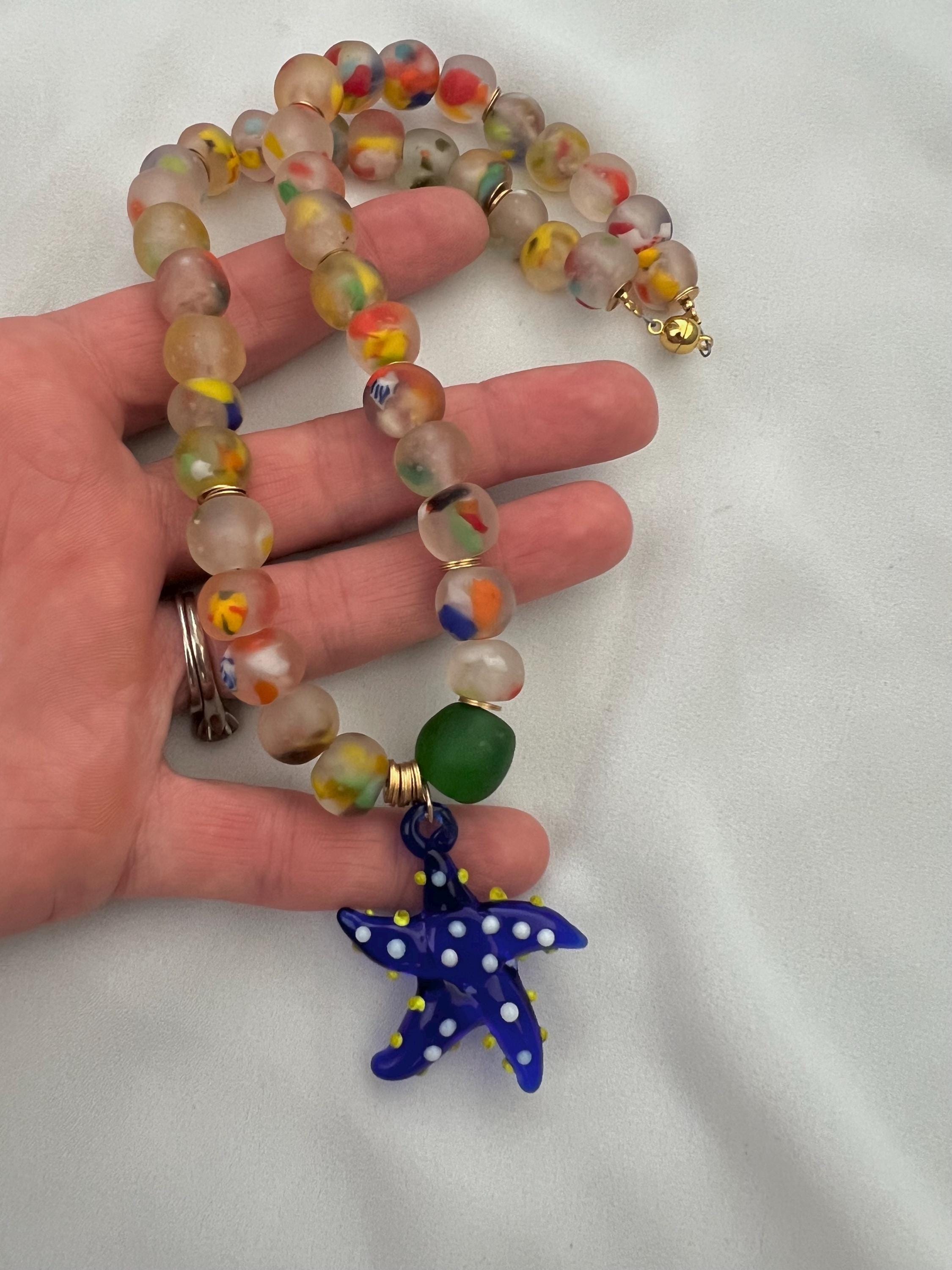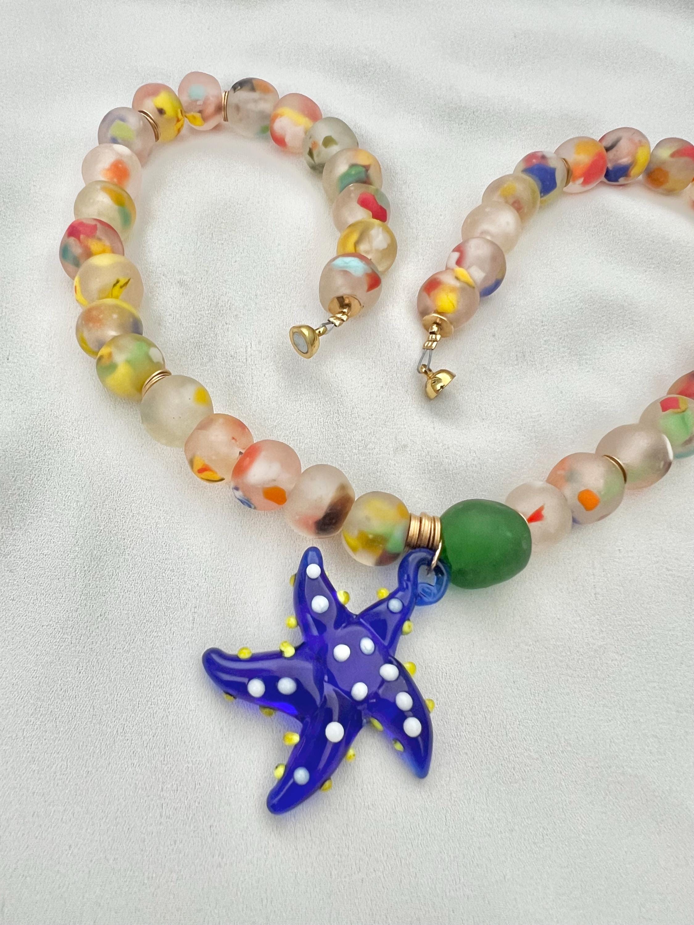 Rainbow speckled recycled African glass blue glass starfish magnetic lock gold necklace