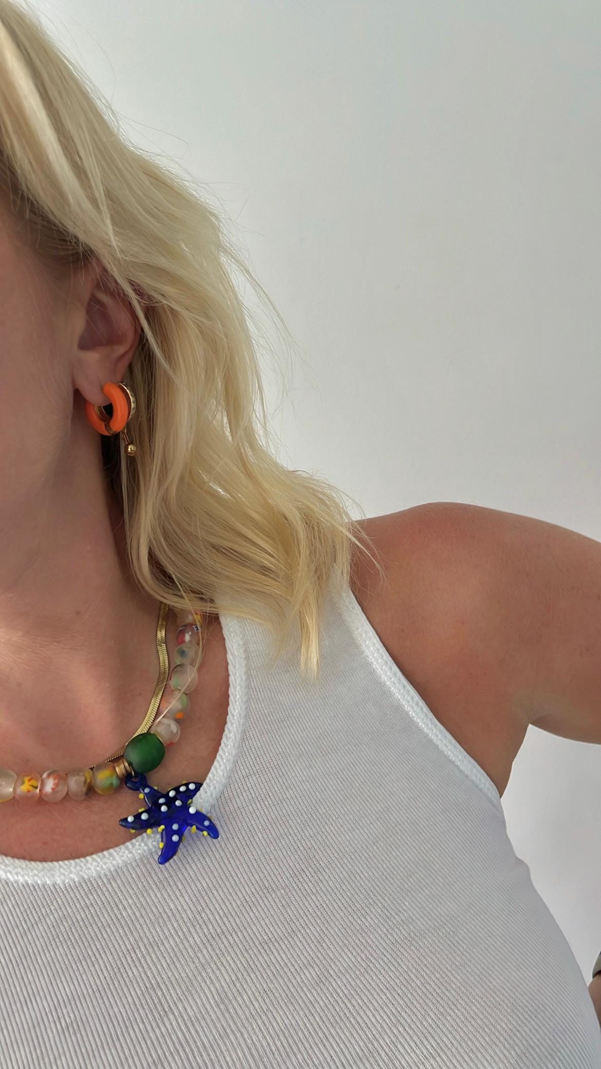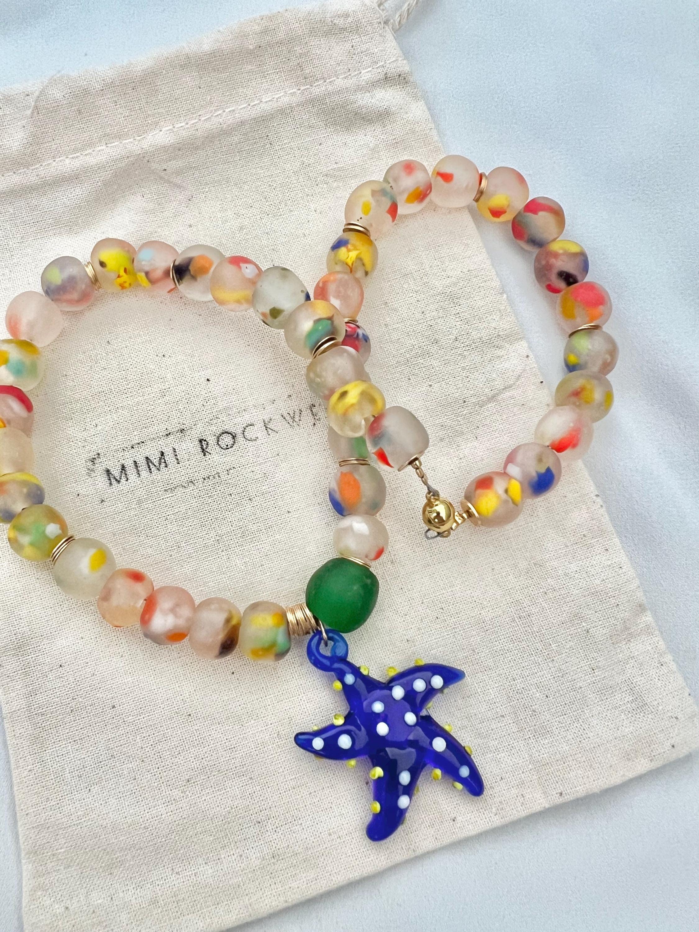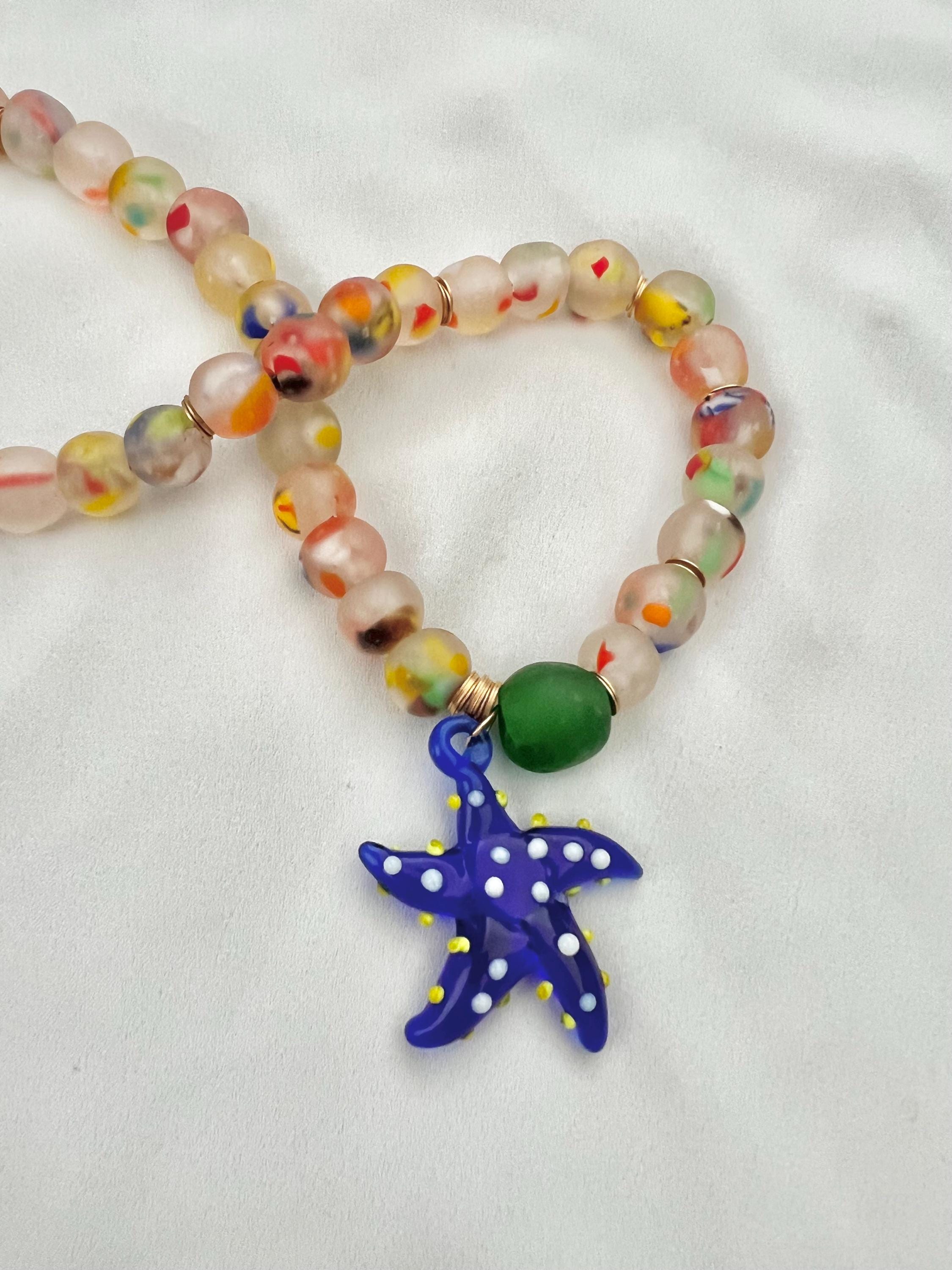 Rainbow speckled recycled African glass blue glass starfish magnetic lock gold necklace