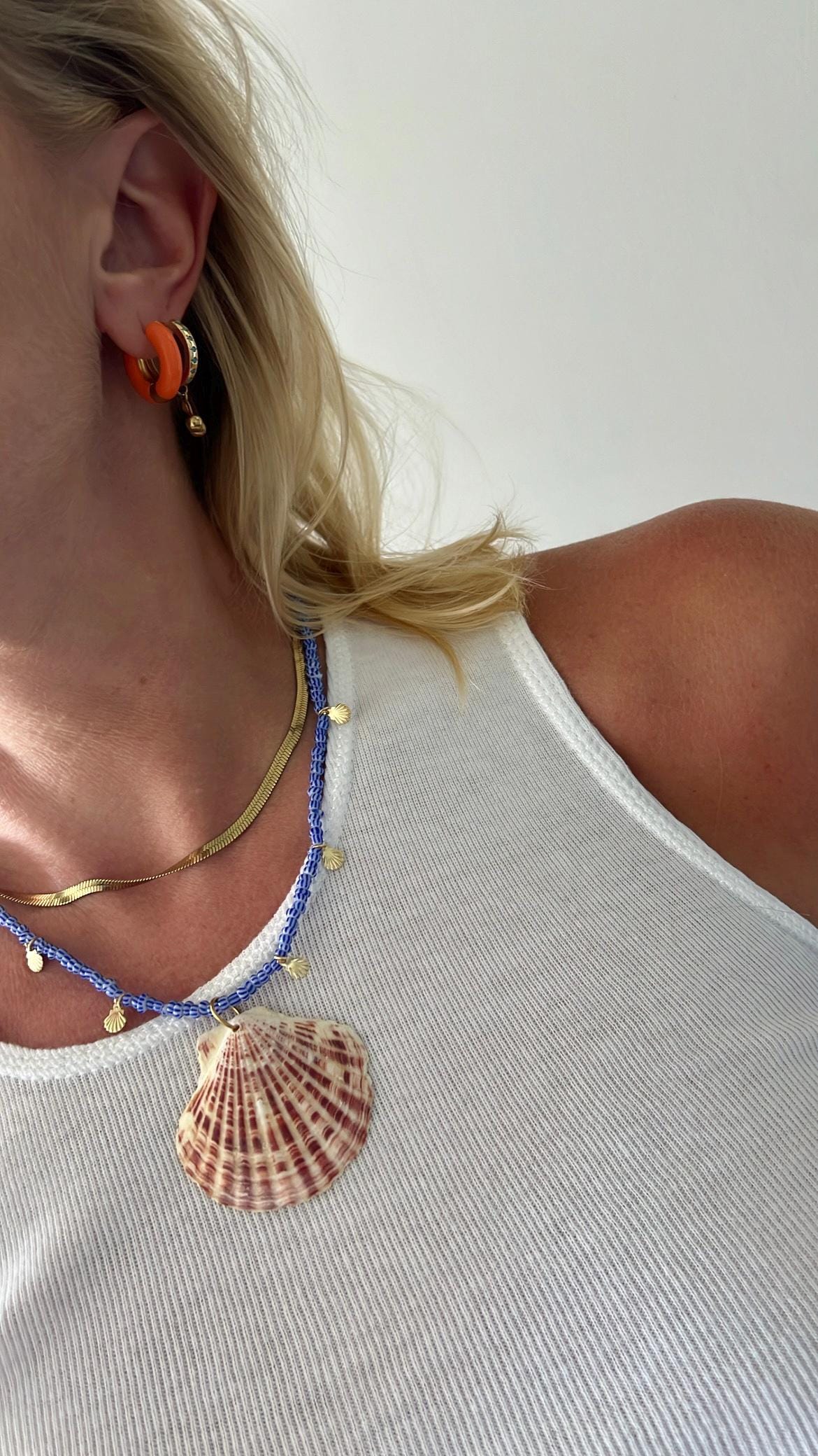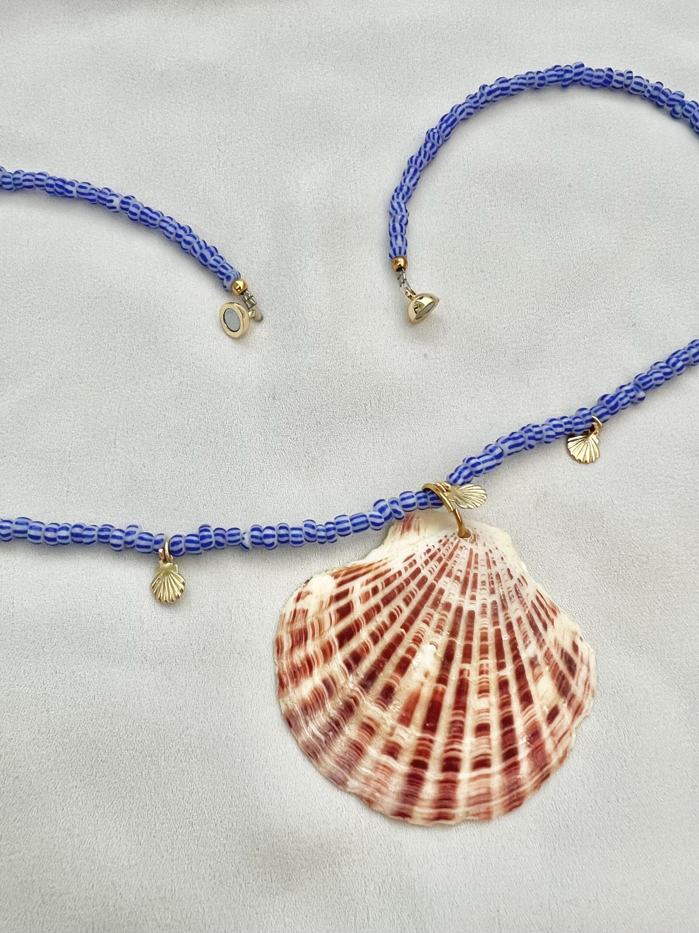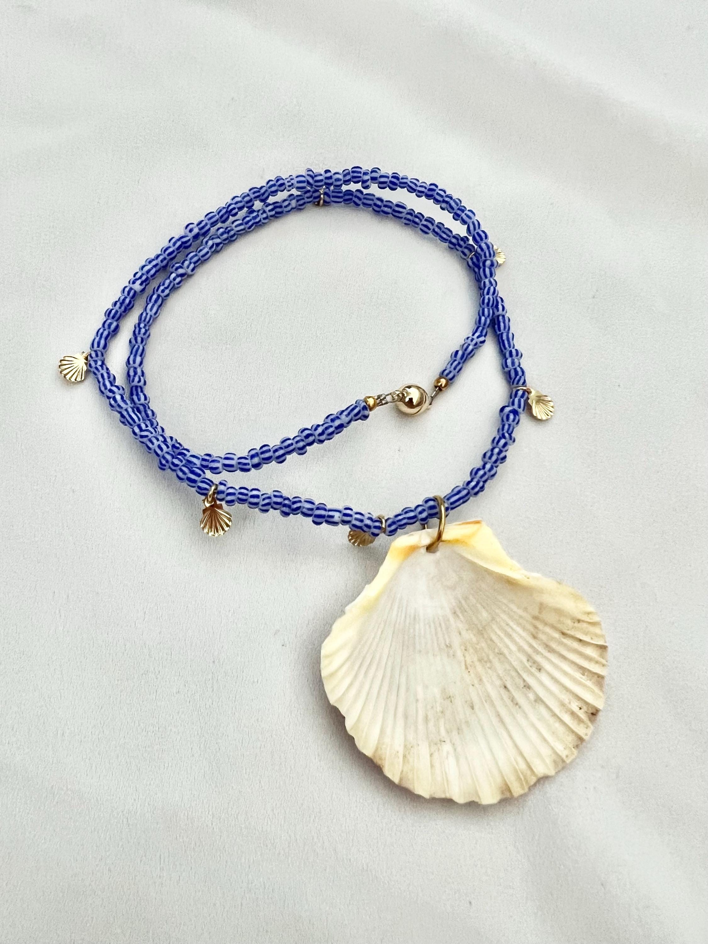 Natural scallop shell blue white stripe glass bead gold shell necklace