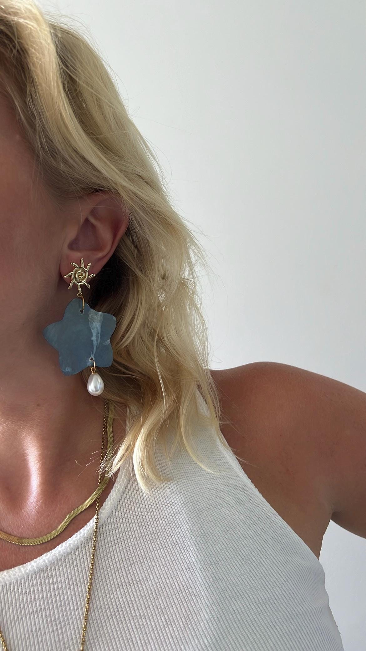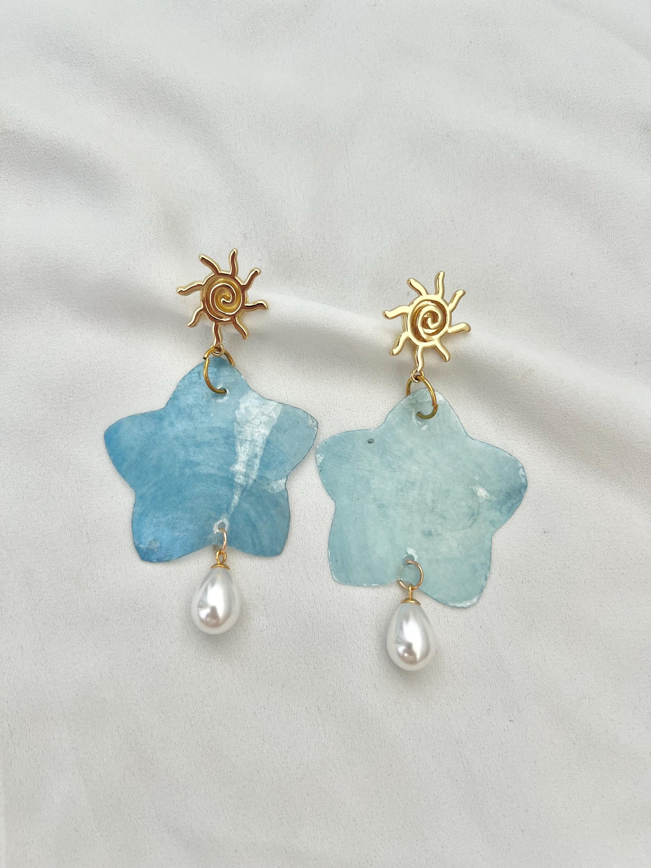 Light blue Capiz shell star sun gold pearl earrings