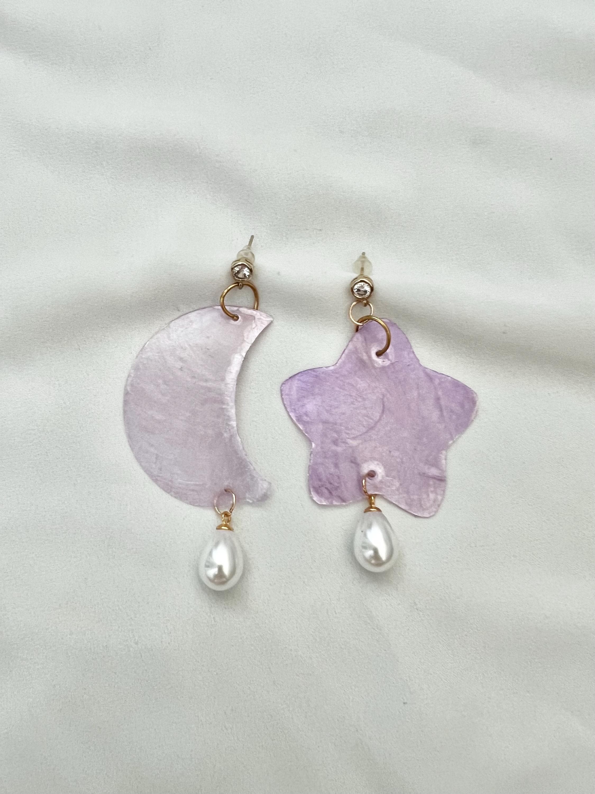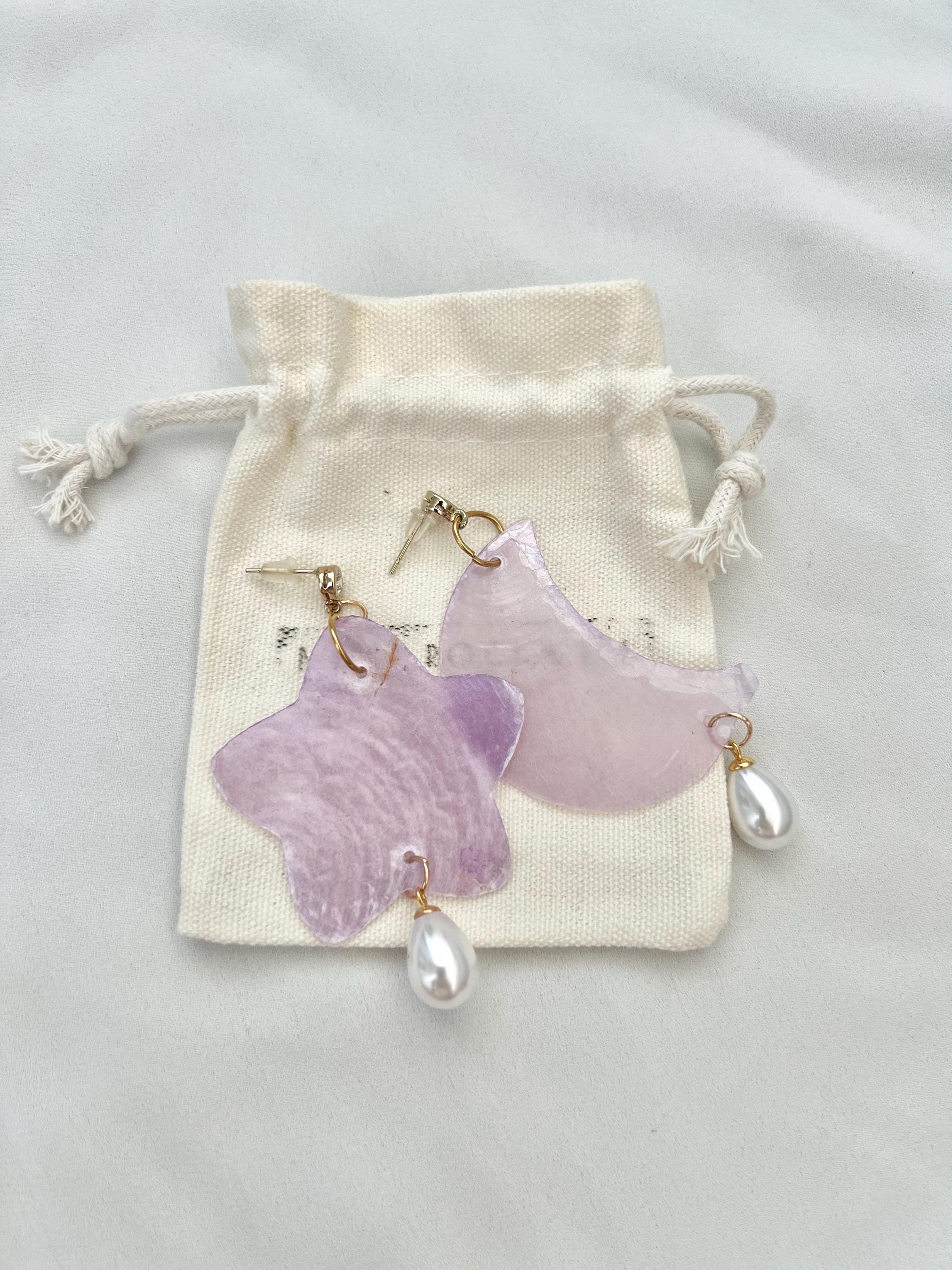 Lilac Capiz shell star half moon pearl dangle drop gold earrings