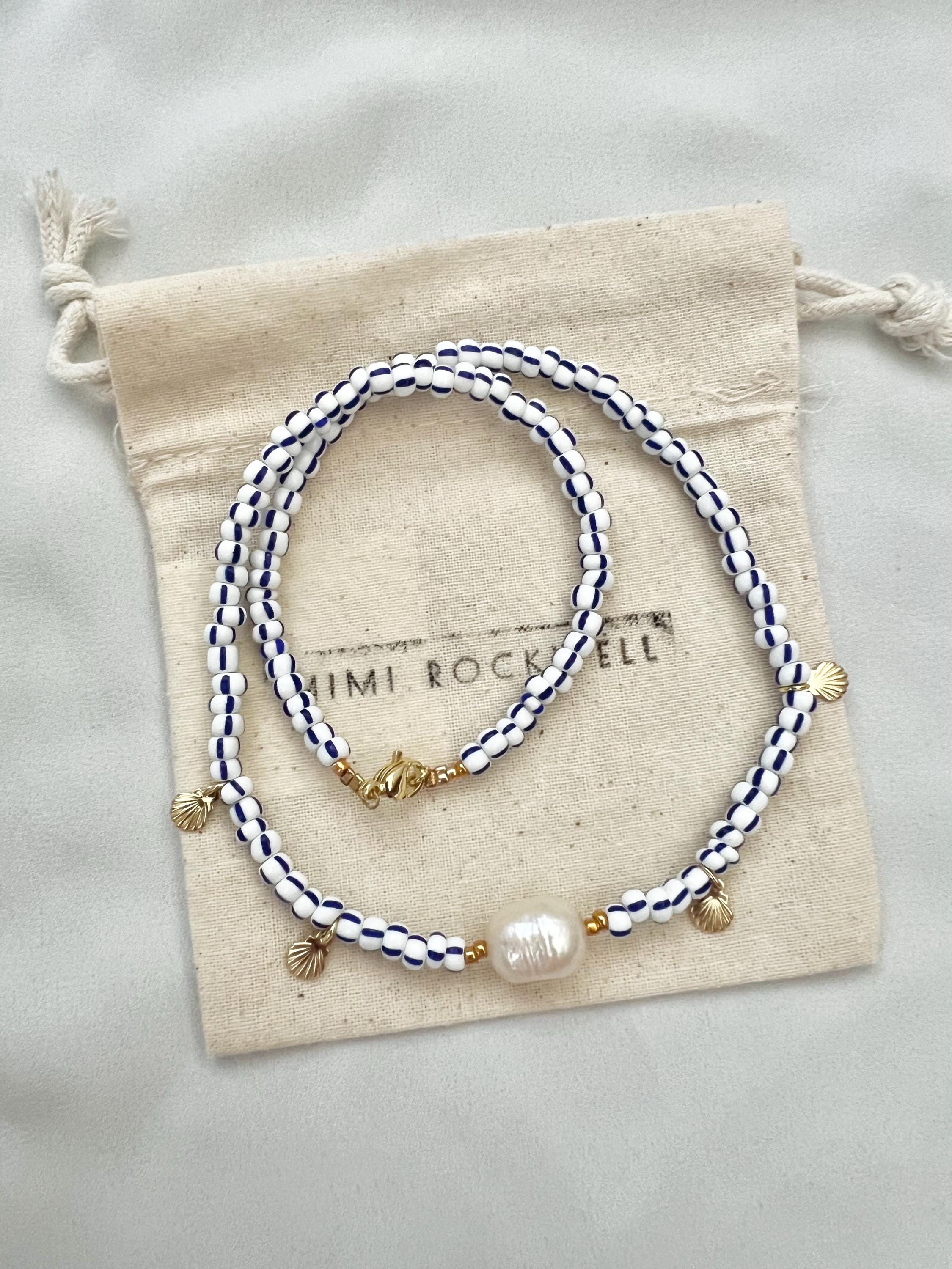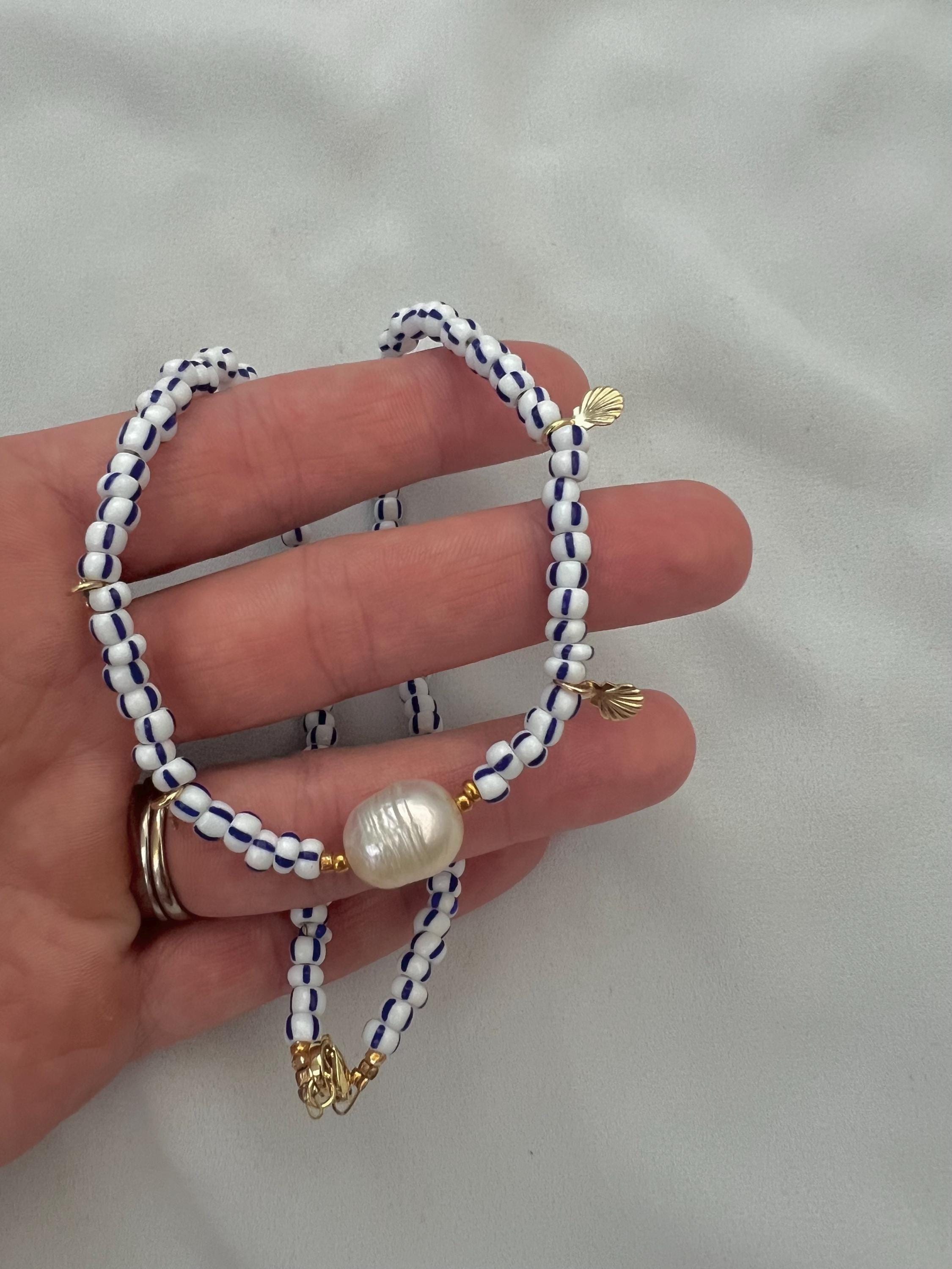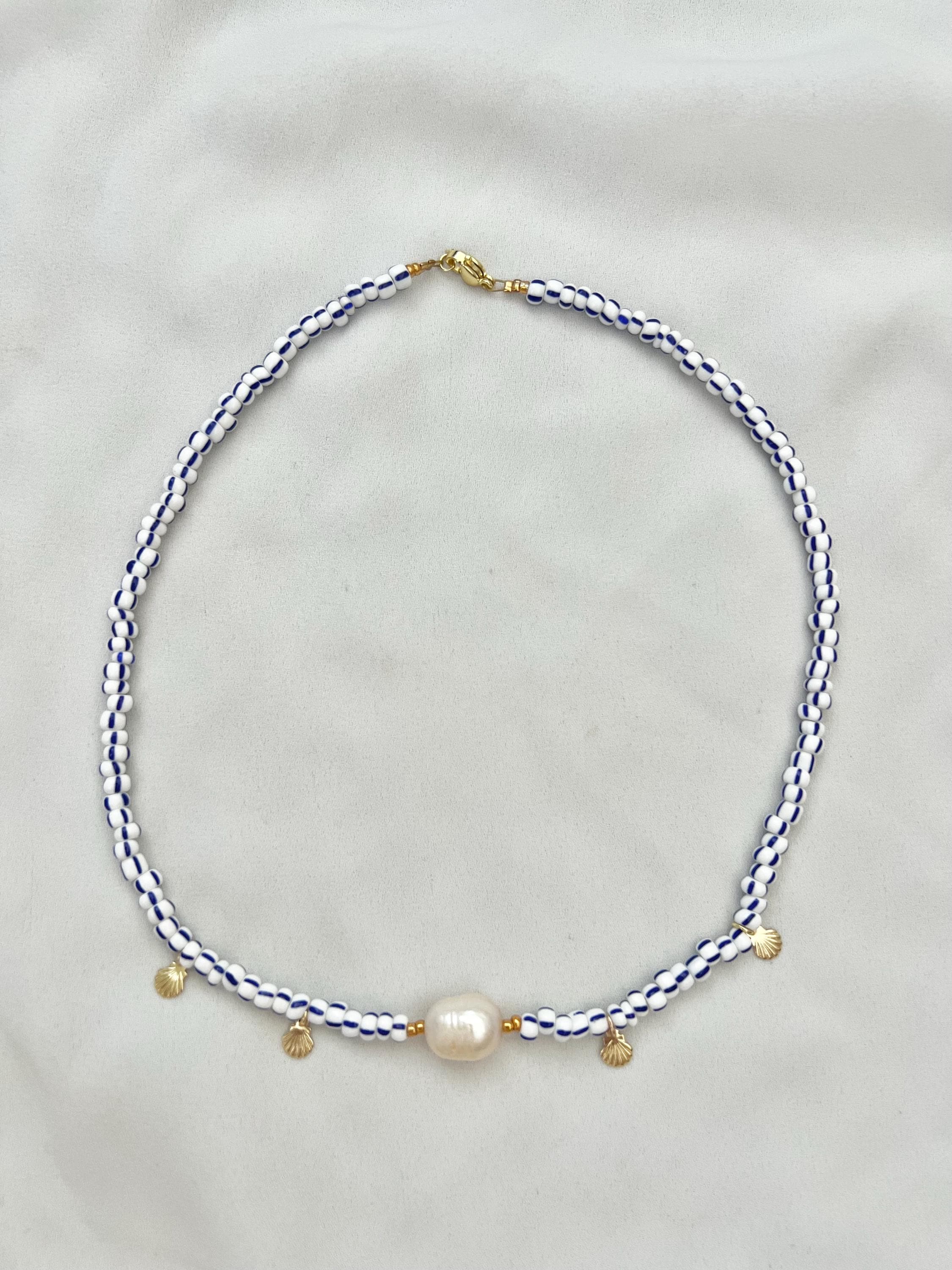 Baroque freshwater pearl golden mini shell blue white stripe beaded necklace