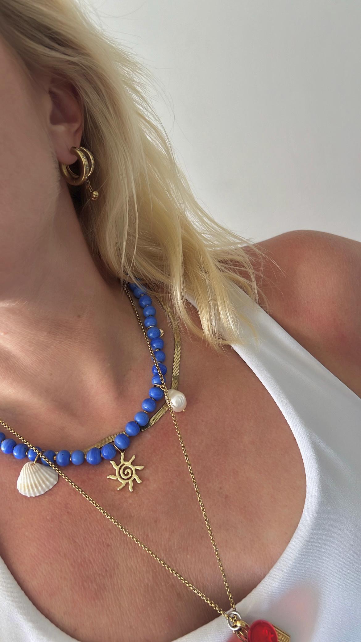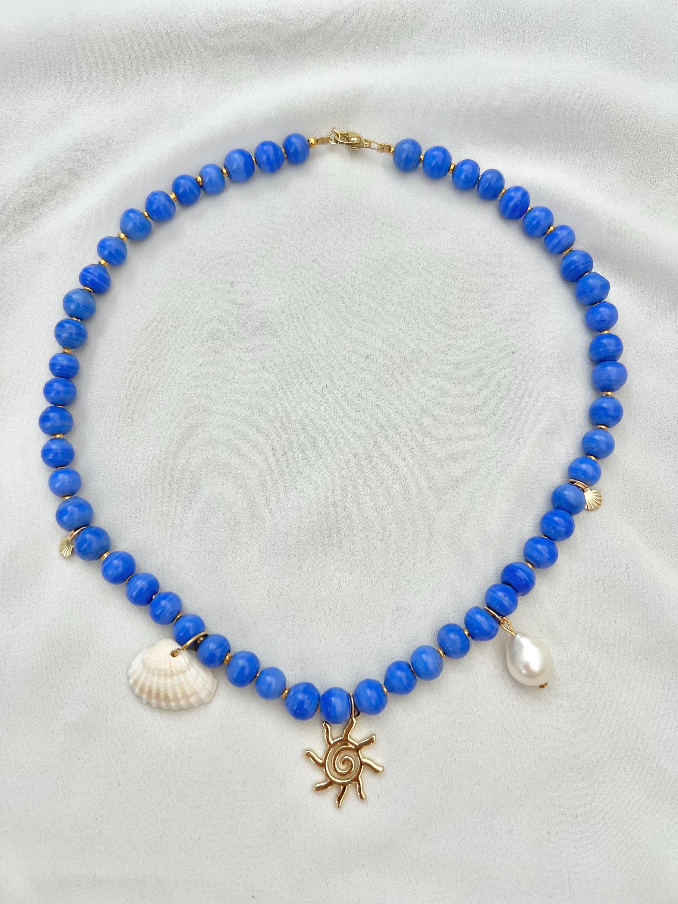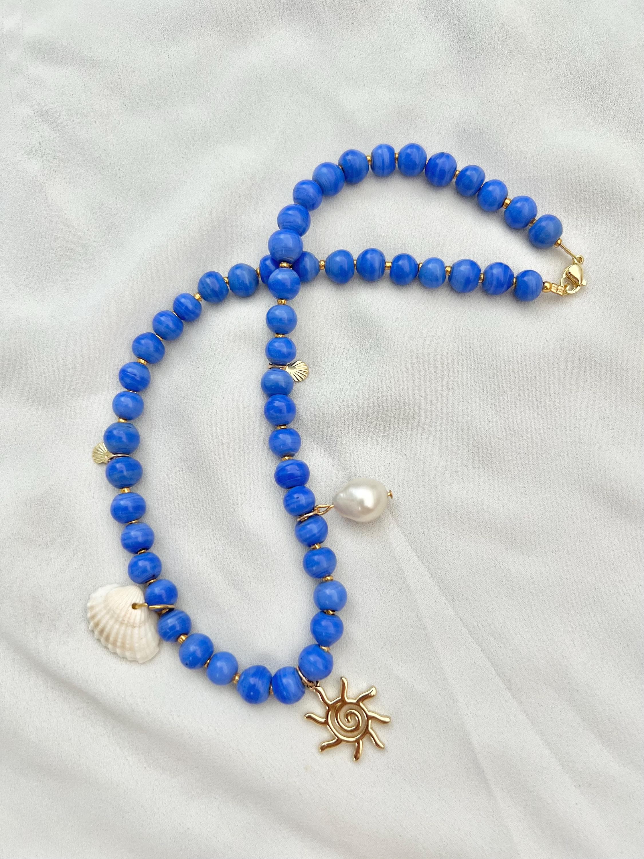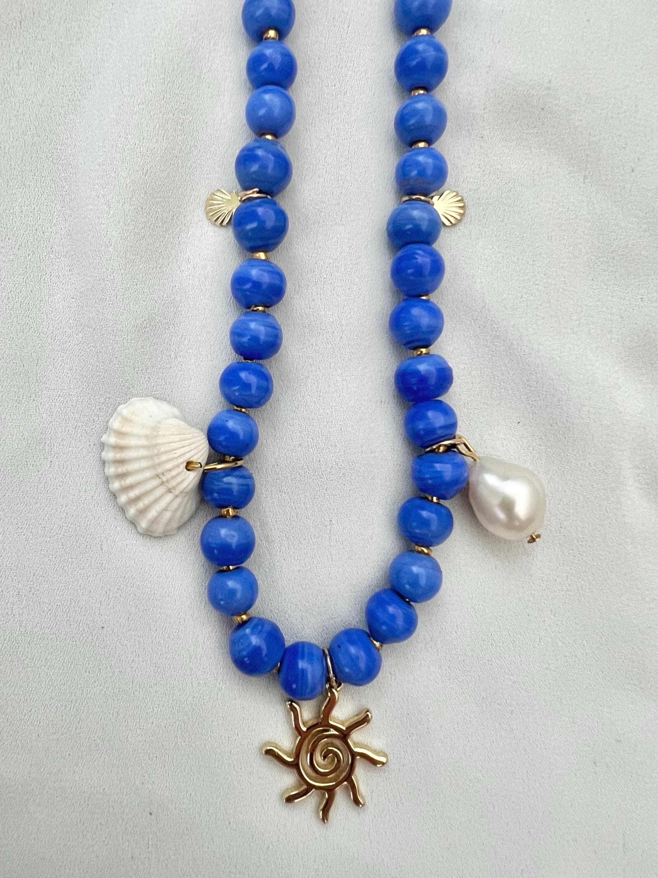 Cobalt blue glass bead golden sun pearl shell bead necklace