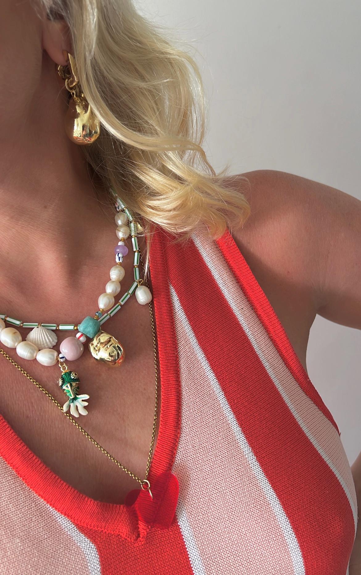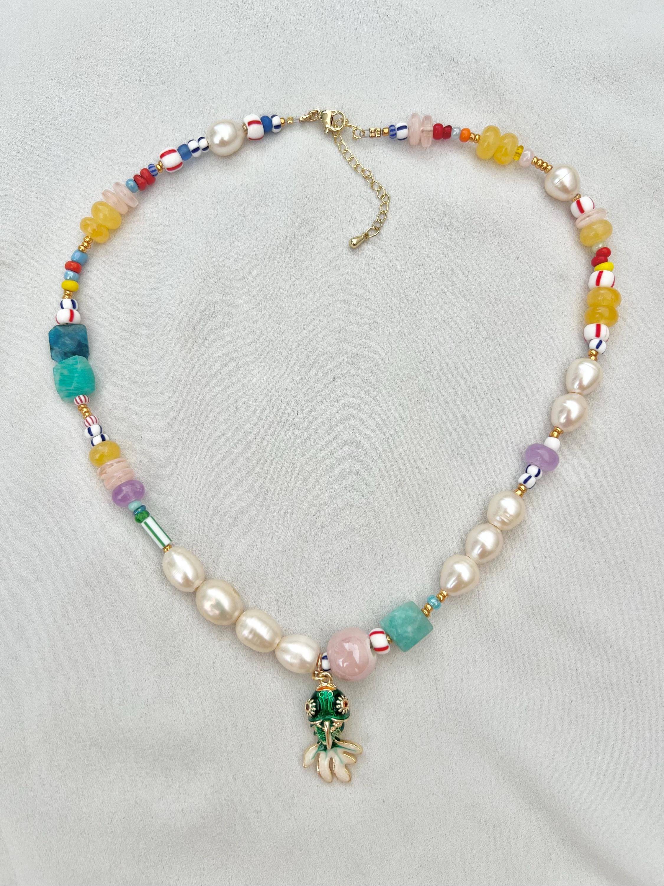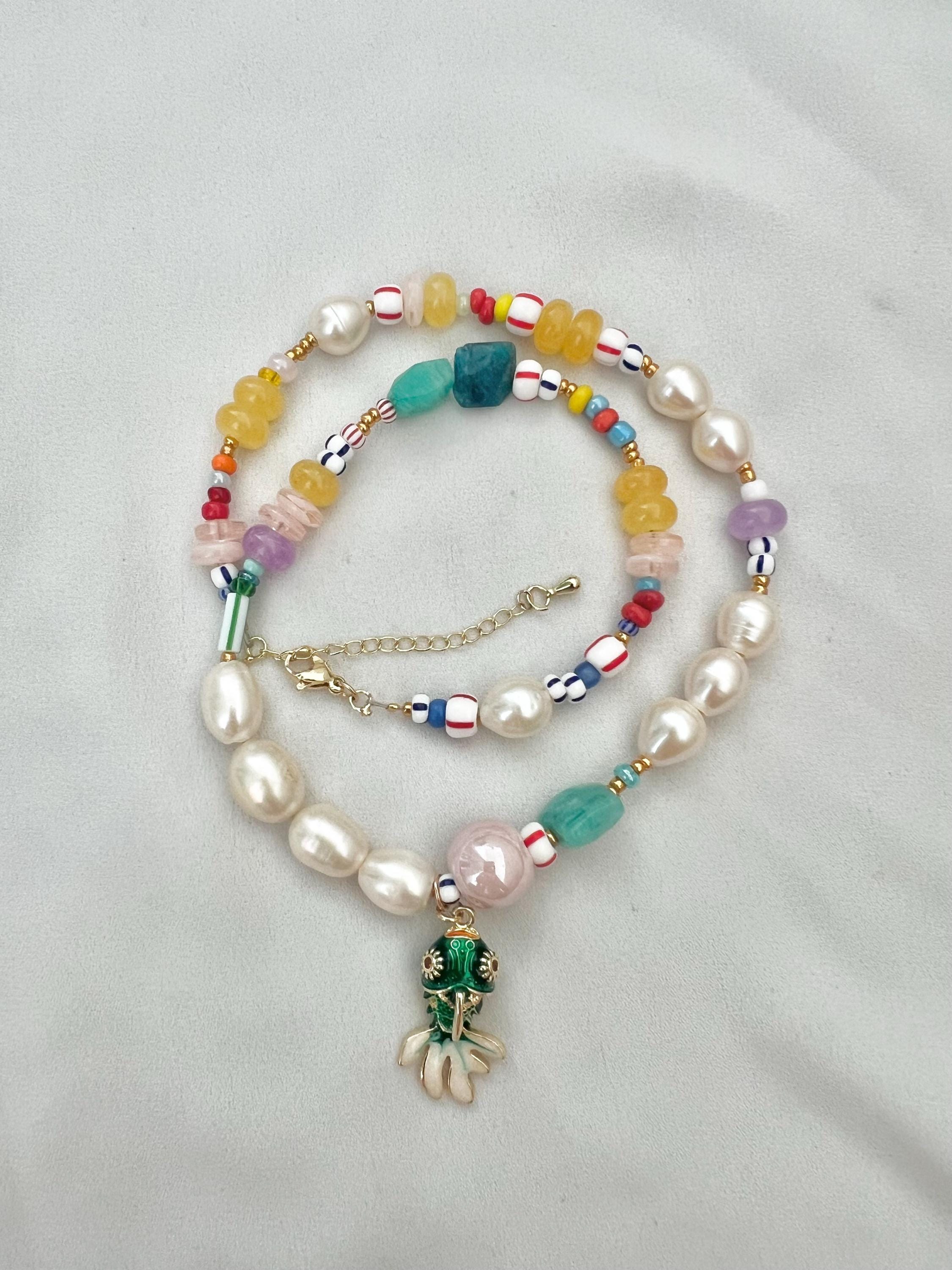 Green Cloisonne gold fish Baroque freshwater pearl multicoloured glass bead gold necklace