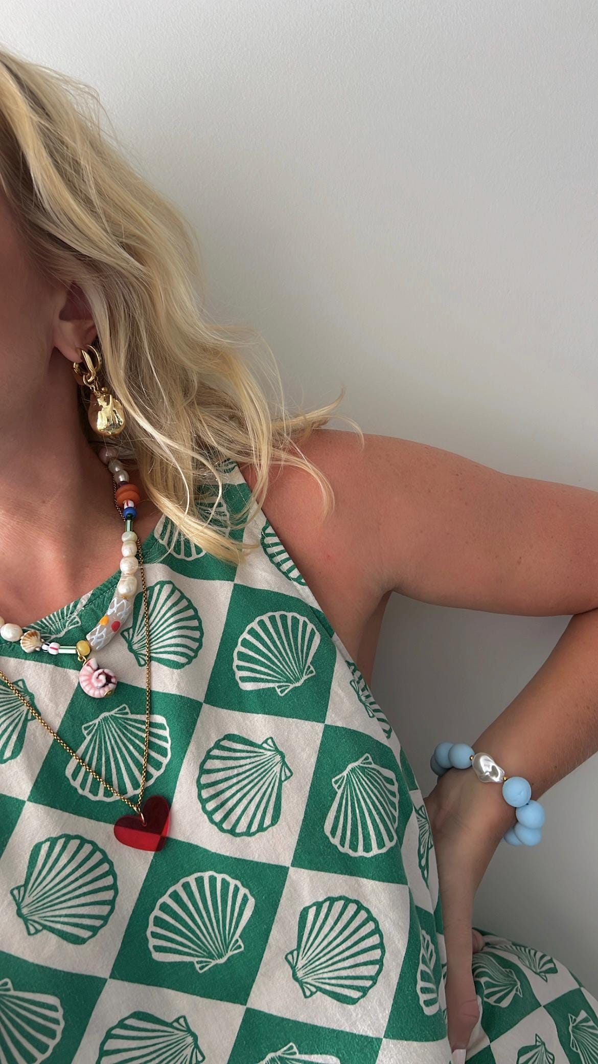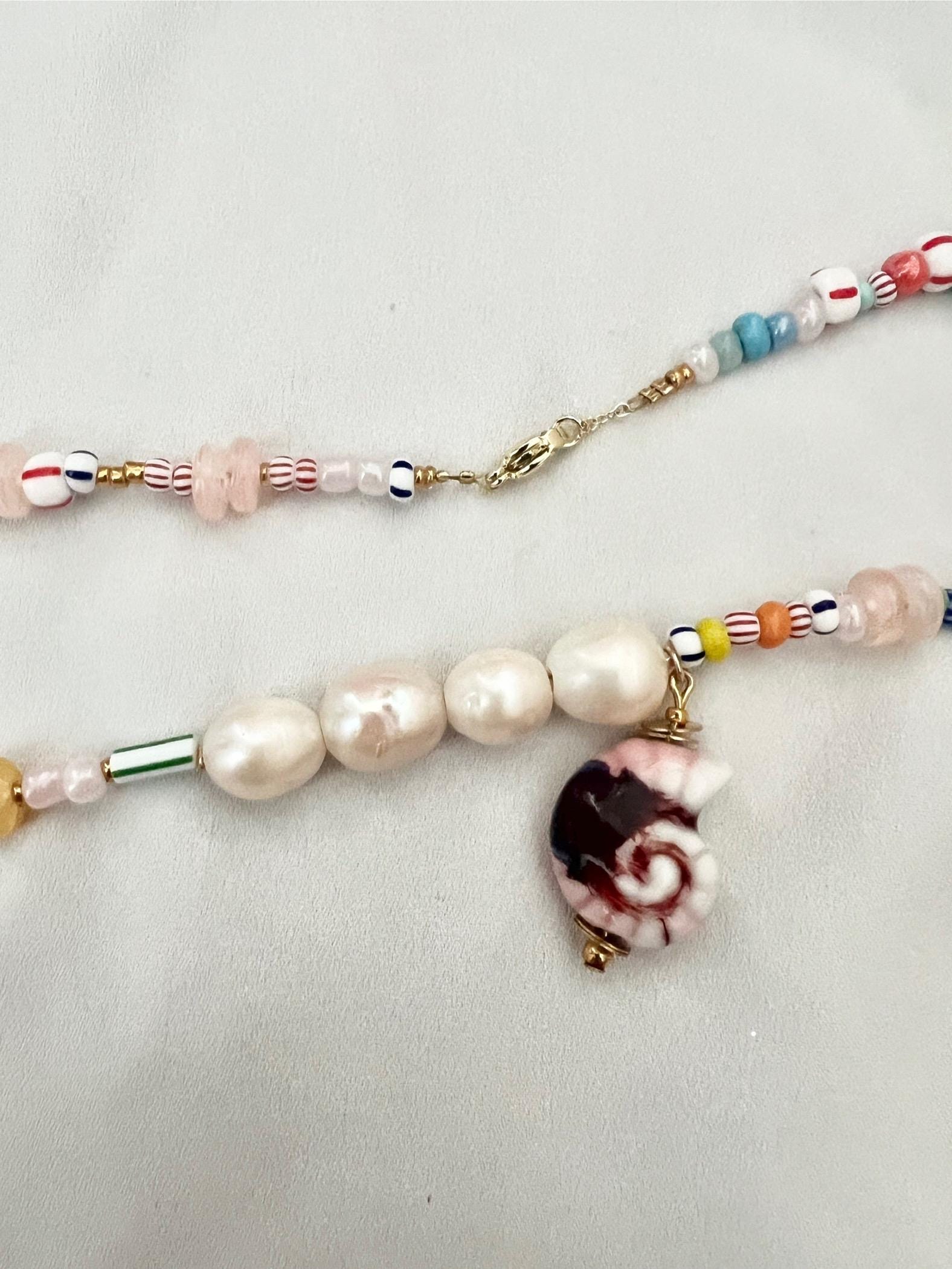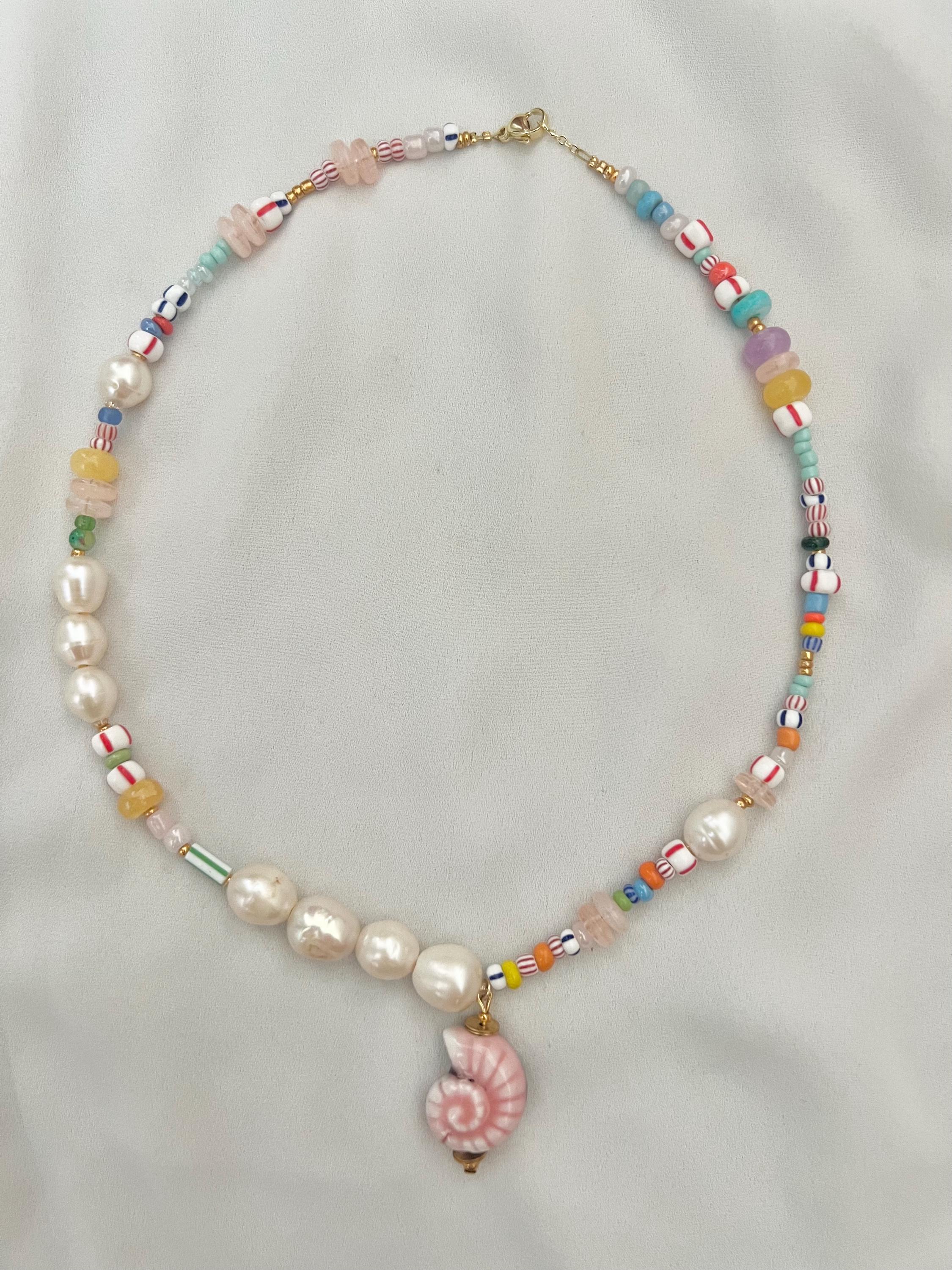 Pink shell Baroque freshwater pearl multicoloured glass bead gold necklace
