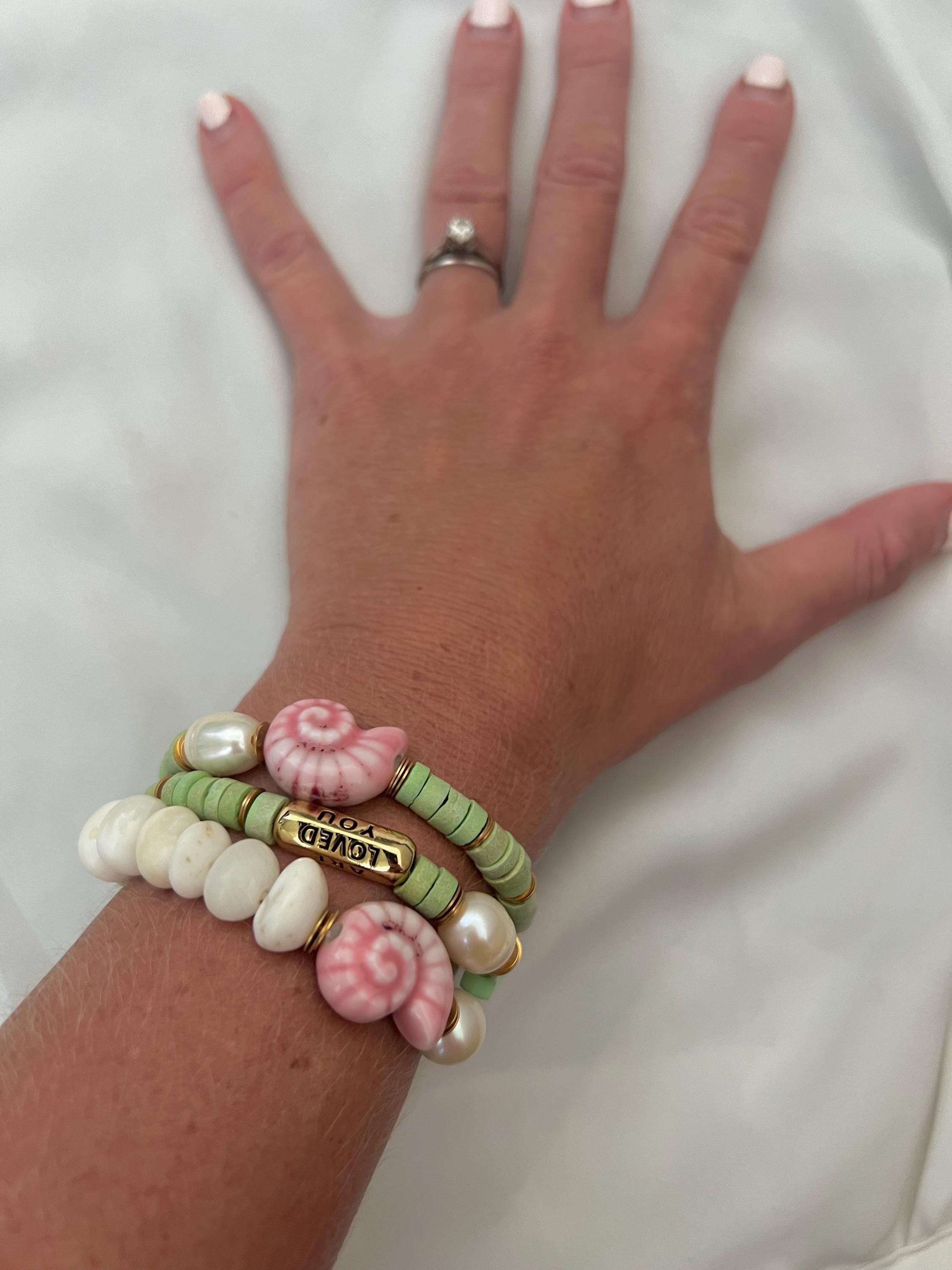 Sea foam green beaded pearl pink shell bracelet