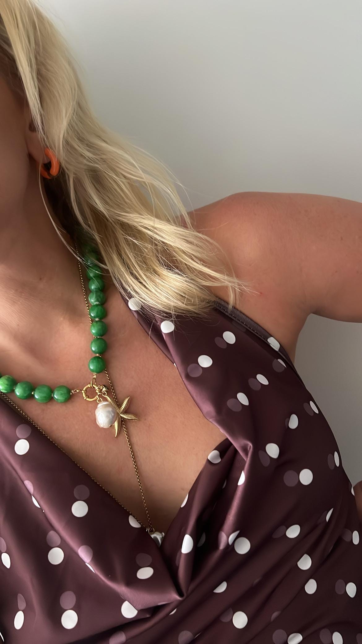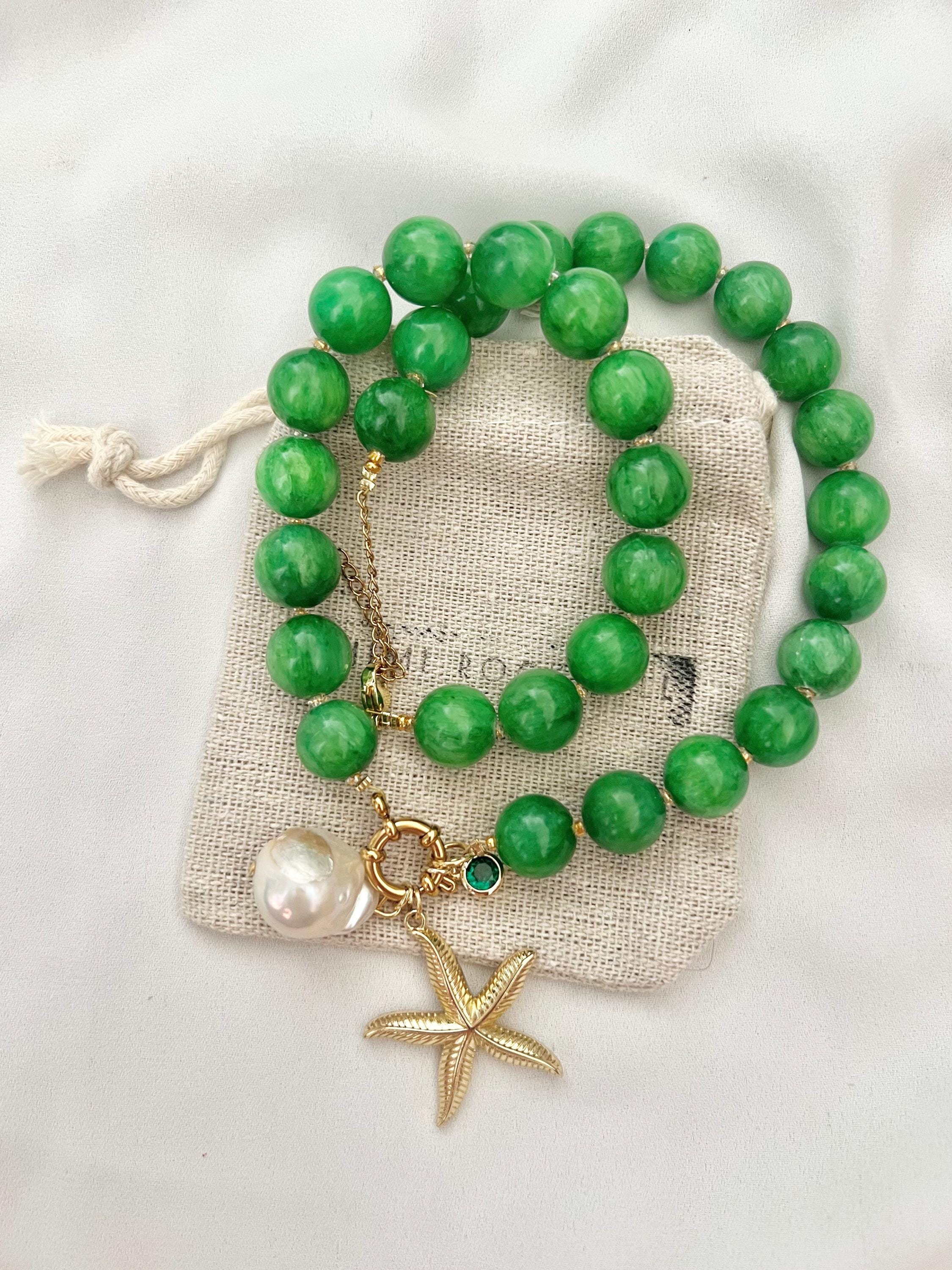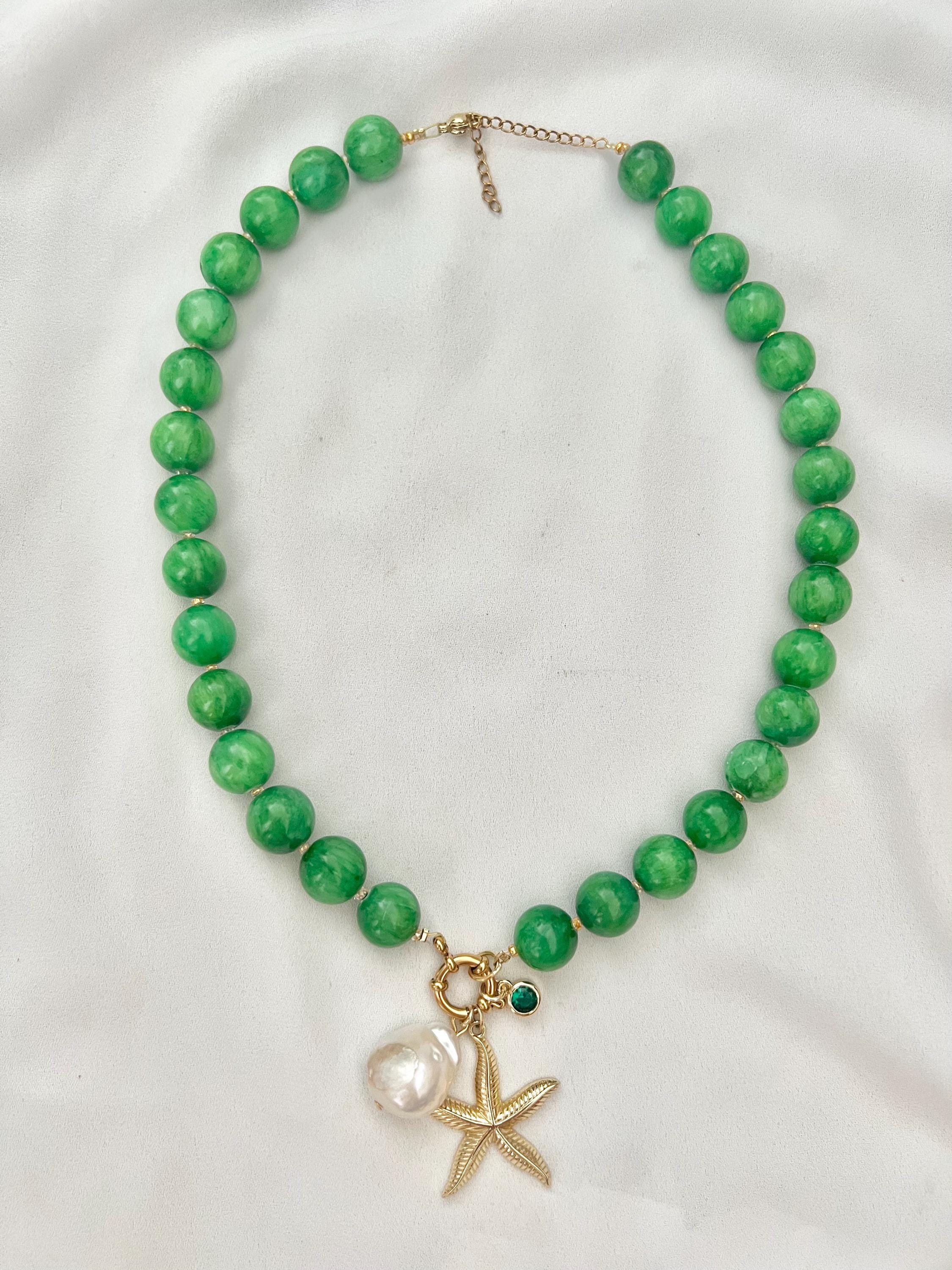 Green Jade stone bead Barque pearl starfish pendant gold necklace
