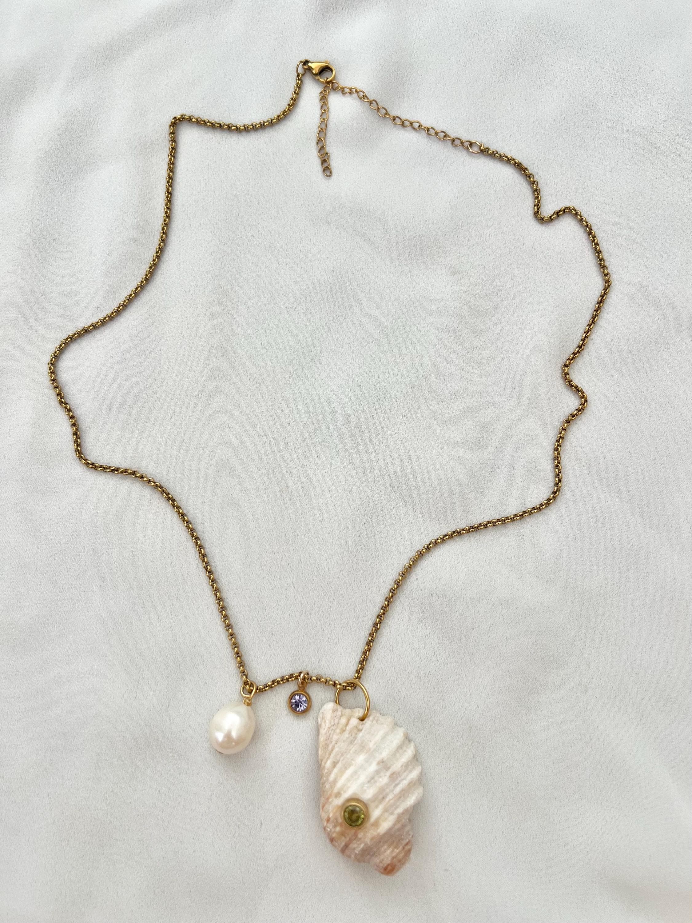Natural shell pearl green lilac Cubic Zirconia stone gold chain necklace