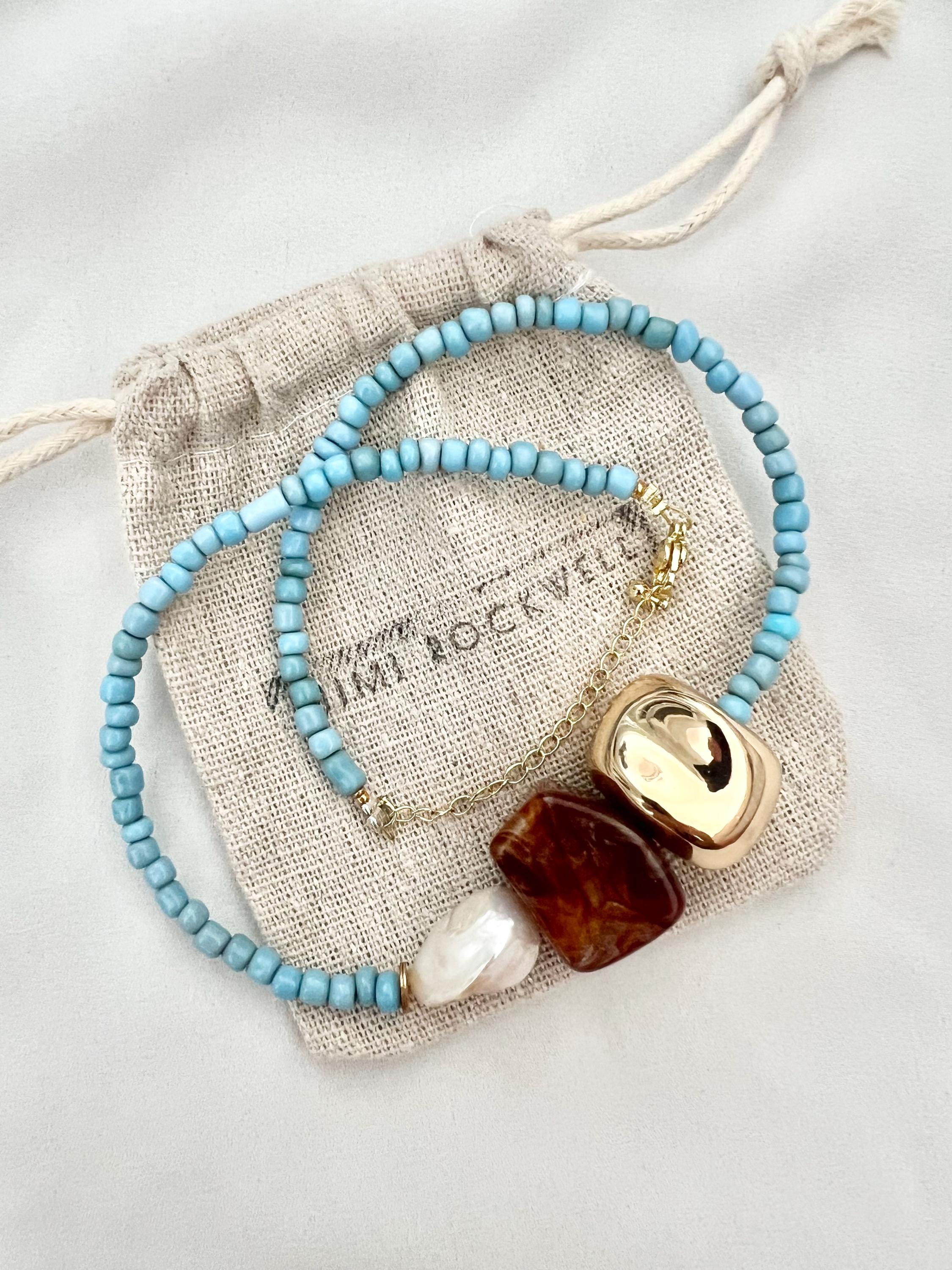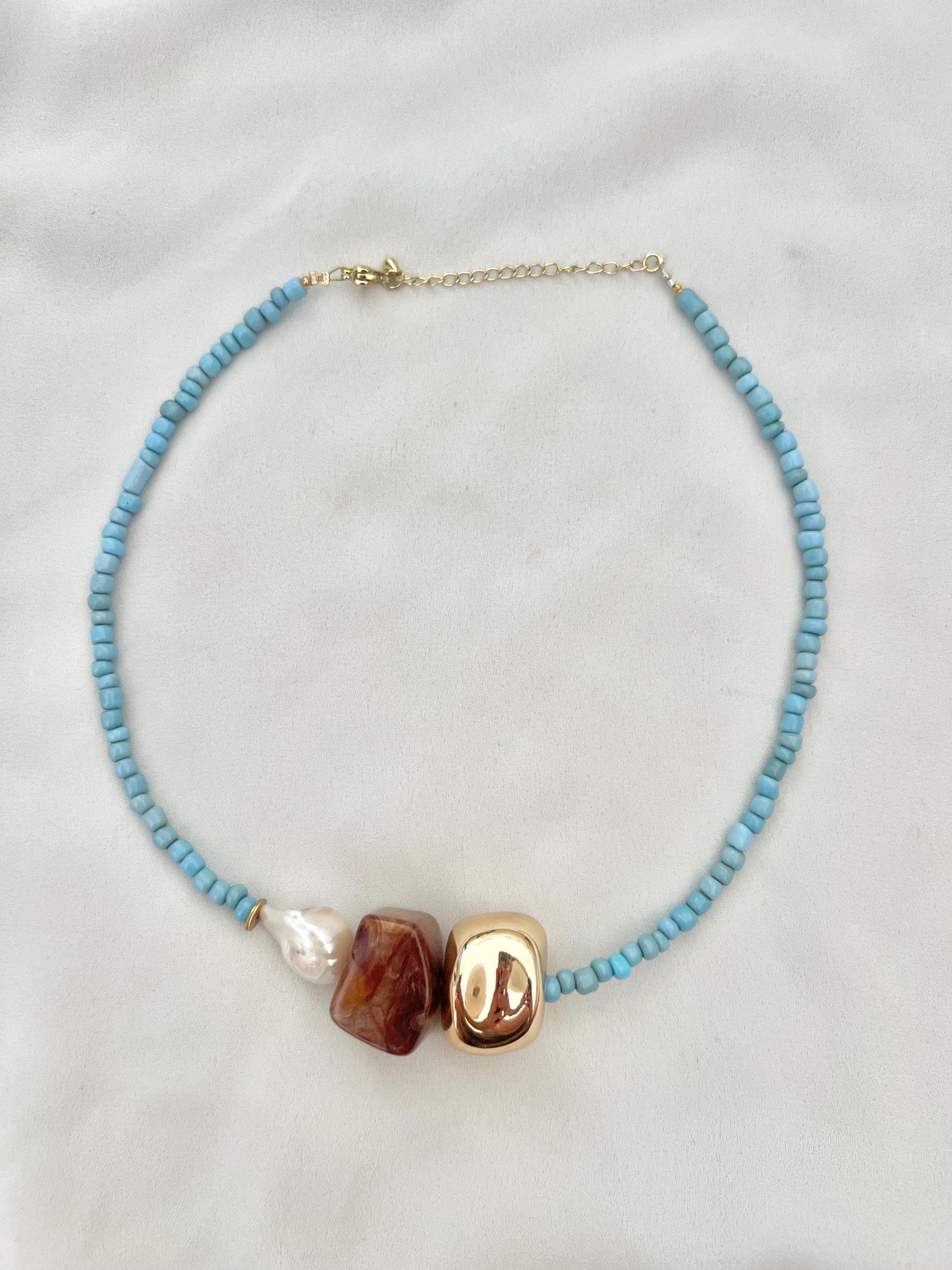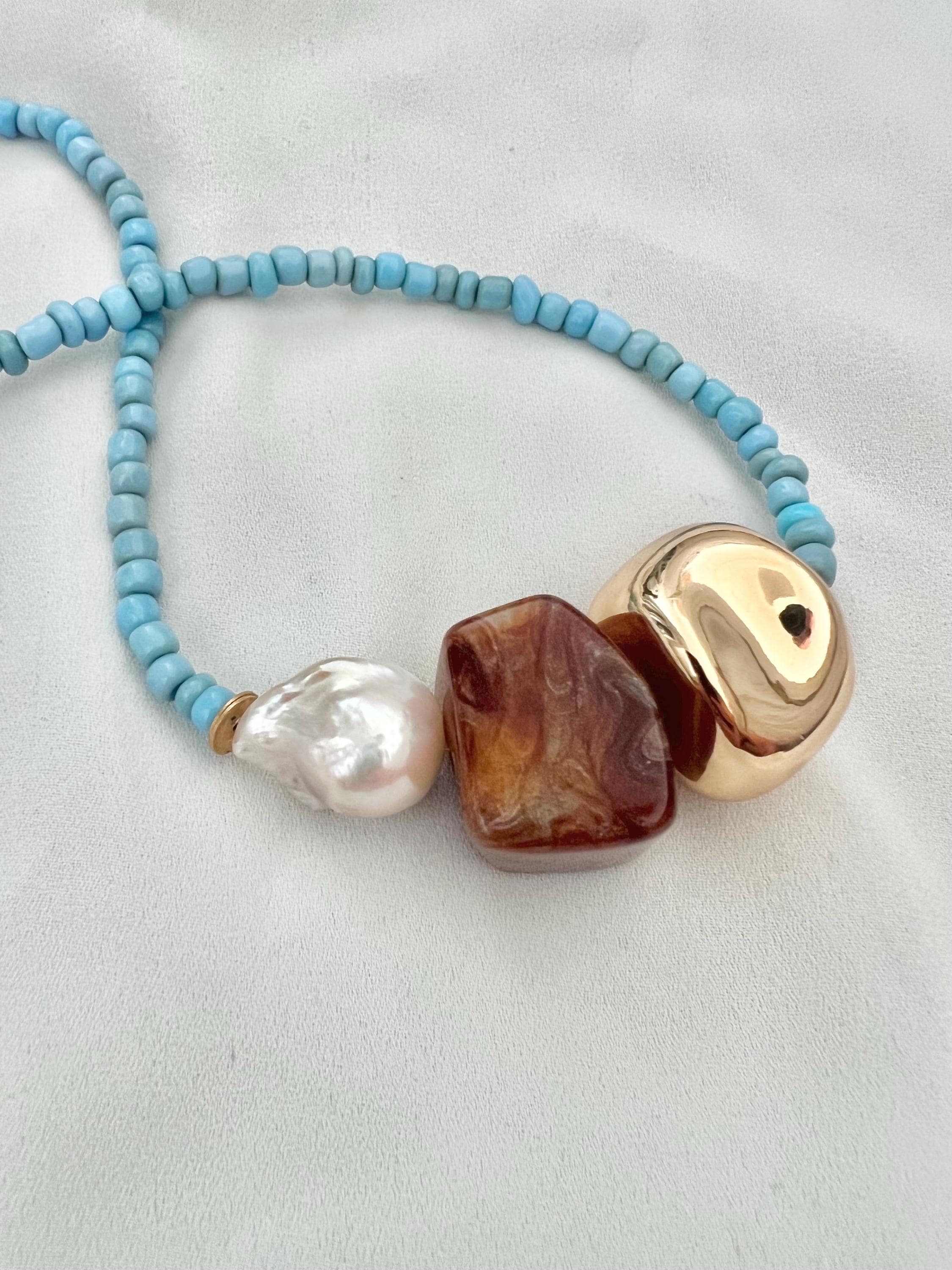 Baroque pearl blue seed bead gold necklace
