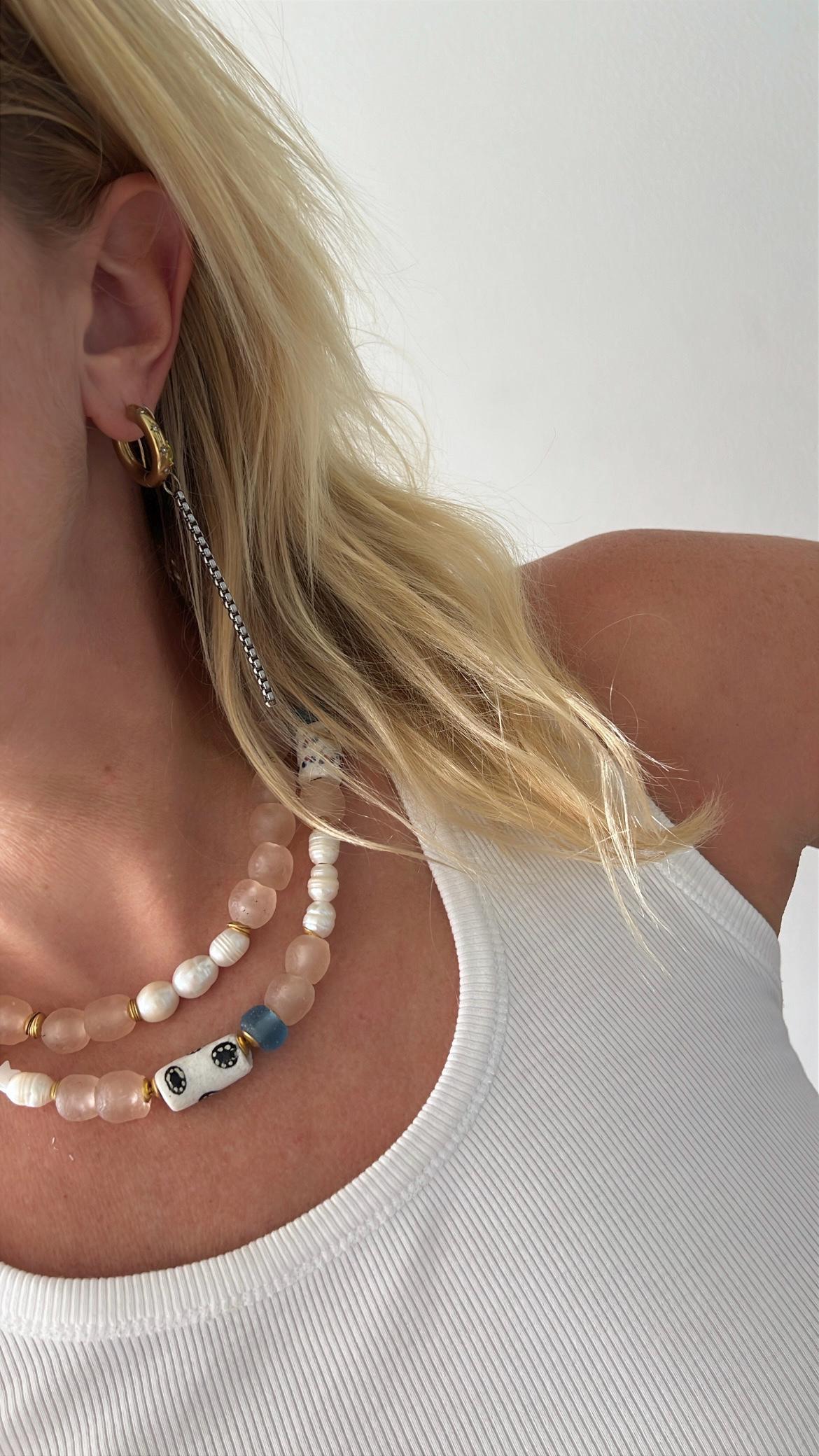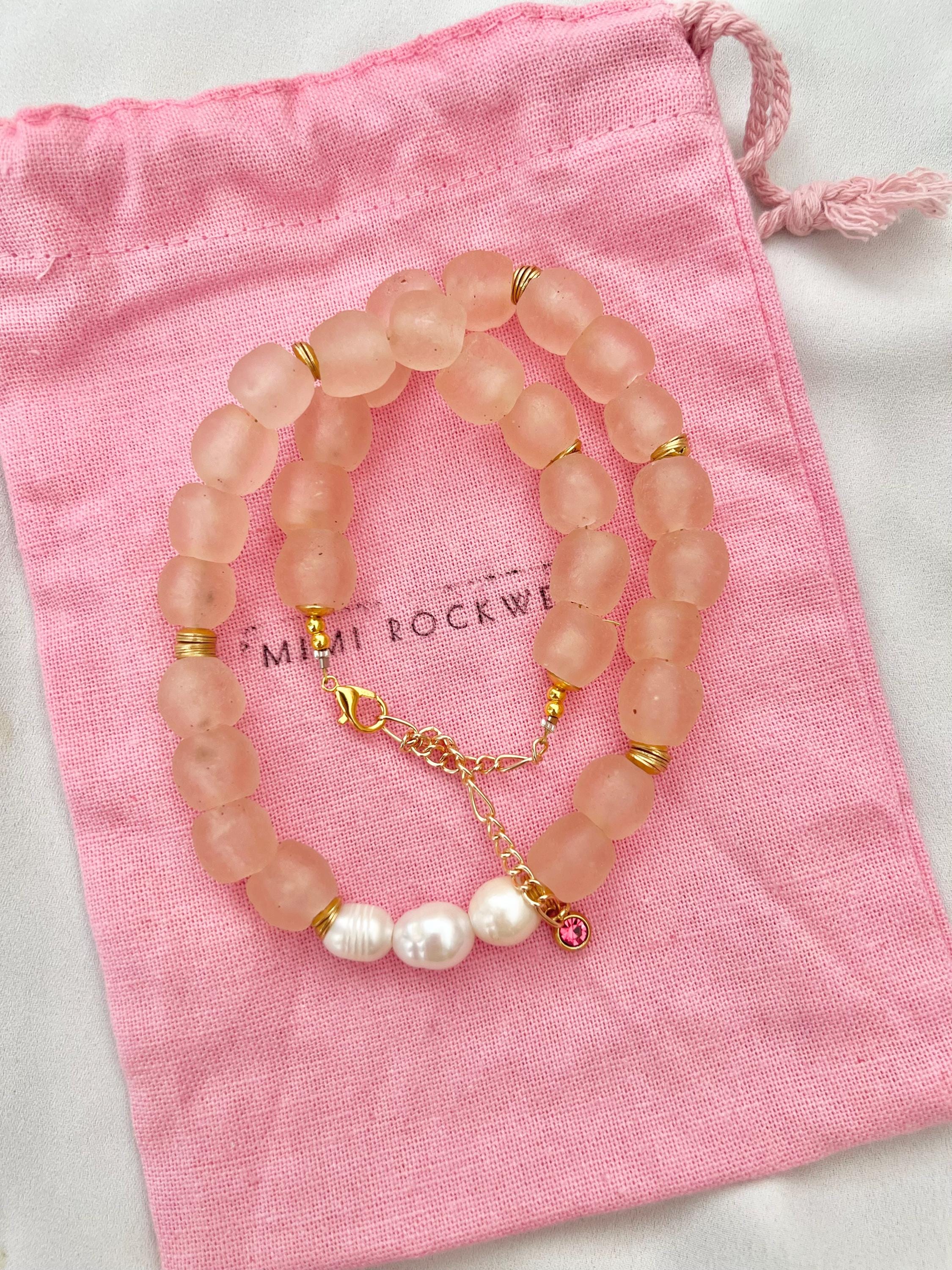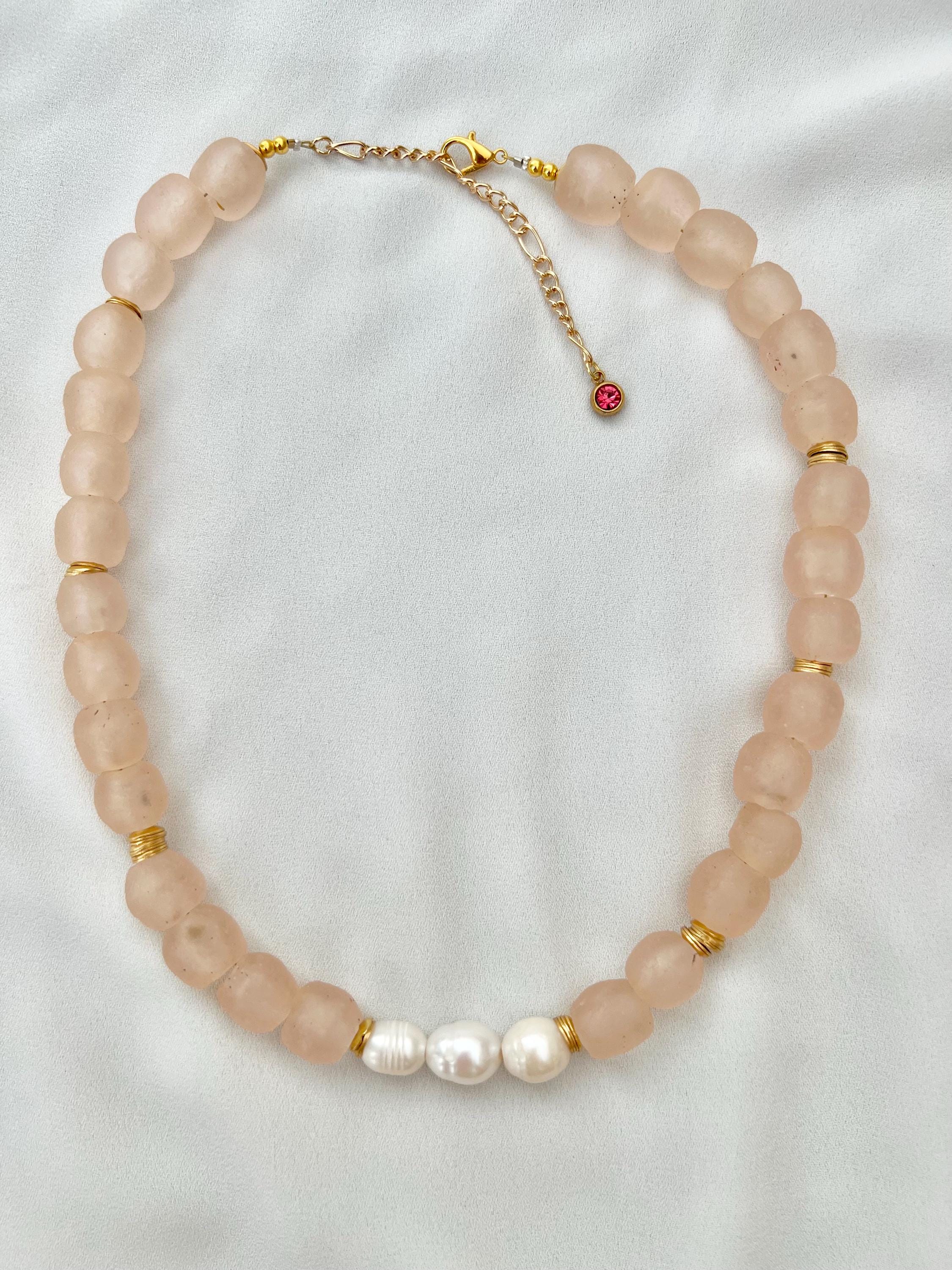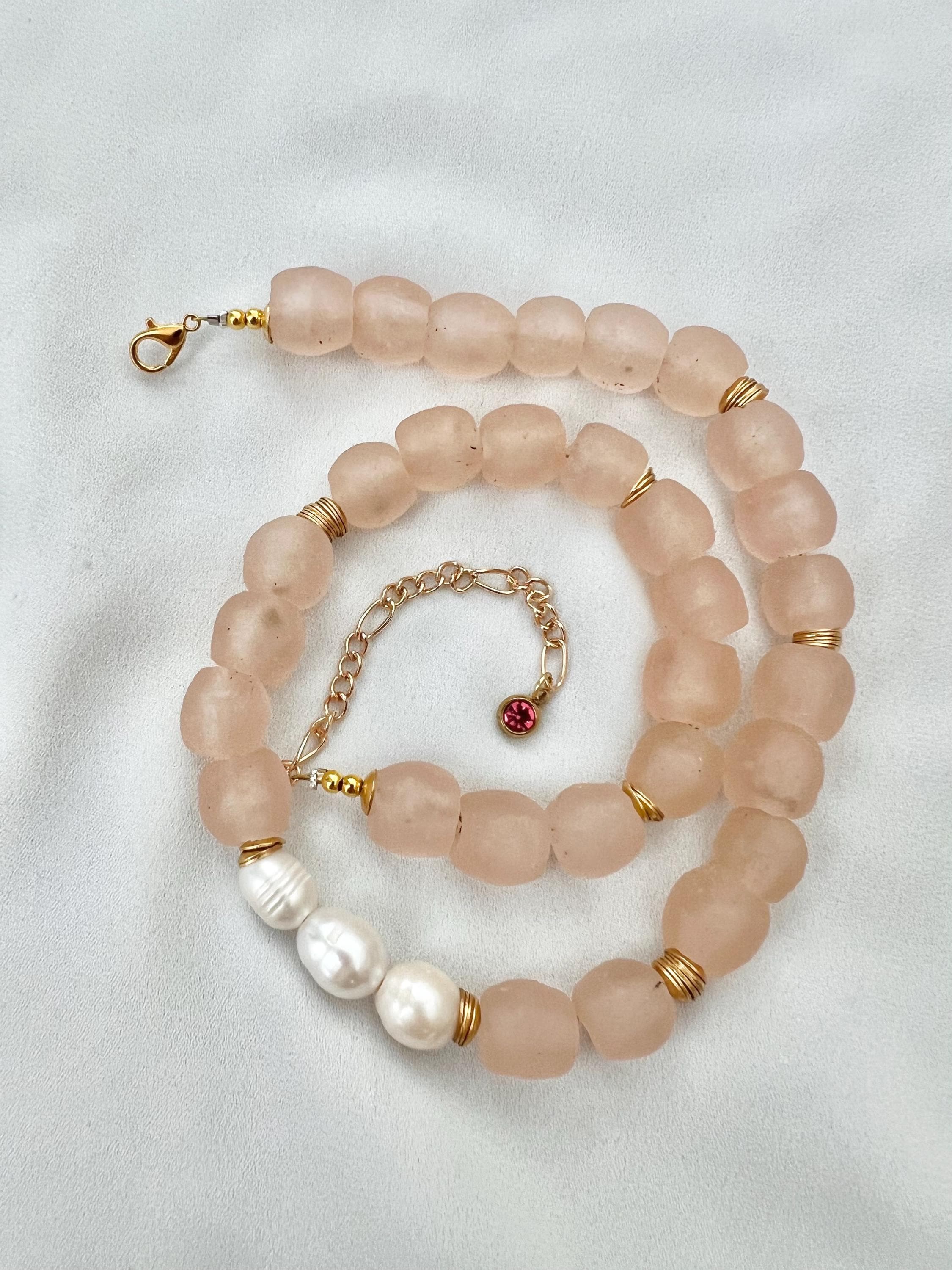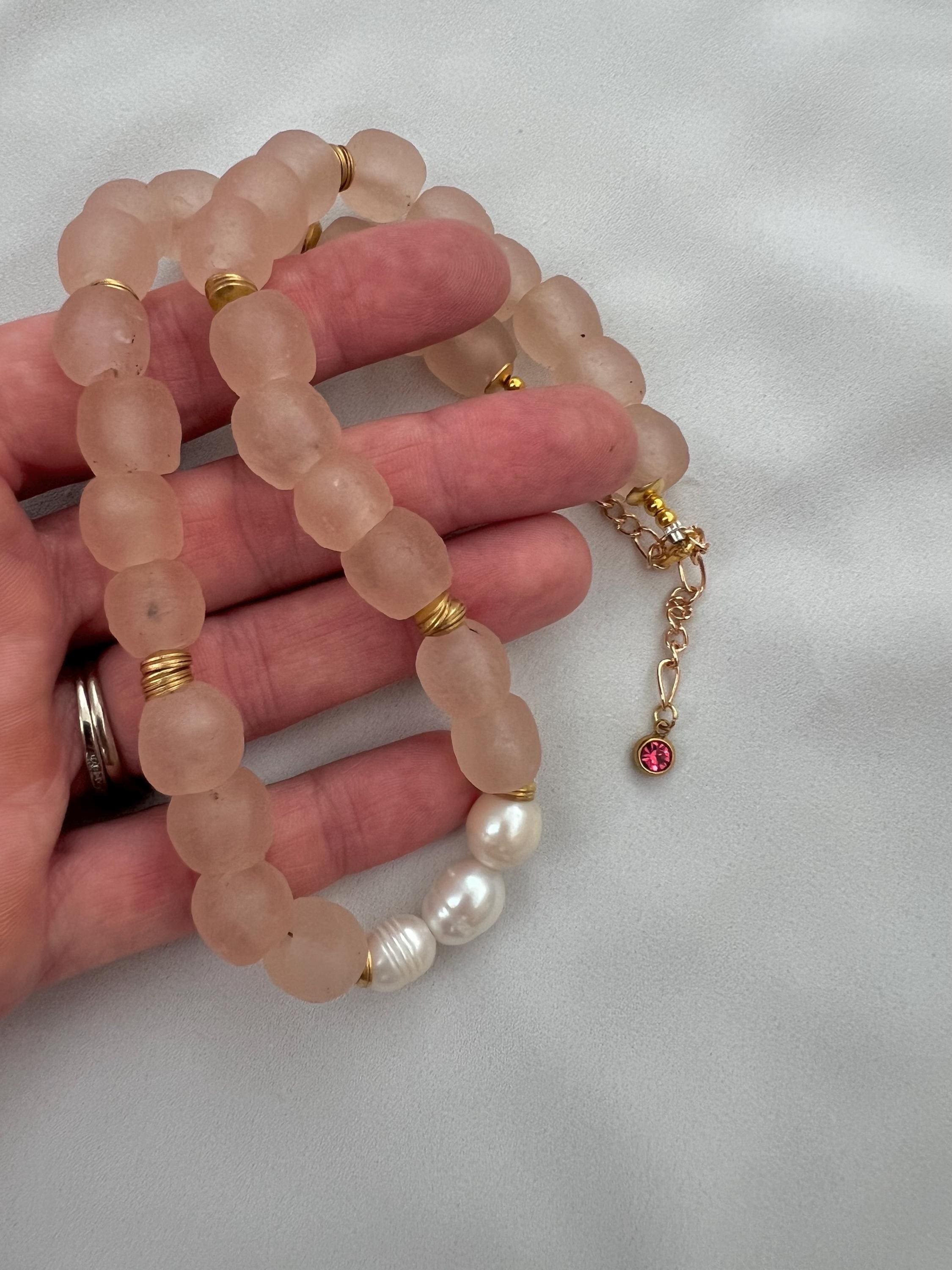 Recycled pale pink African glass bead Freshwater pearl gold necklace