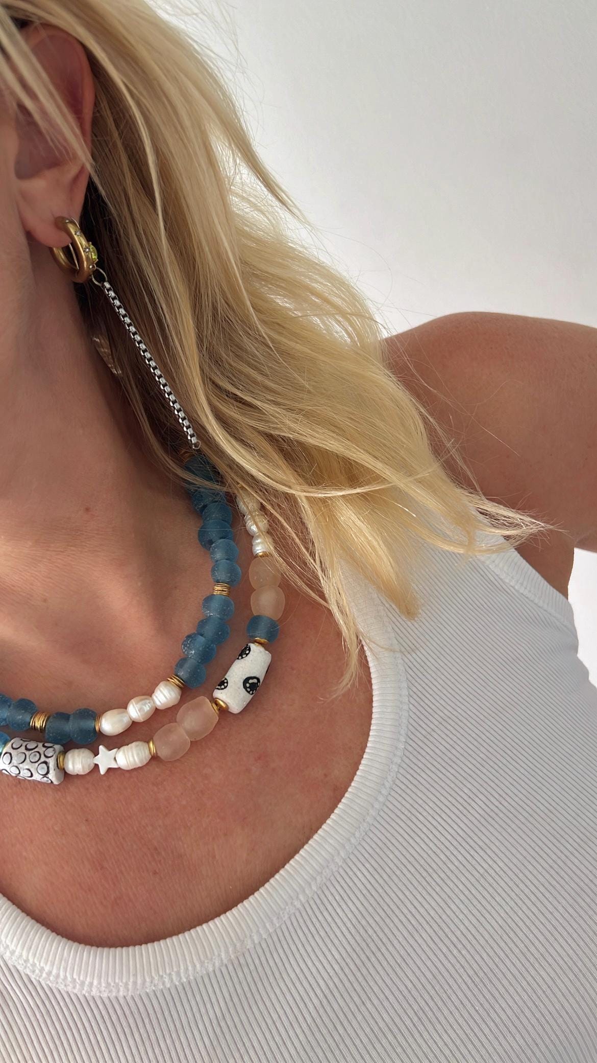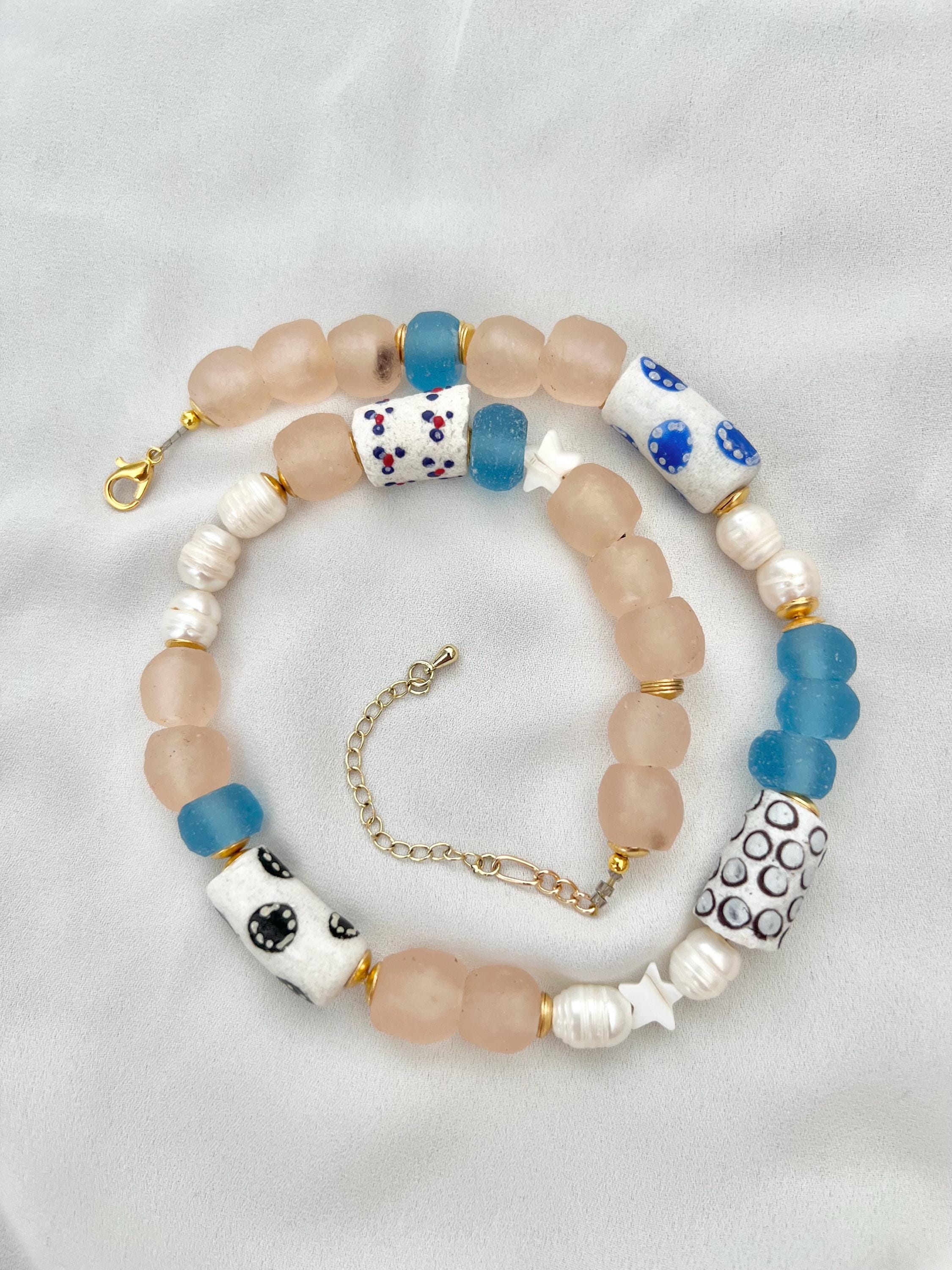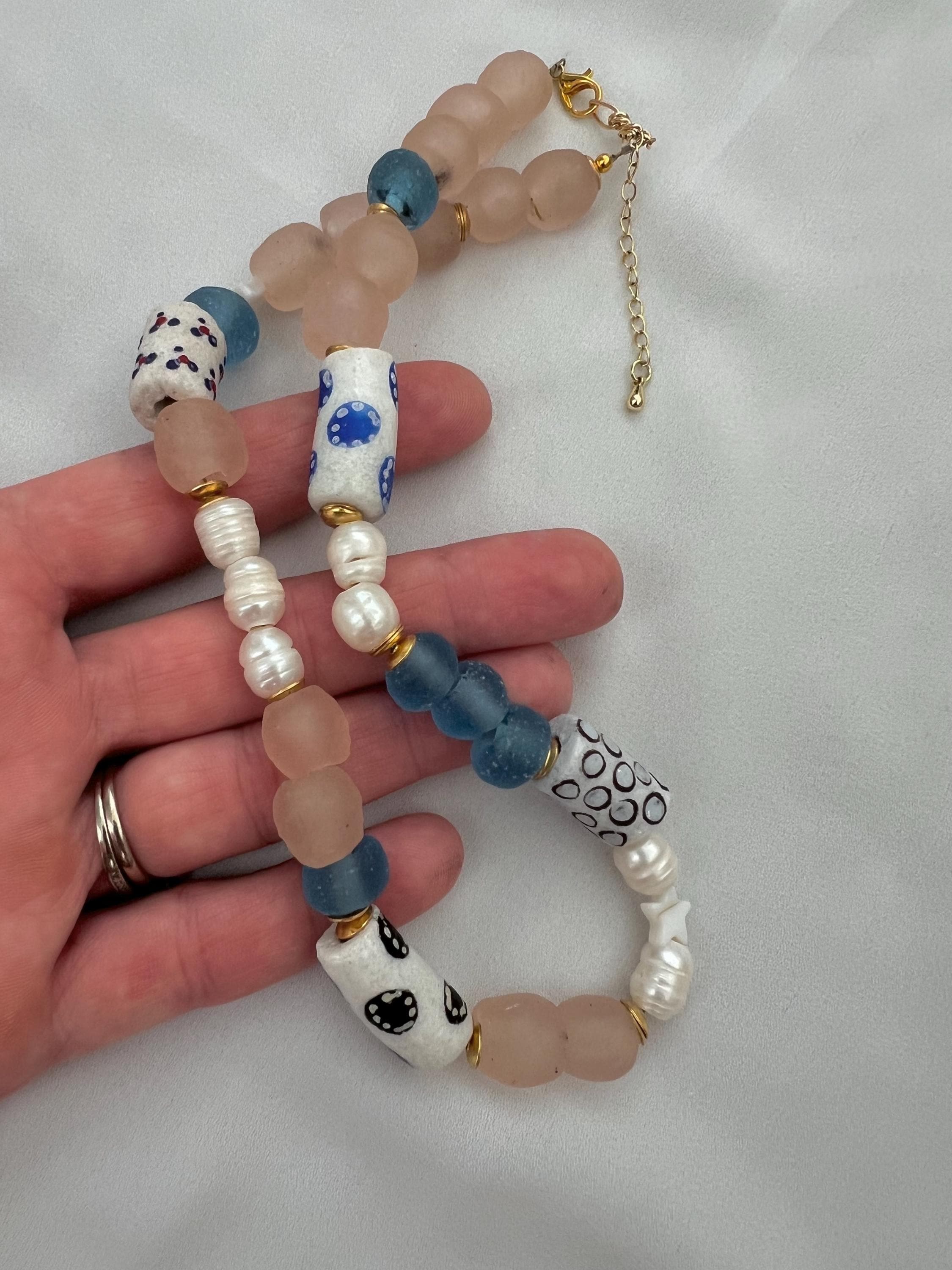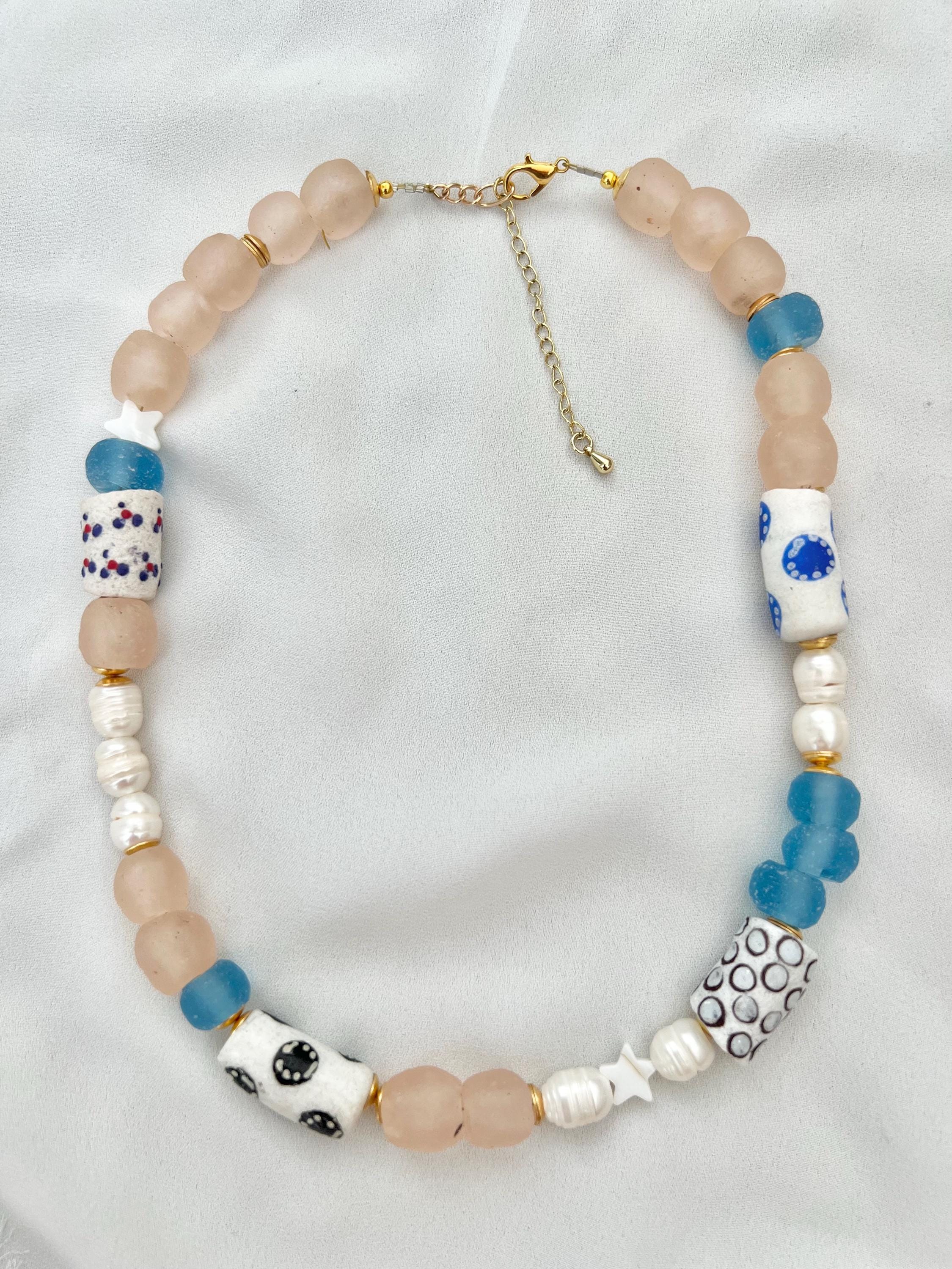 Recycled patterned tribal blue African glass bead Freshwater pearl gold necklace