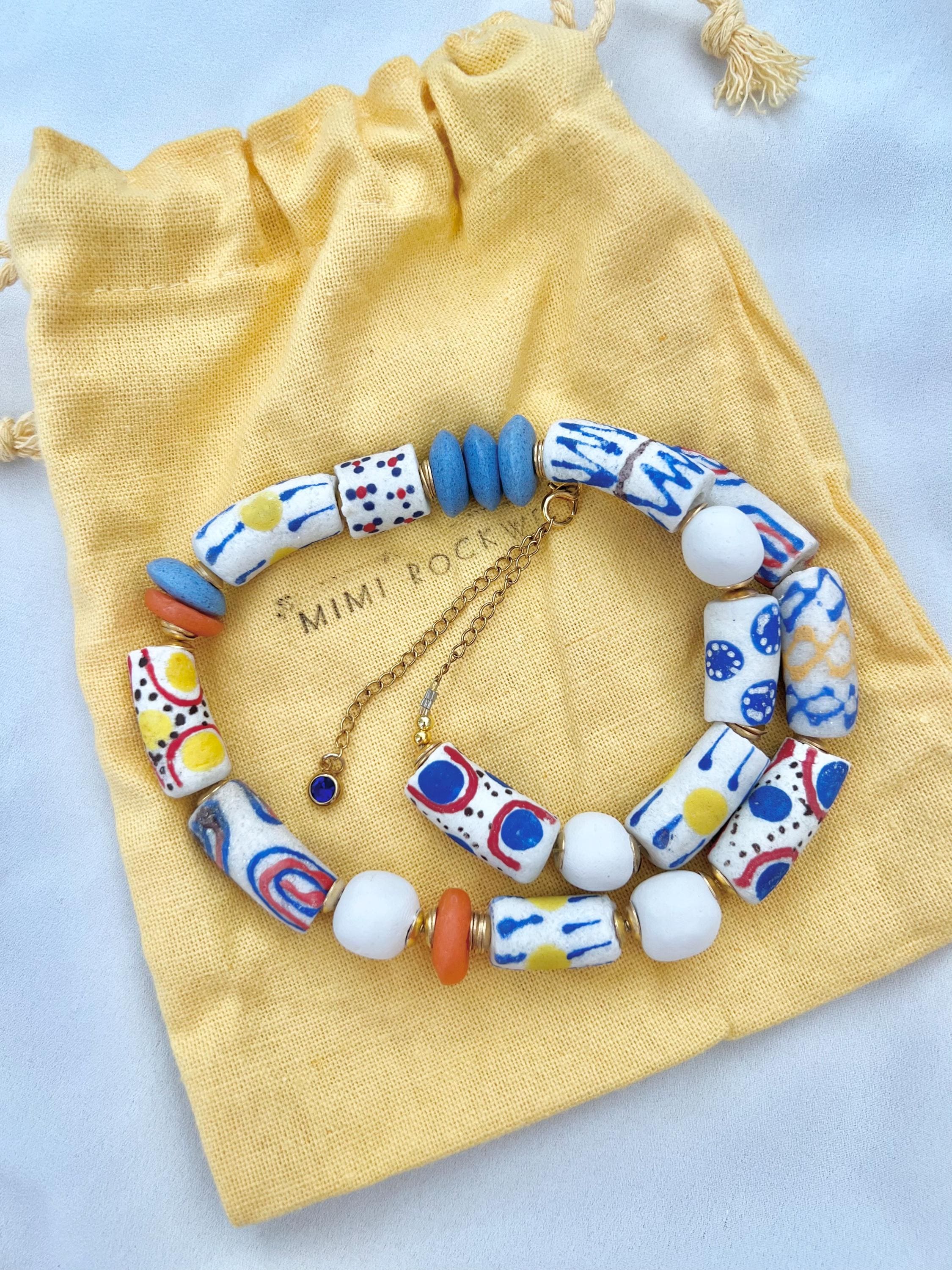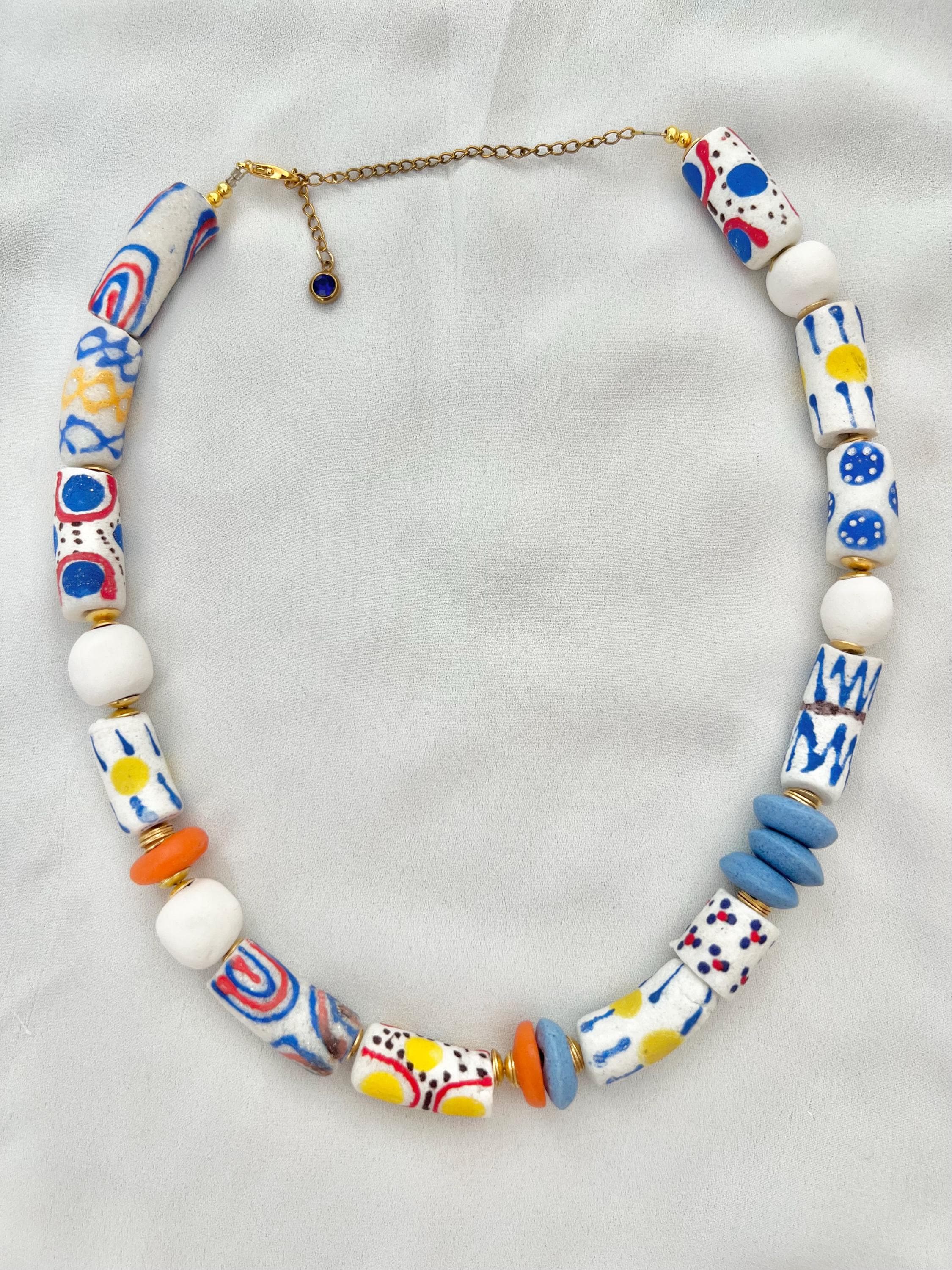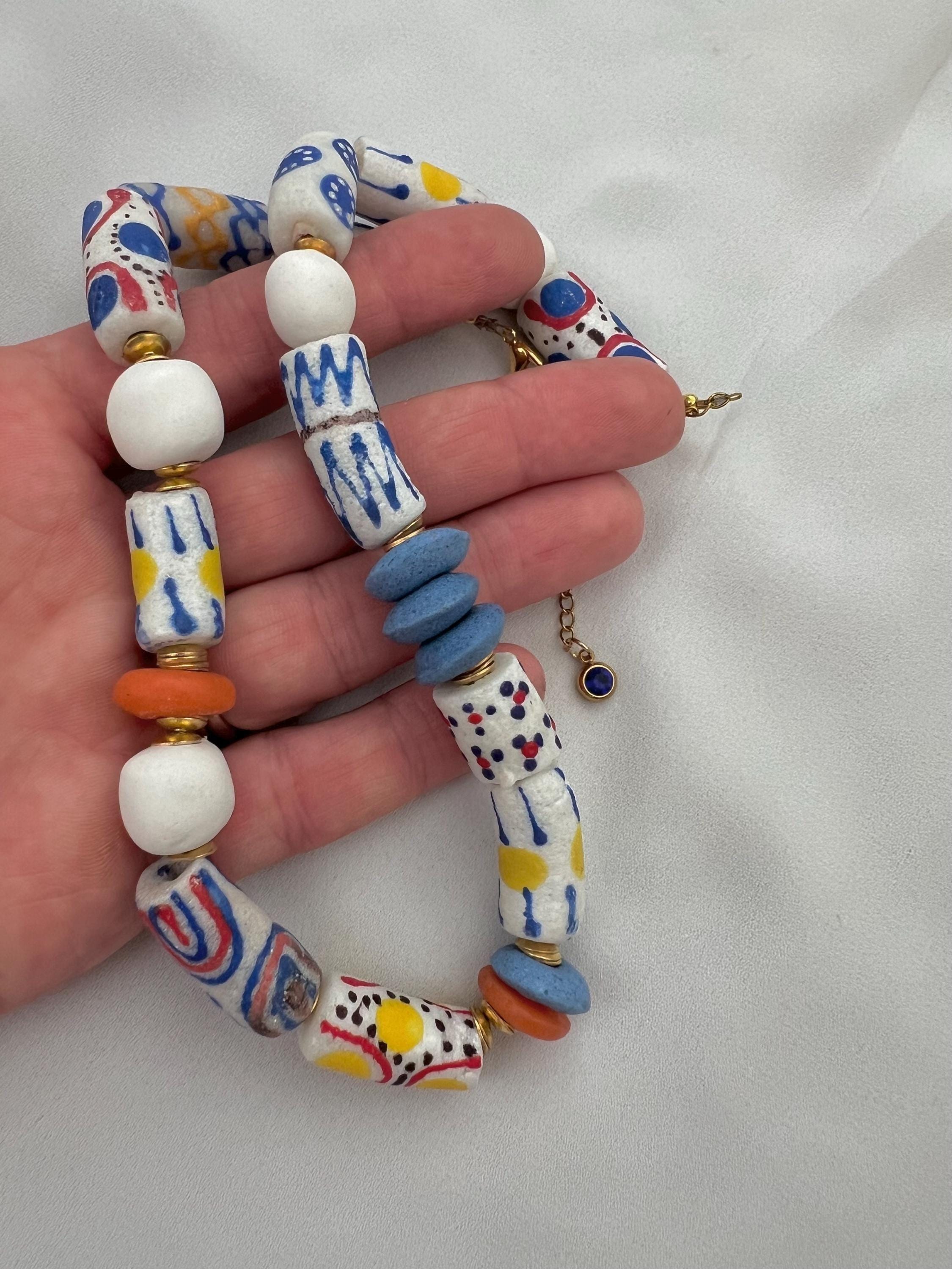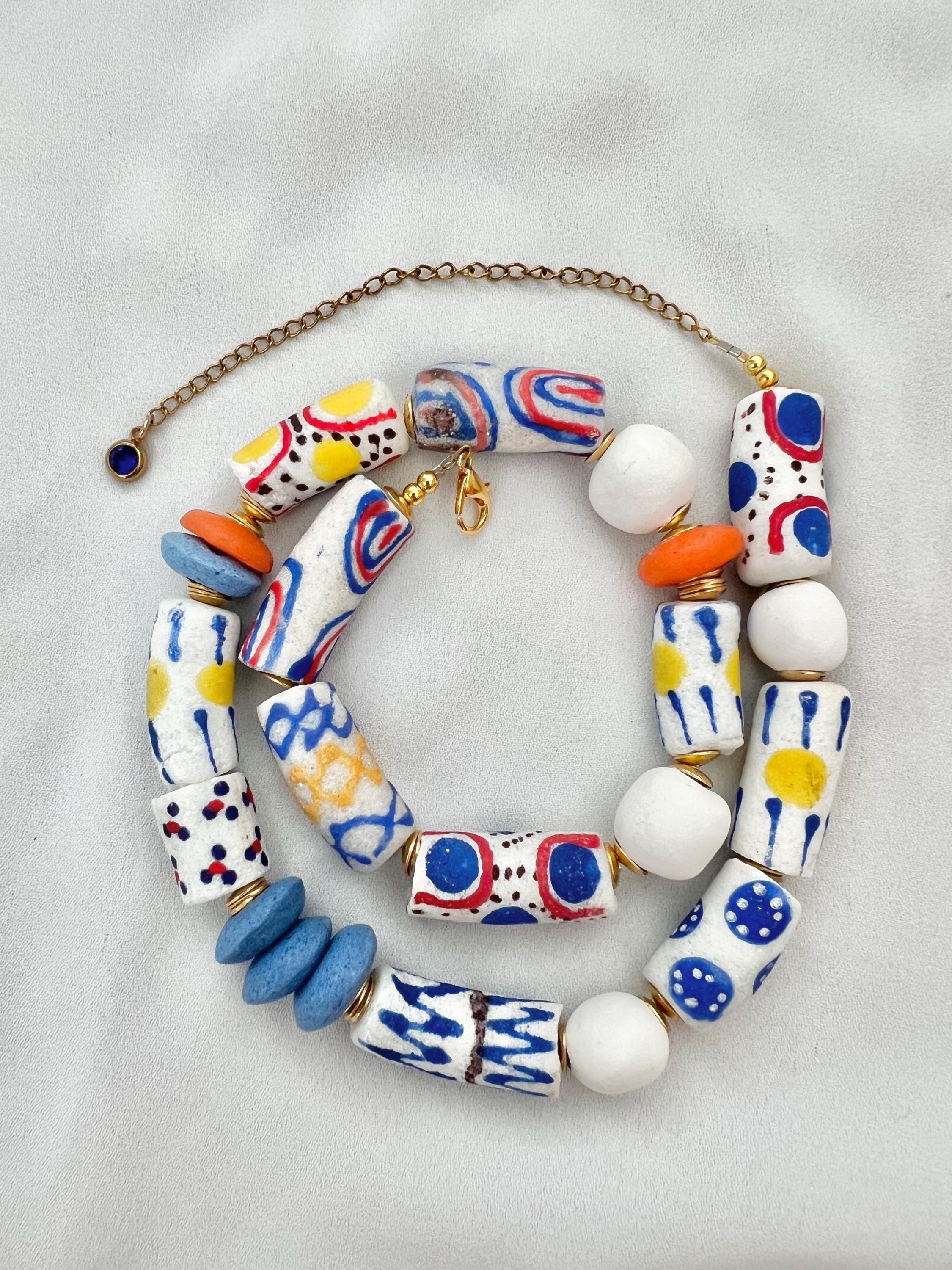 Recycled patterned tribal blue African glass bead Freshwater pearl gold necklace