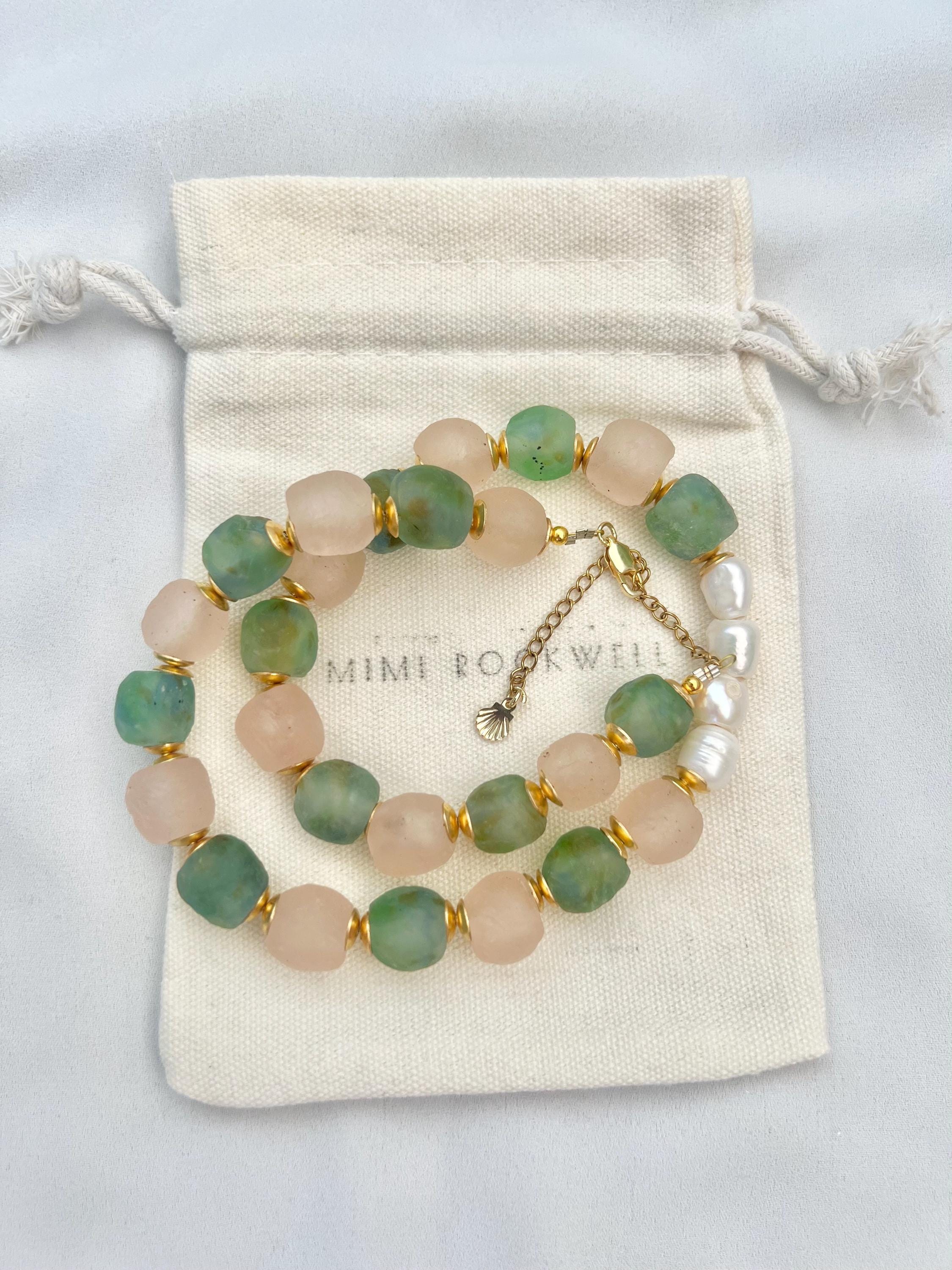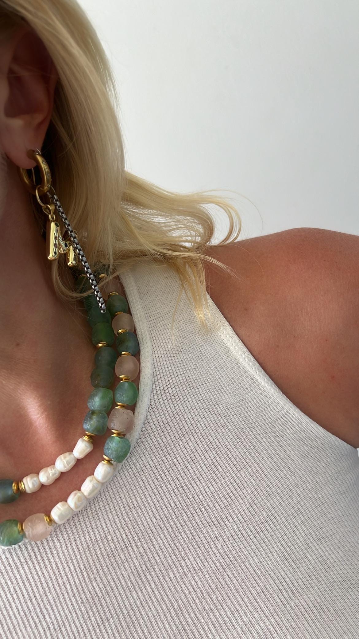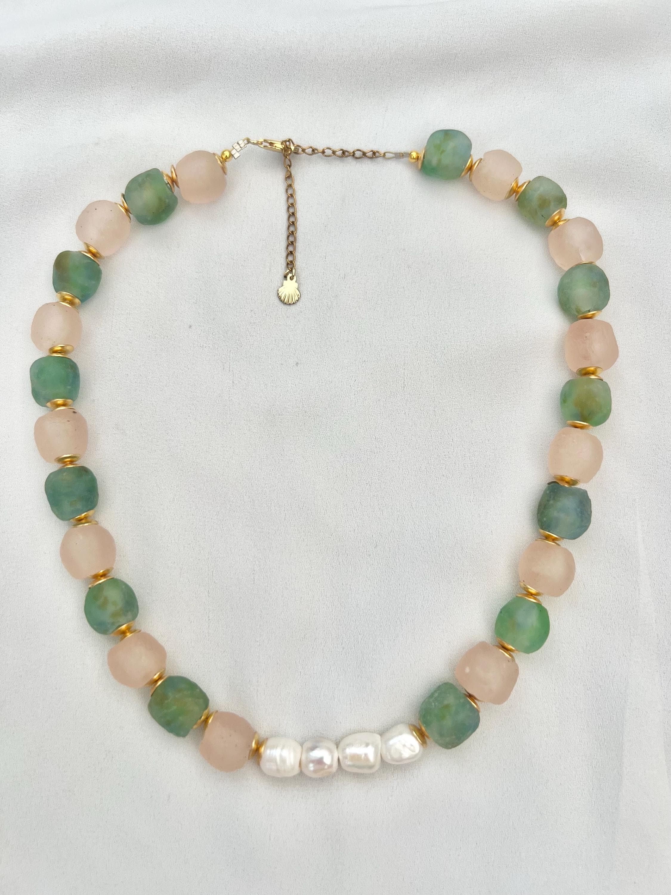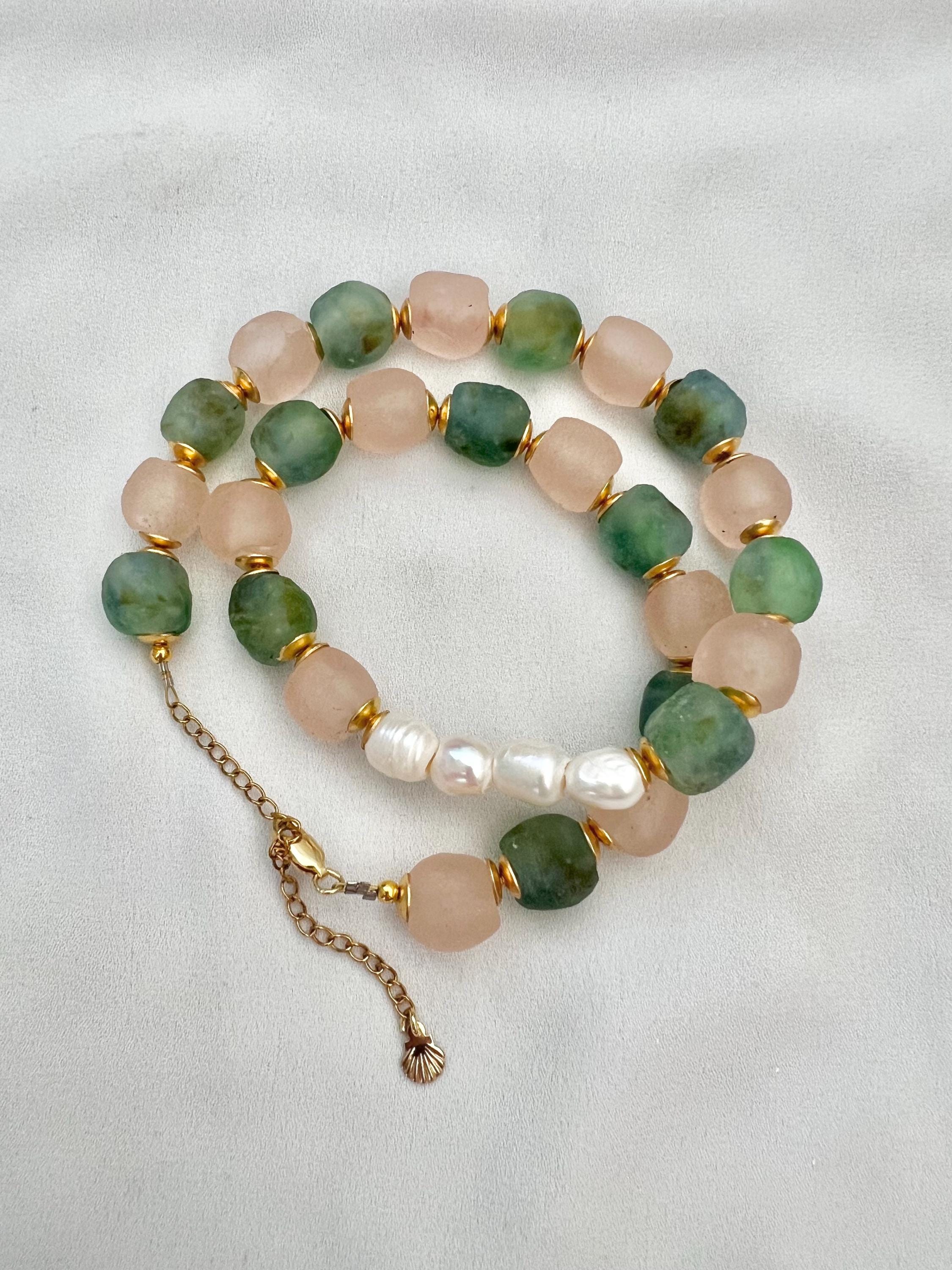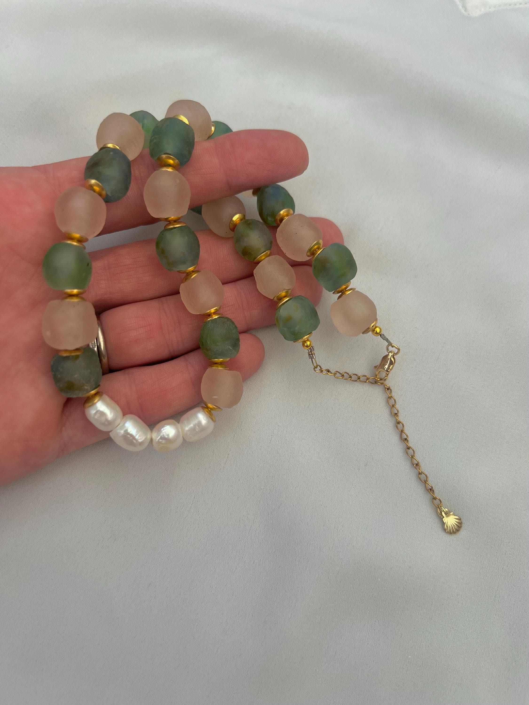 Recycled blue African glass bead Freshwater pearl gold necklace