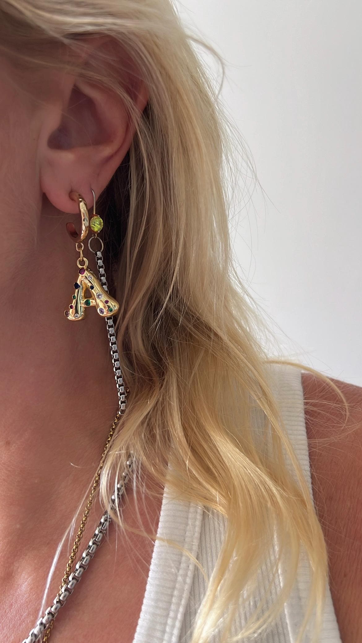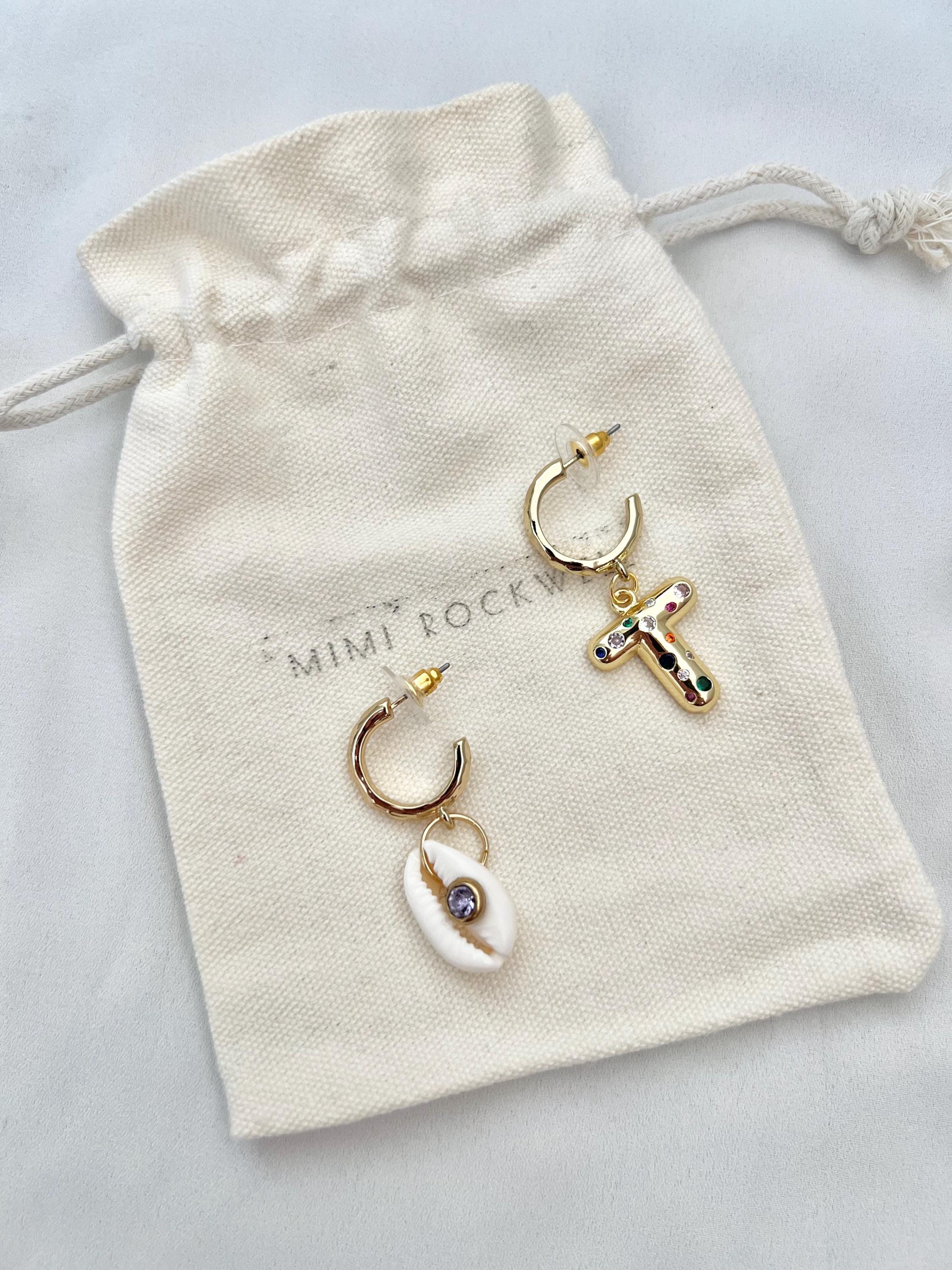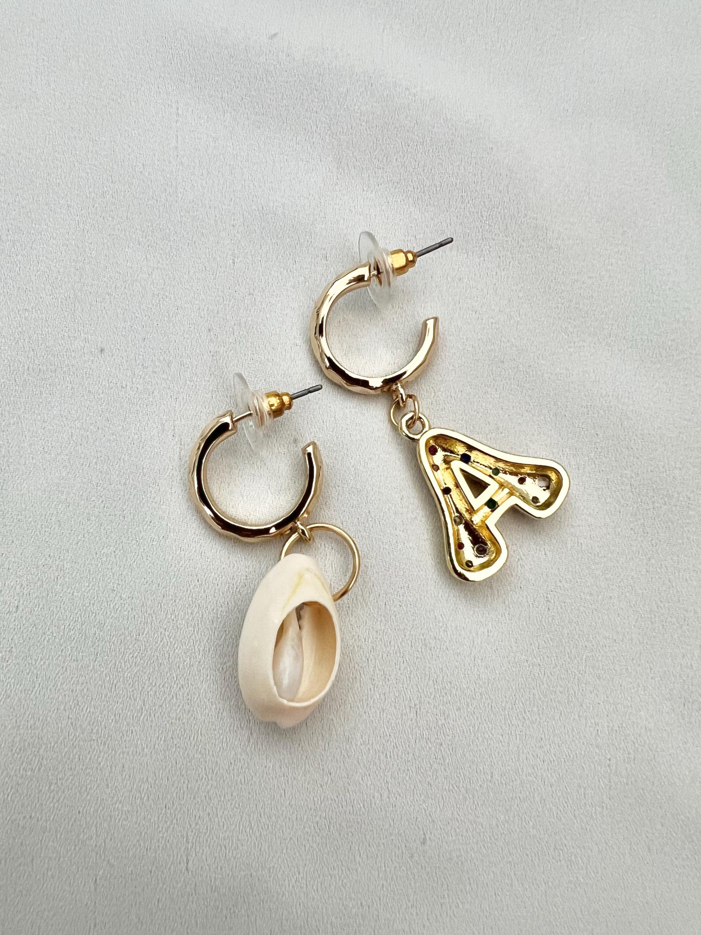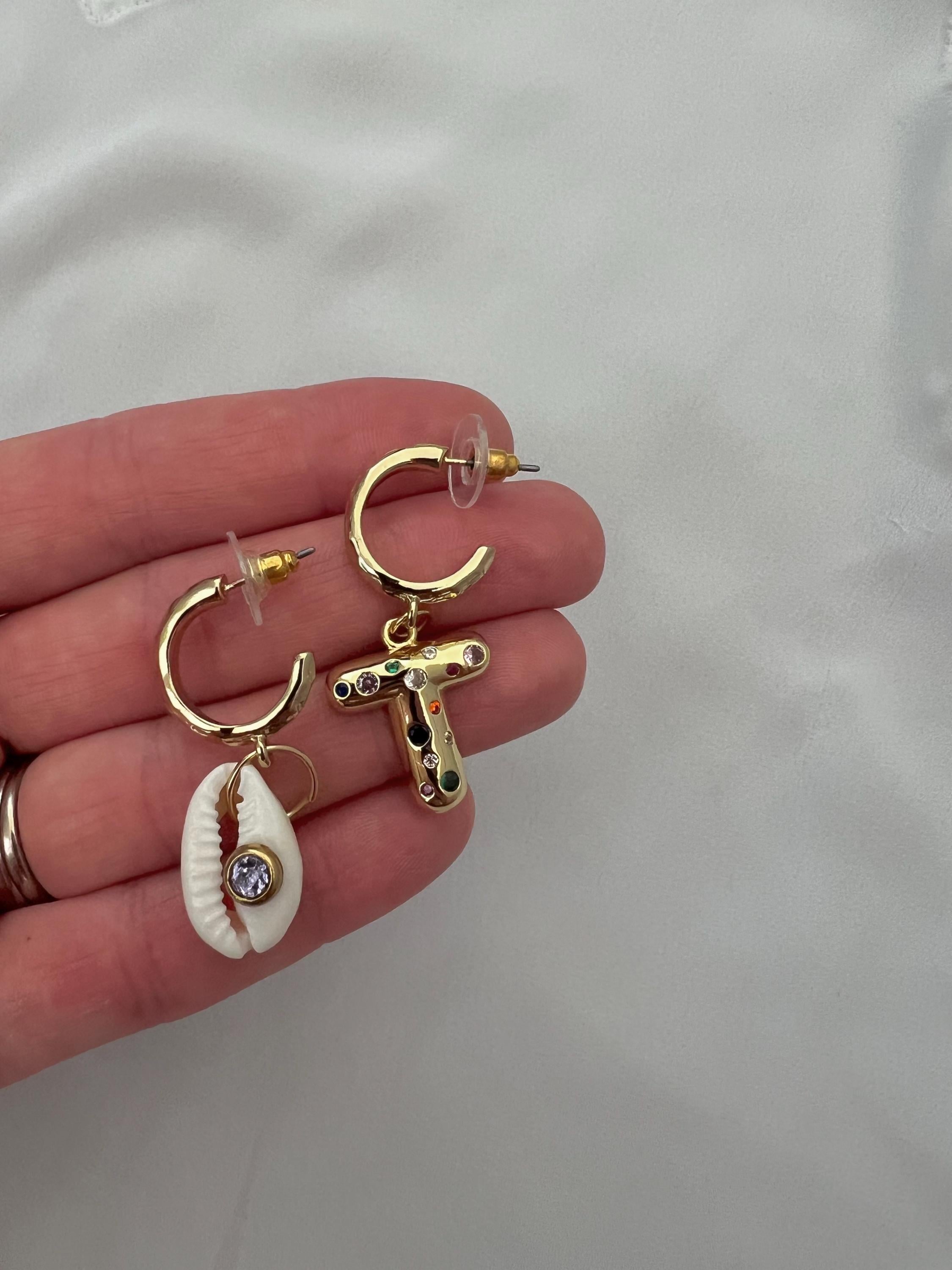 Mismatched bubble Zircon letter Shell gold hoop earrings